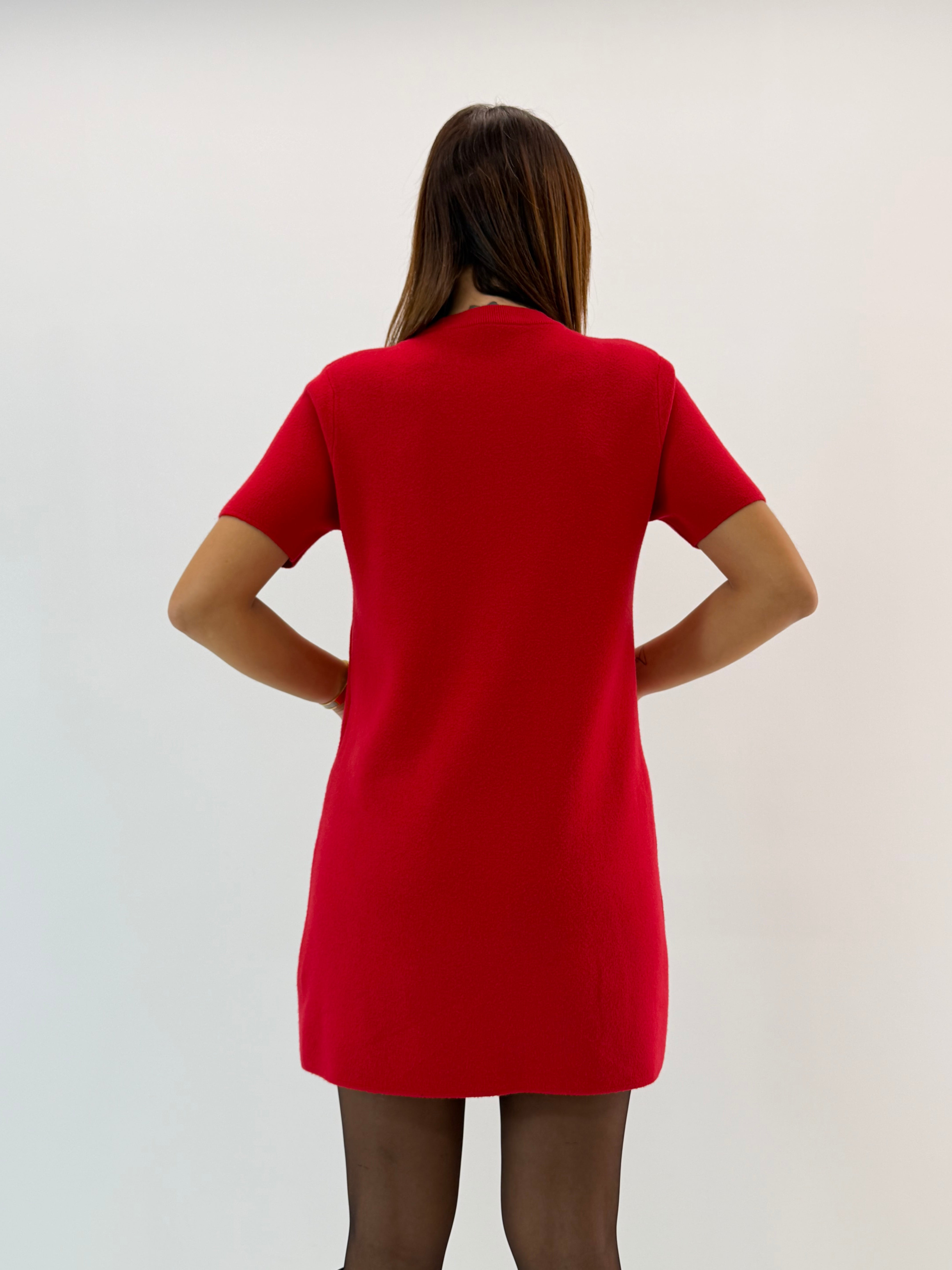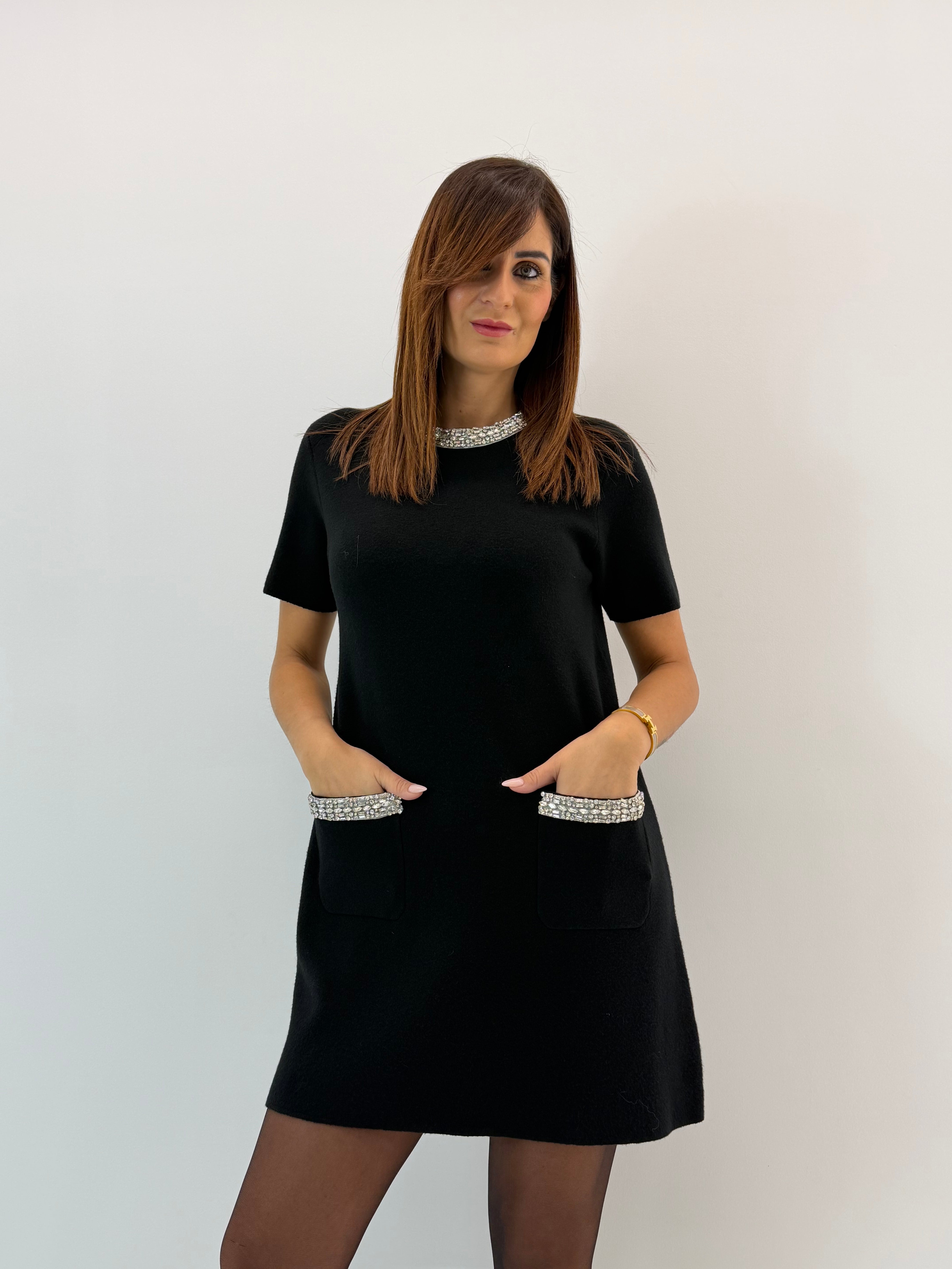 Abito maniche corte in morbida maglia misto viscosa, collo rotondo e tasche sul davanti con applicazione di swarovski.