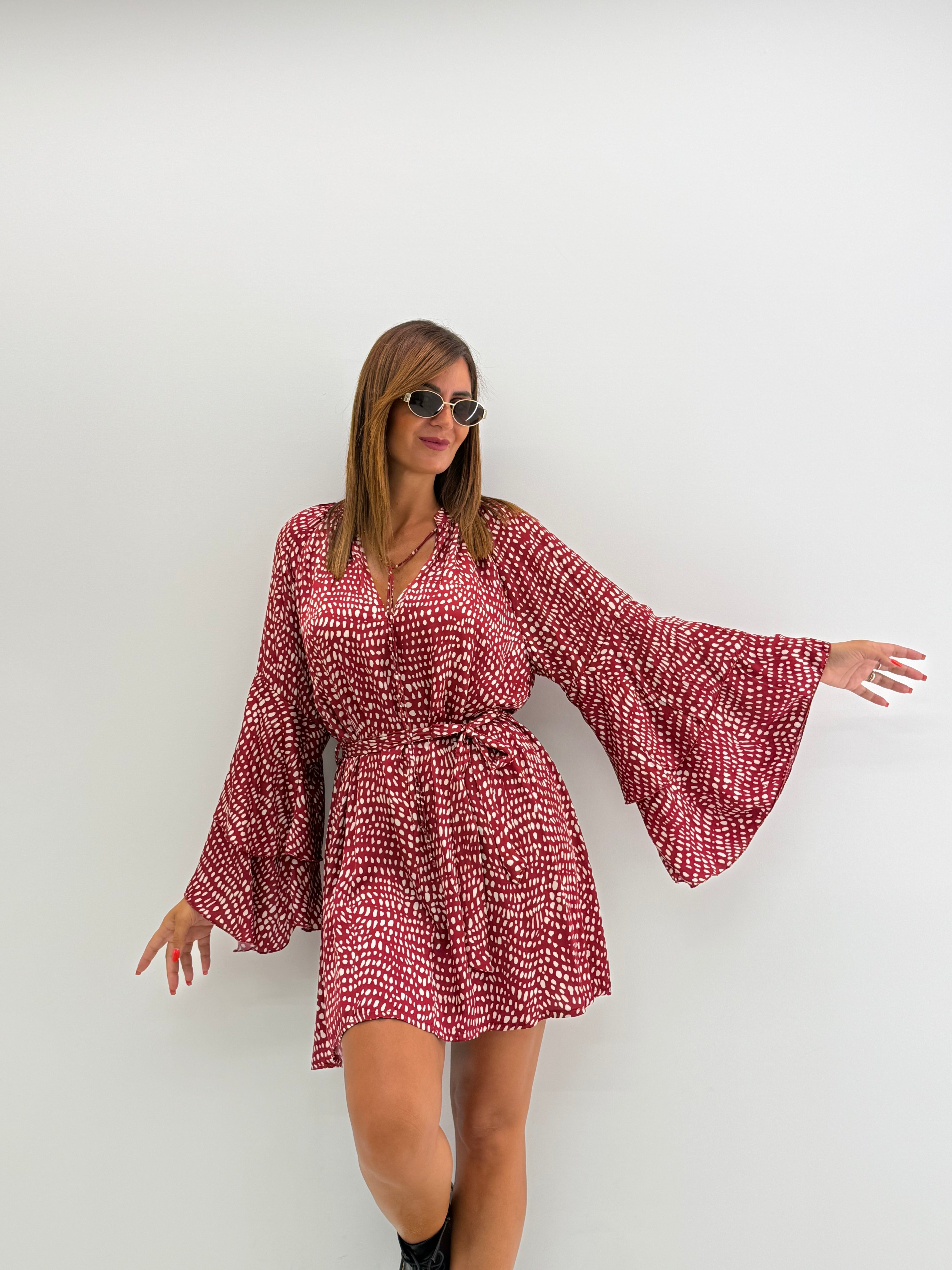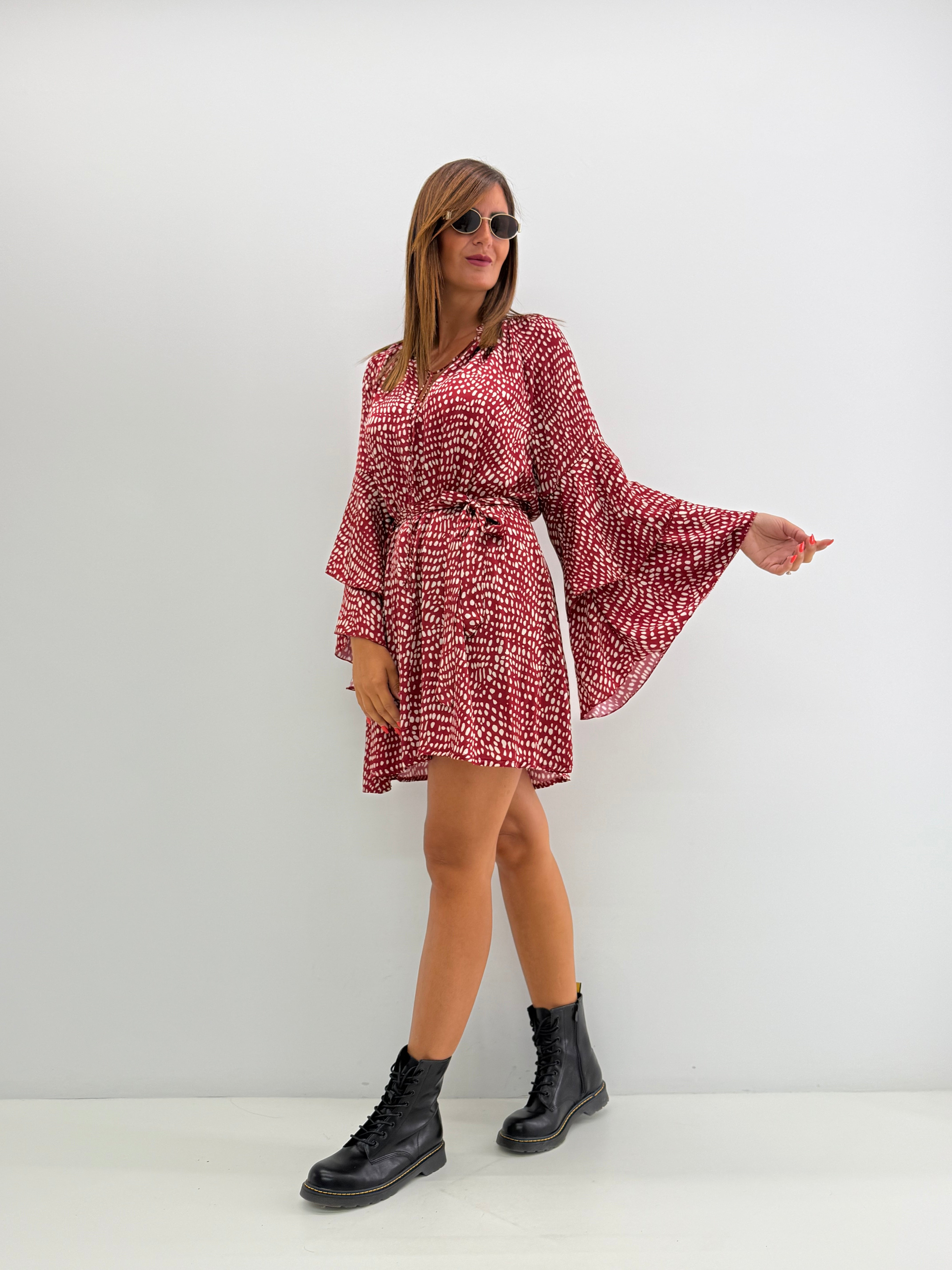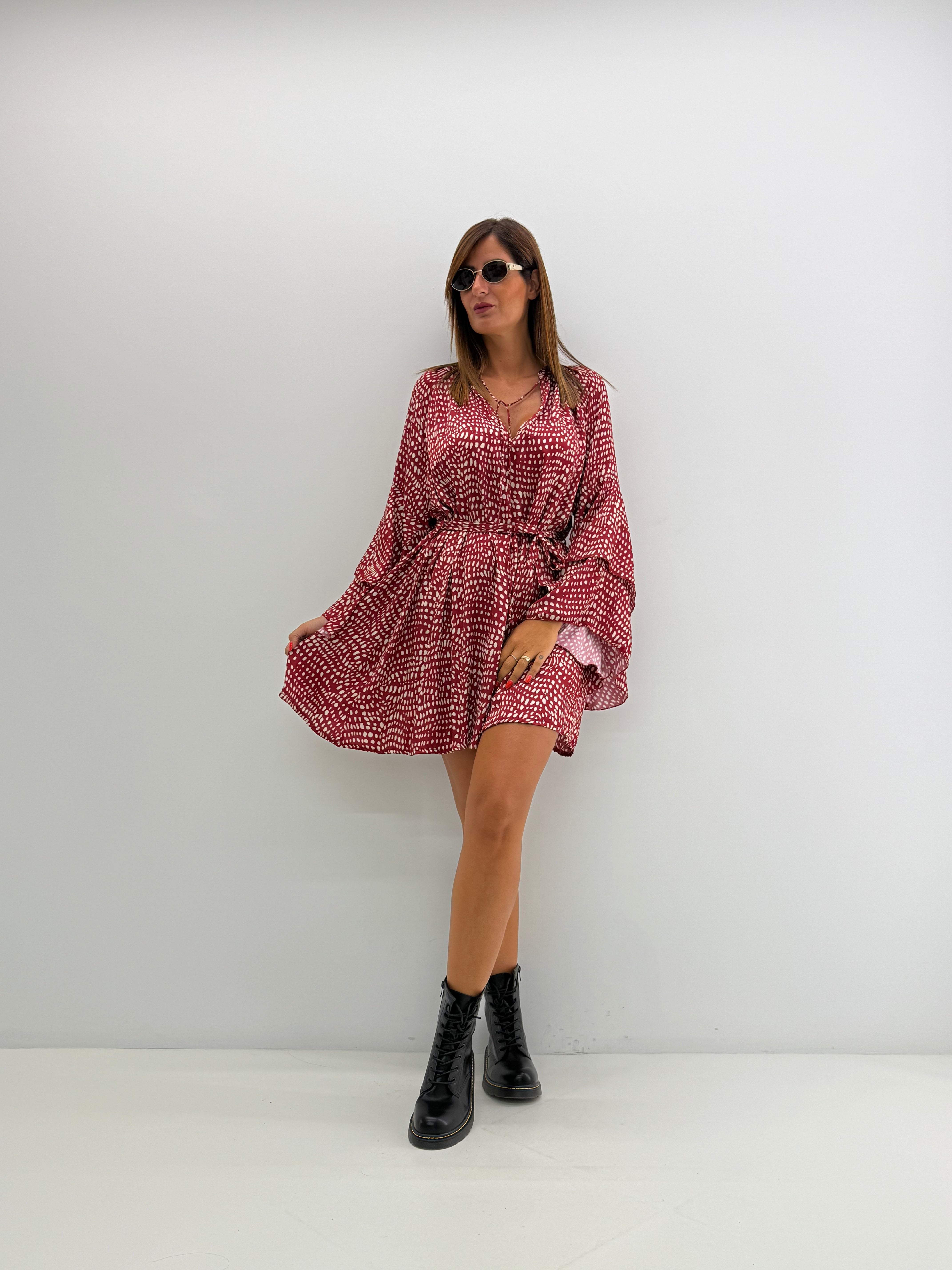 Abito in viscosa, fondo bordeaux e fantasia a pois panna, manica lunga ampia, scollo a V e laccetti, passanti per cintura e cinturino in vita.