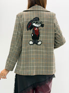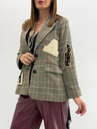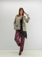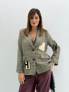 Blazer in fantasia, foderato all'interno, colletto revers. Tasche davanti con patte, retro semplice. Spalline imbottite.