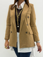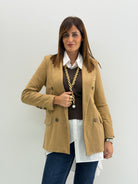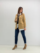 Blazer over doppiopetto, effetto scamosciato, foderato all'interno, colletto revers. Maniche lunghe con finti bottoncini sul polsino, chiusura con bottoni davanti. Finte tasche davanti con patte, finta tasca a filetto nella parte superiore sinistra, retro semplice. Vestibilità a taglie.