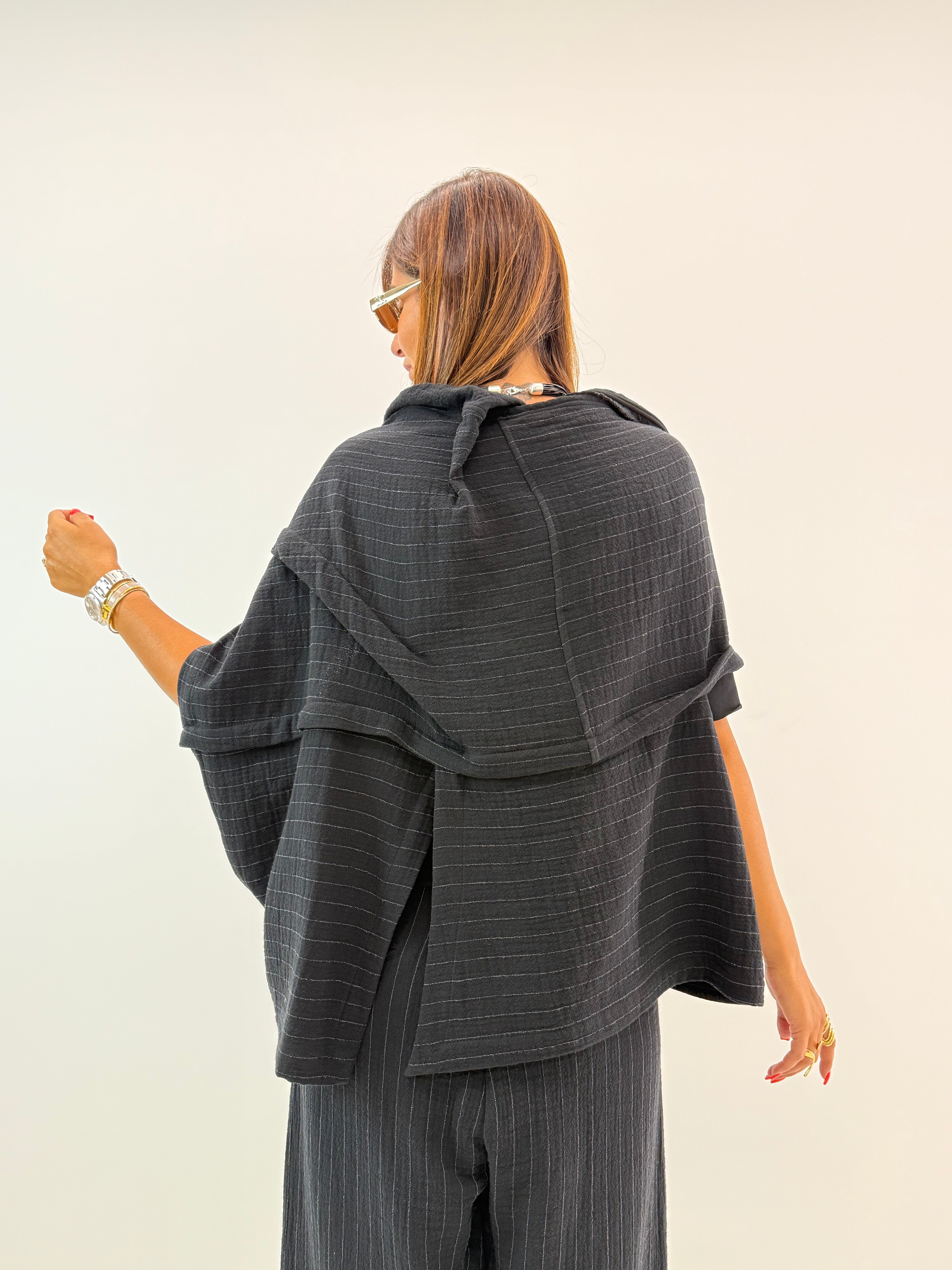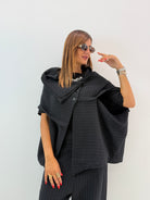 Giacca asimmetrica, garzata in tessuto gessato misto cotone. Chiusura con bottoncini trasversali davanti, ampio spacco davanti e dietro. Dettaglio cuciture sul retro. Vestibilità ampia e comoda.
