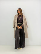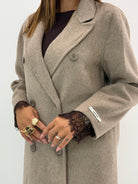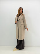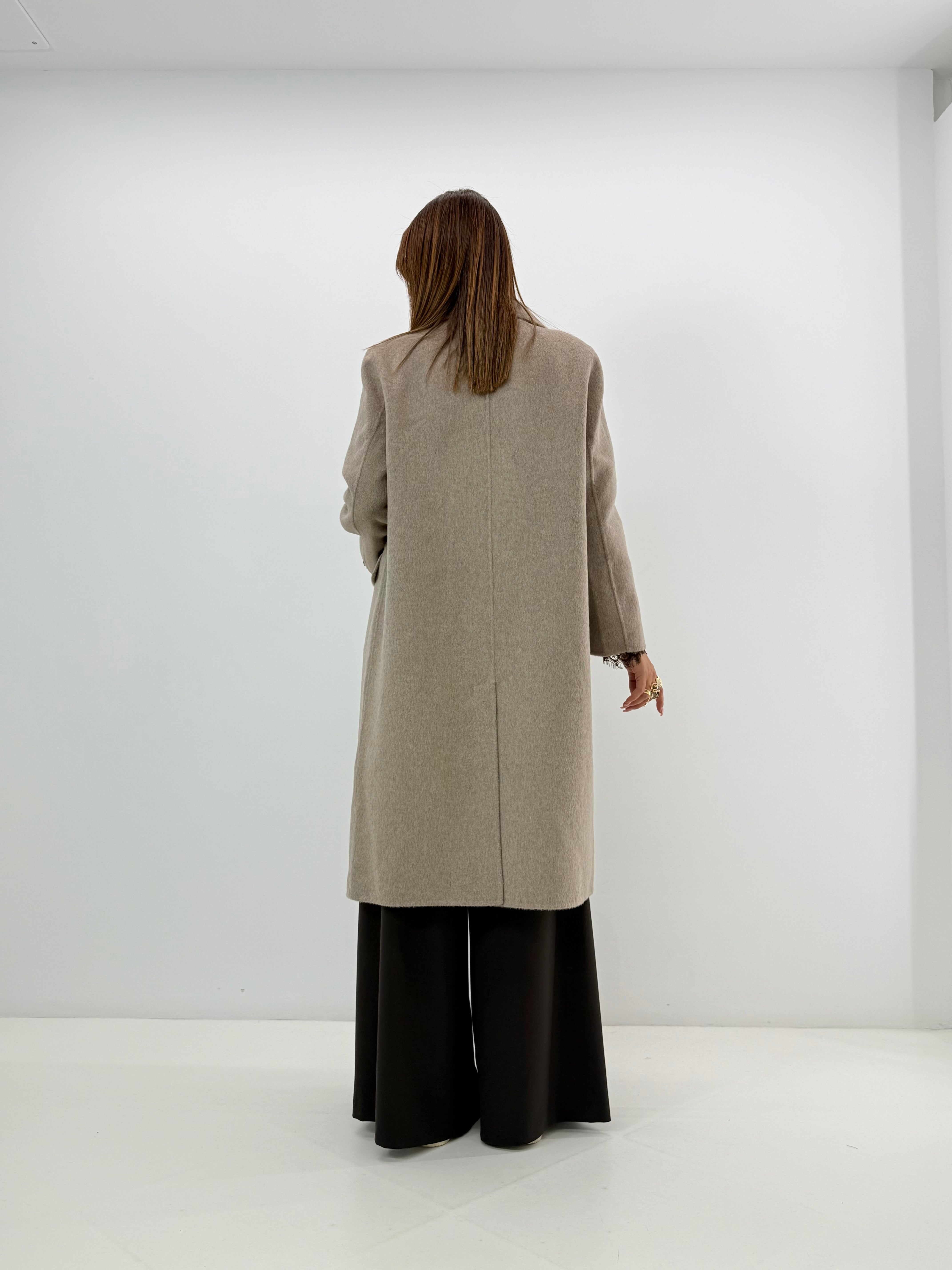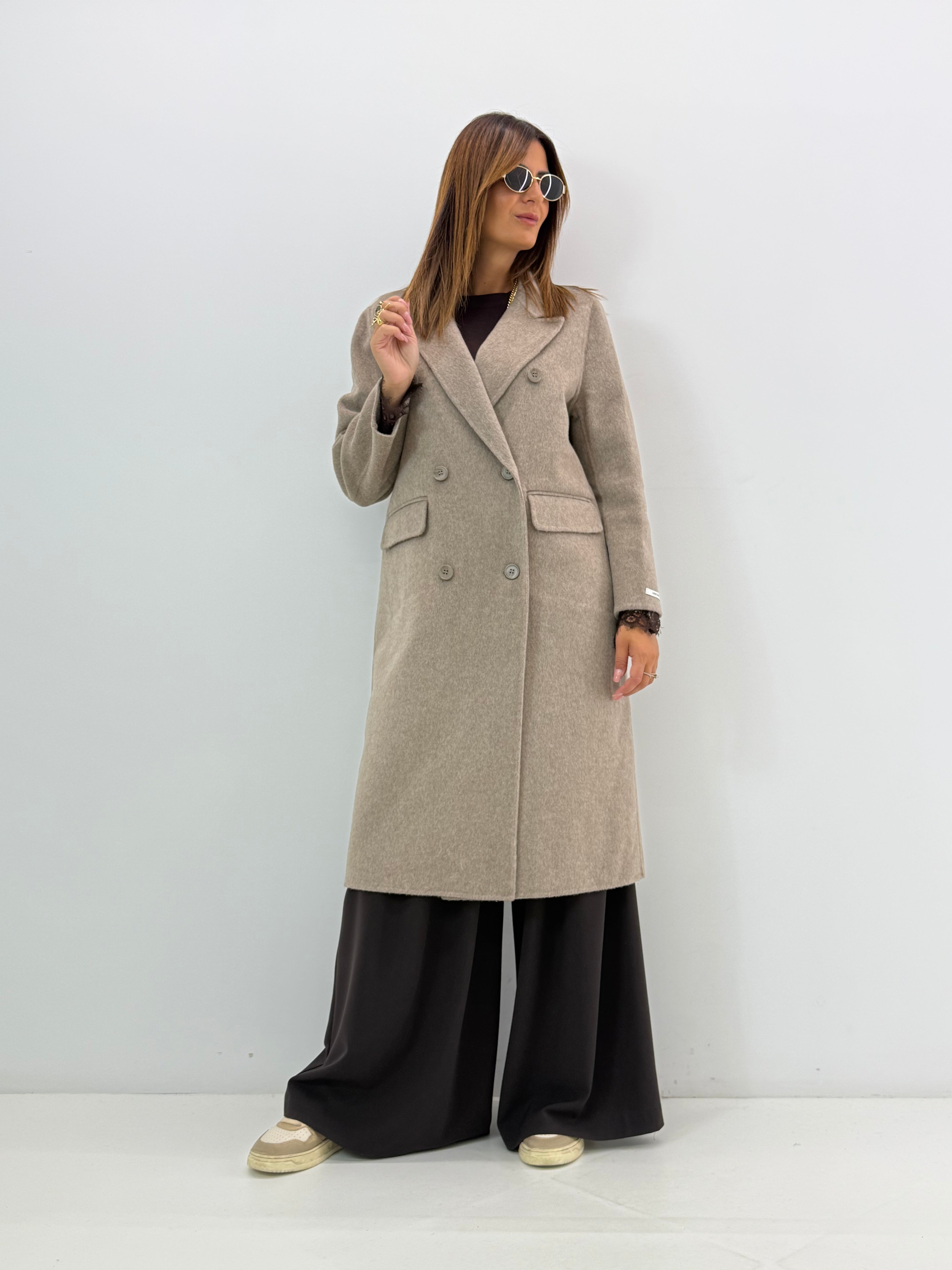 Cappotto a doppiopetto con colletto revers. Tasche davanti con patta. Chiusura con bottoni davanti. Spacco centrale sul fondo dietro
