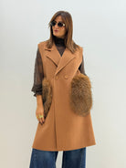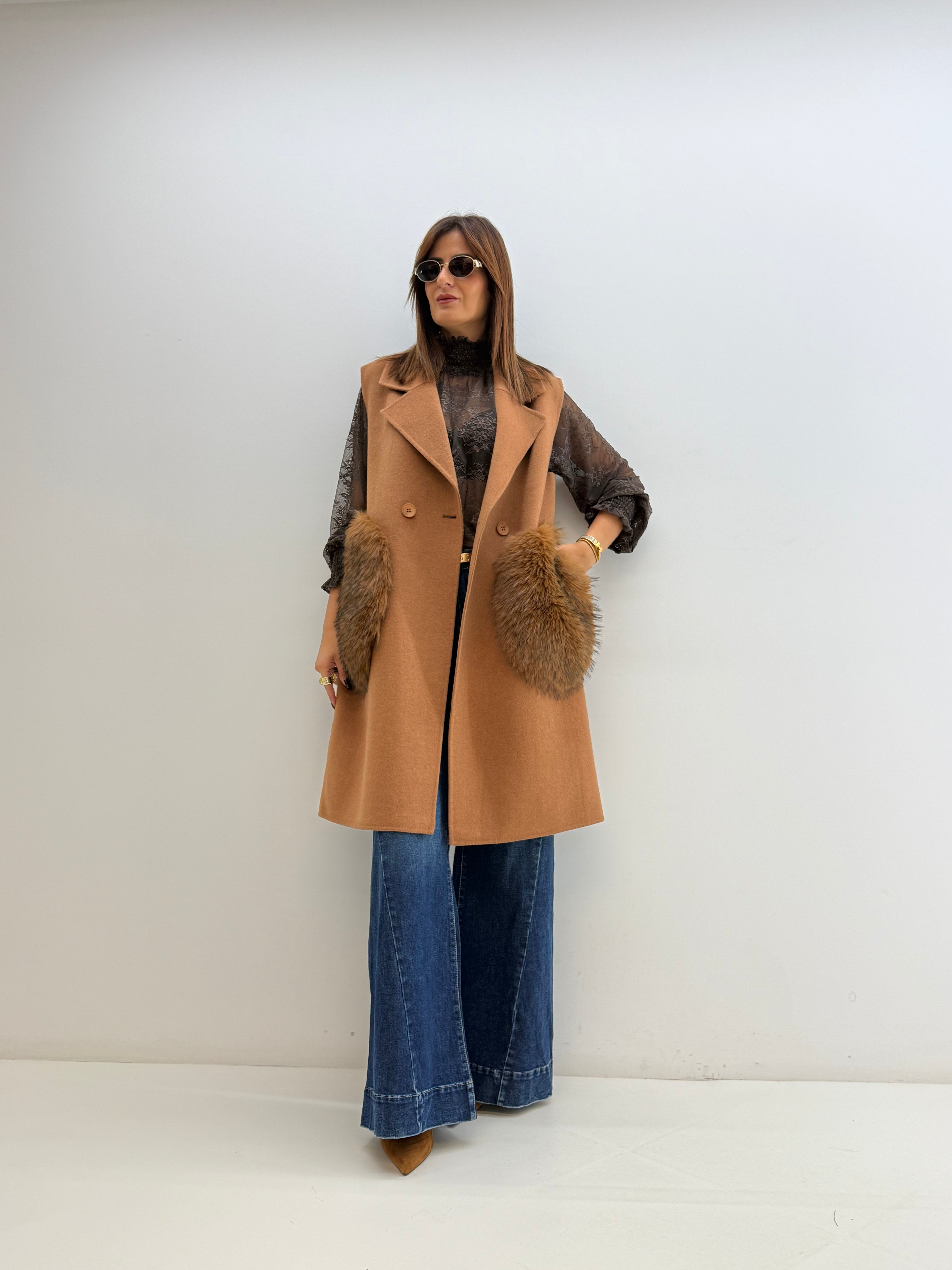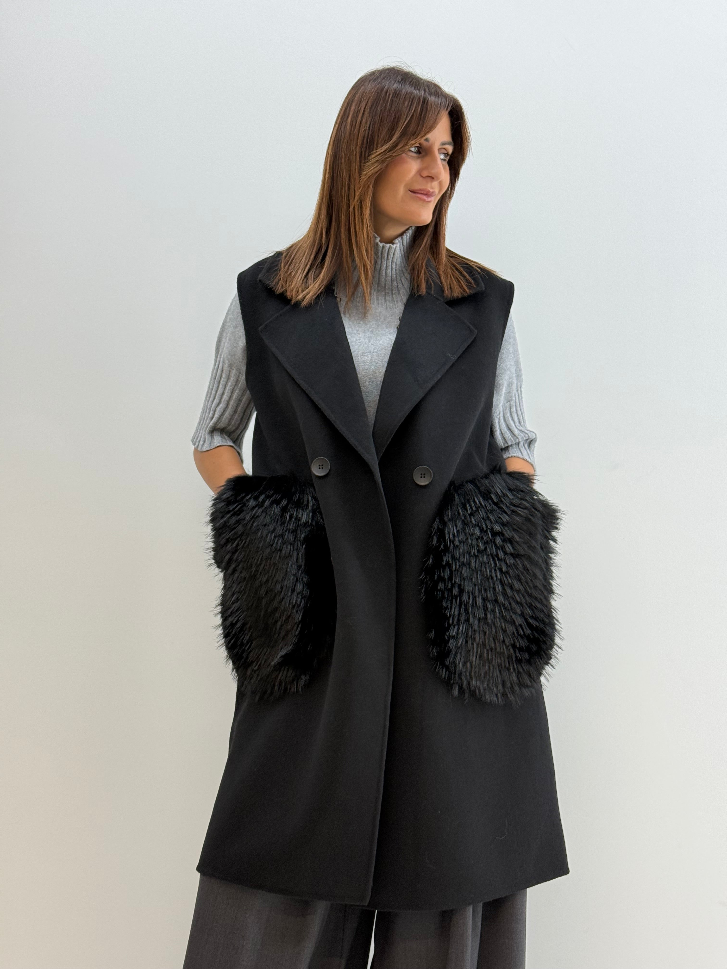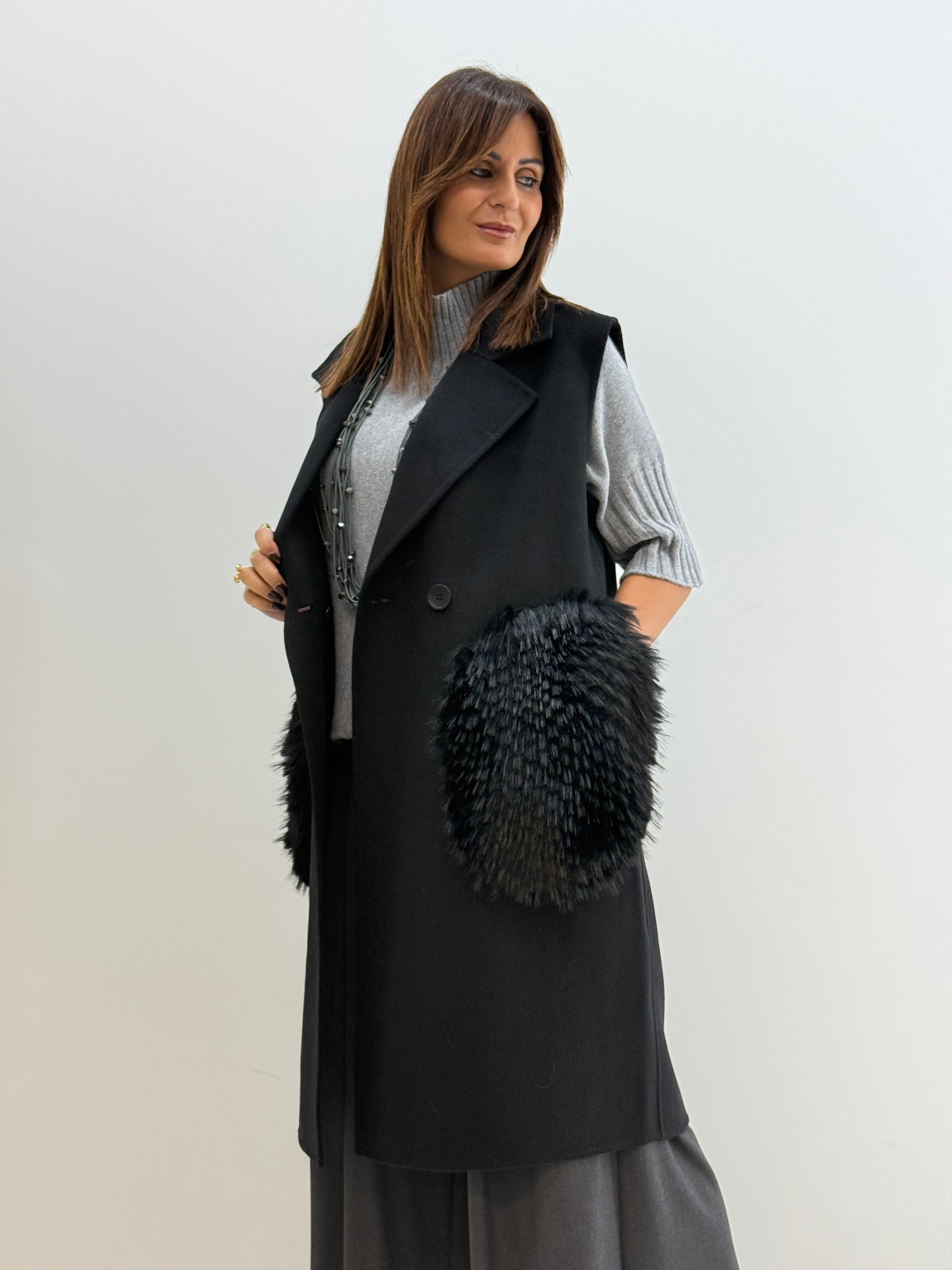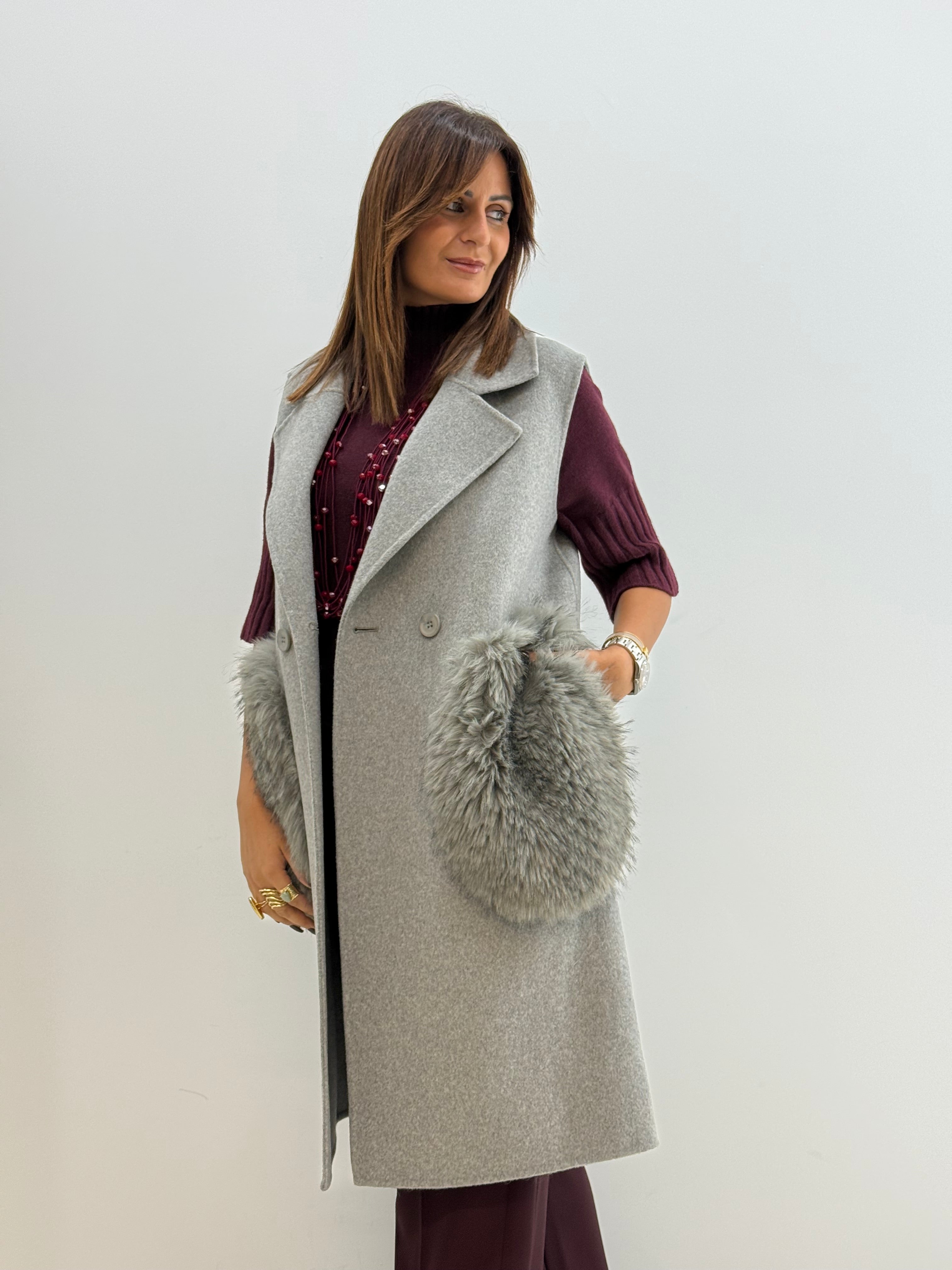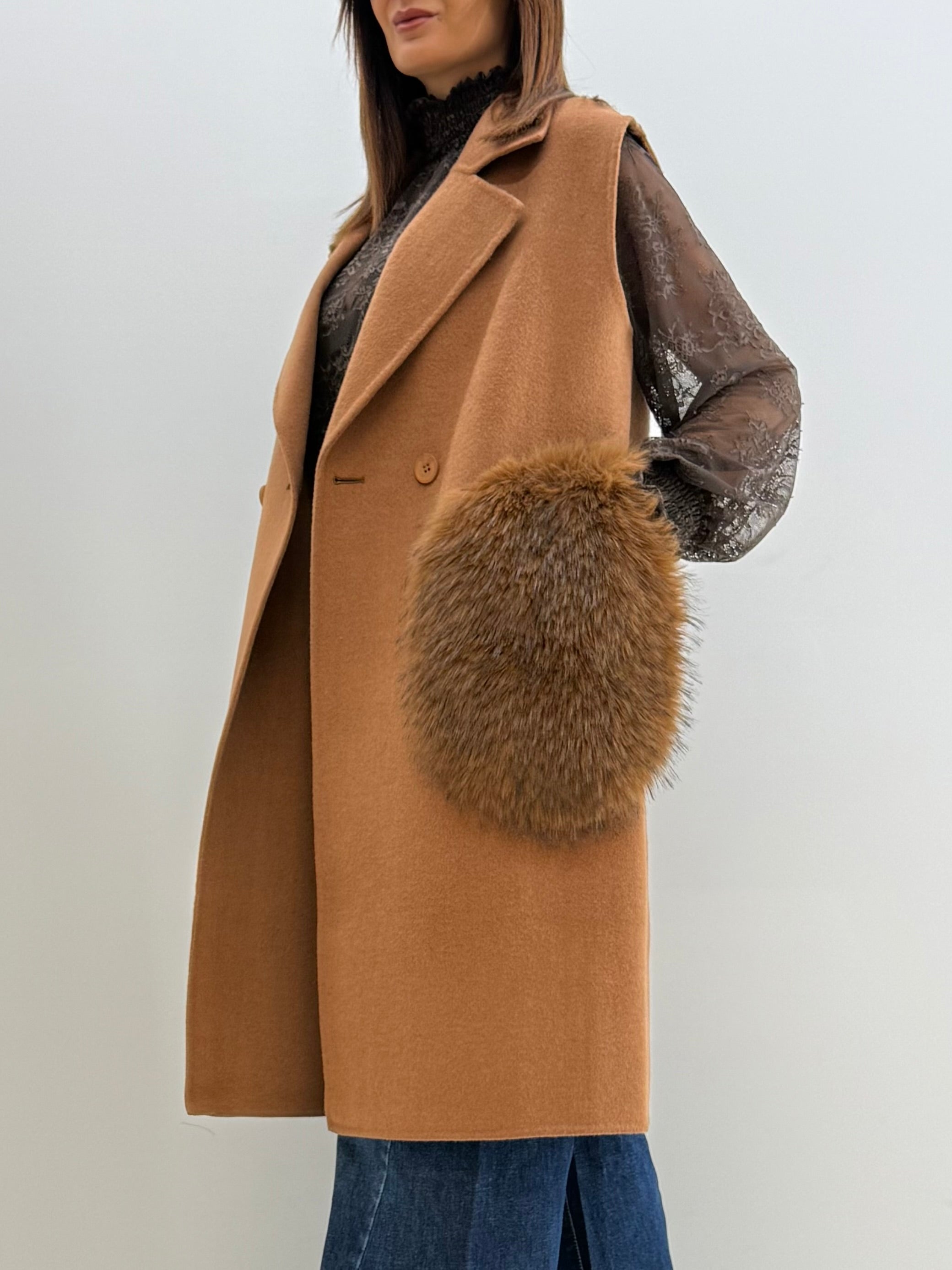 Cappotto smanicato a doppiopetto con colletto revers. Chiusura con bottoni davanti. Tasche con applicazione di pelliccetta.