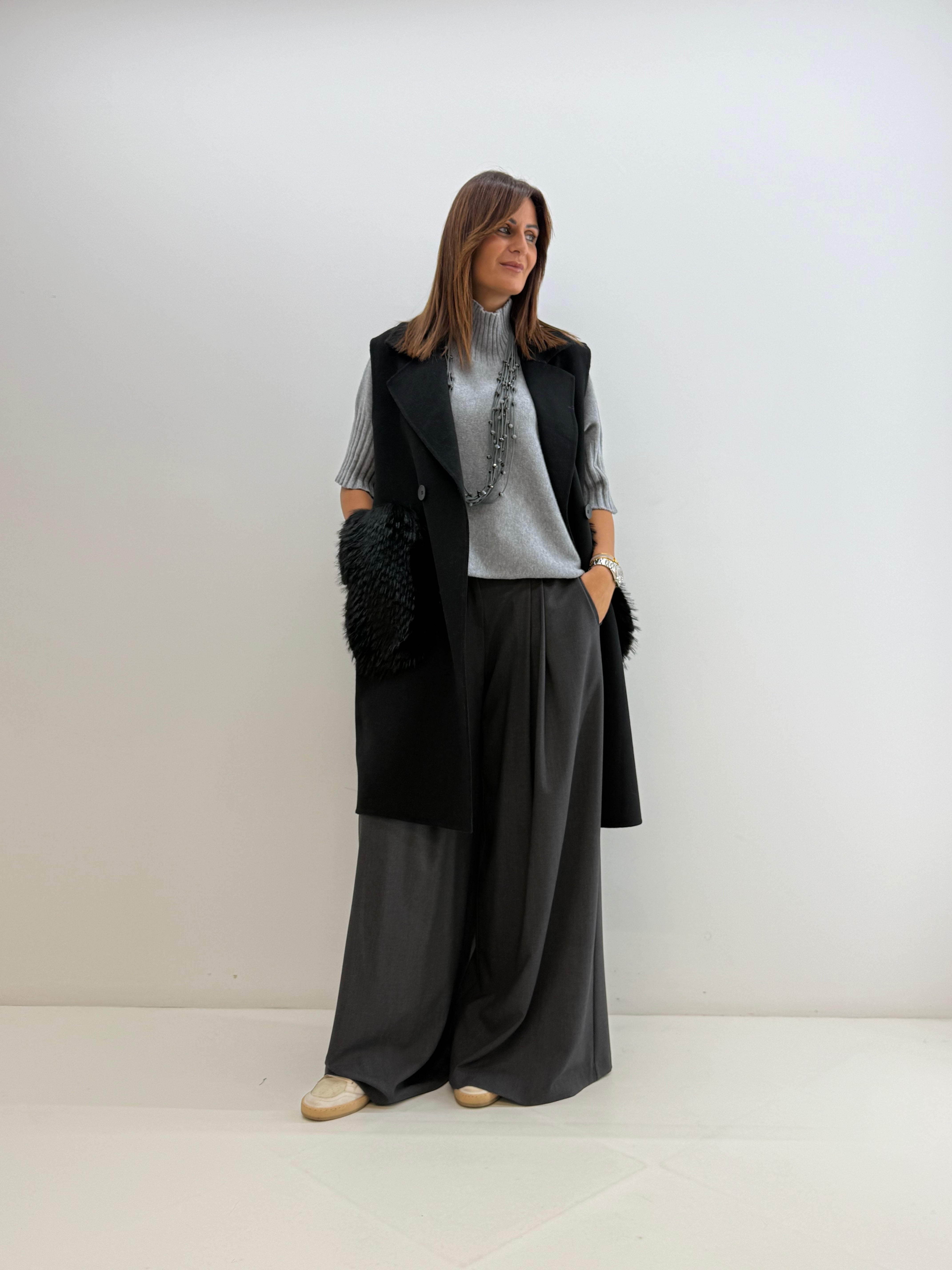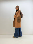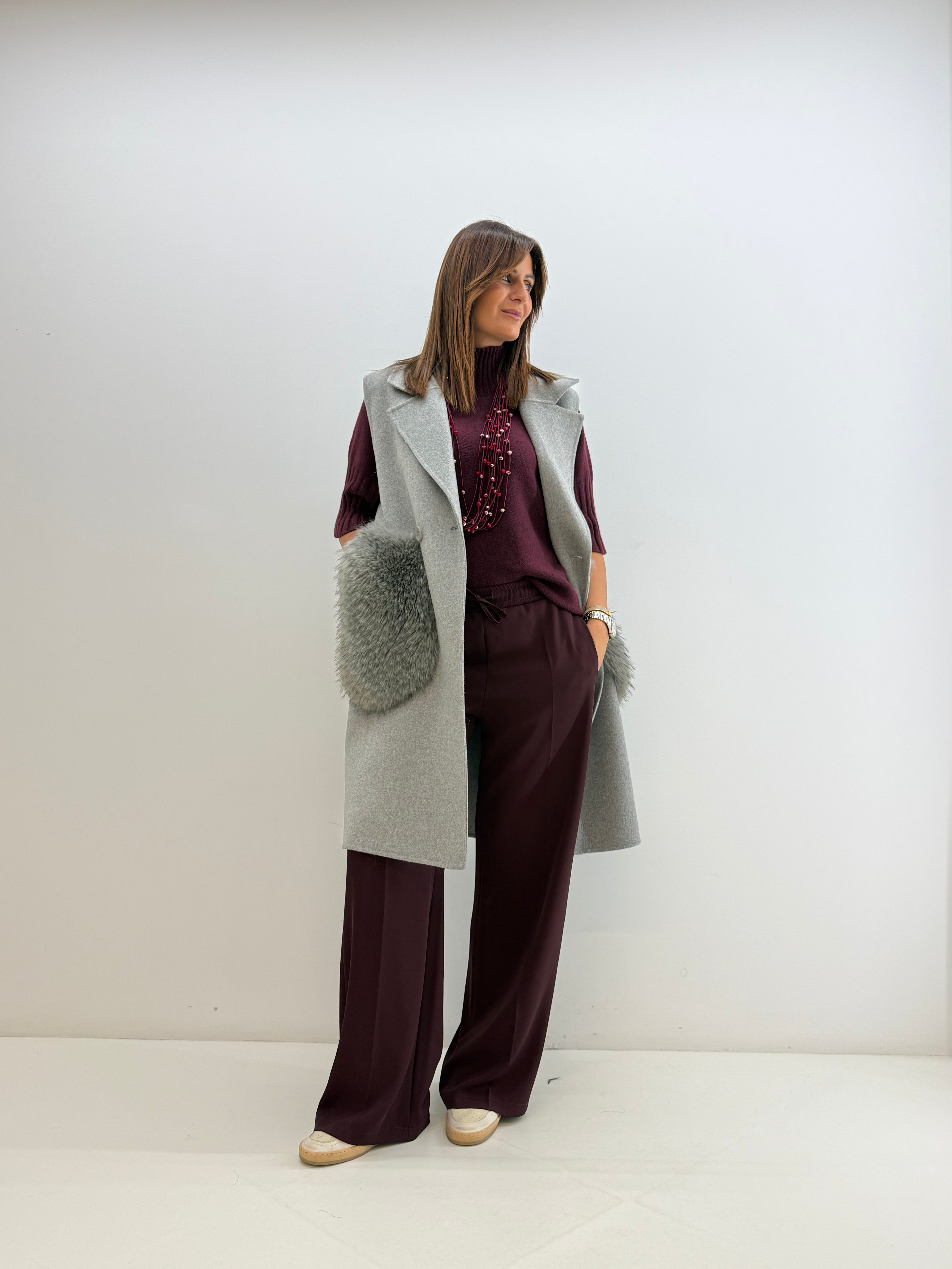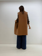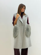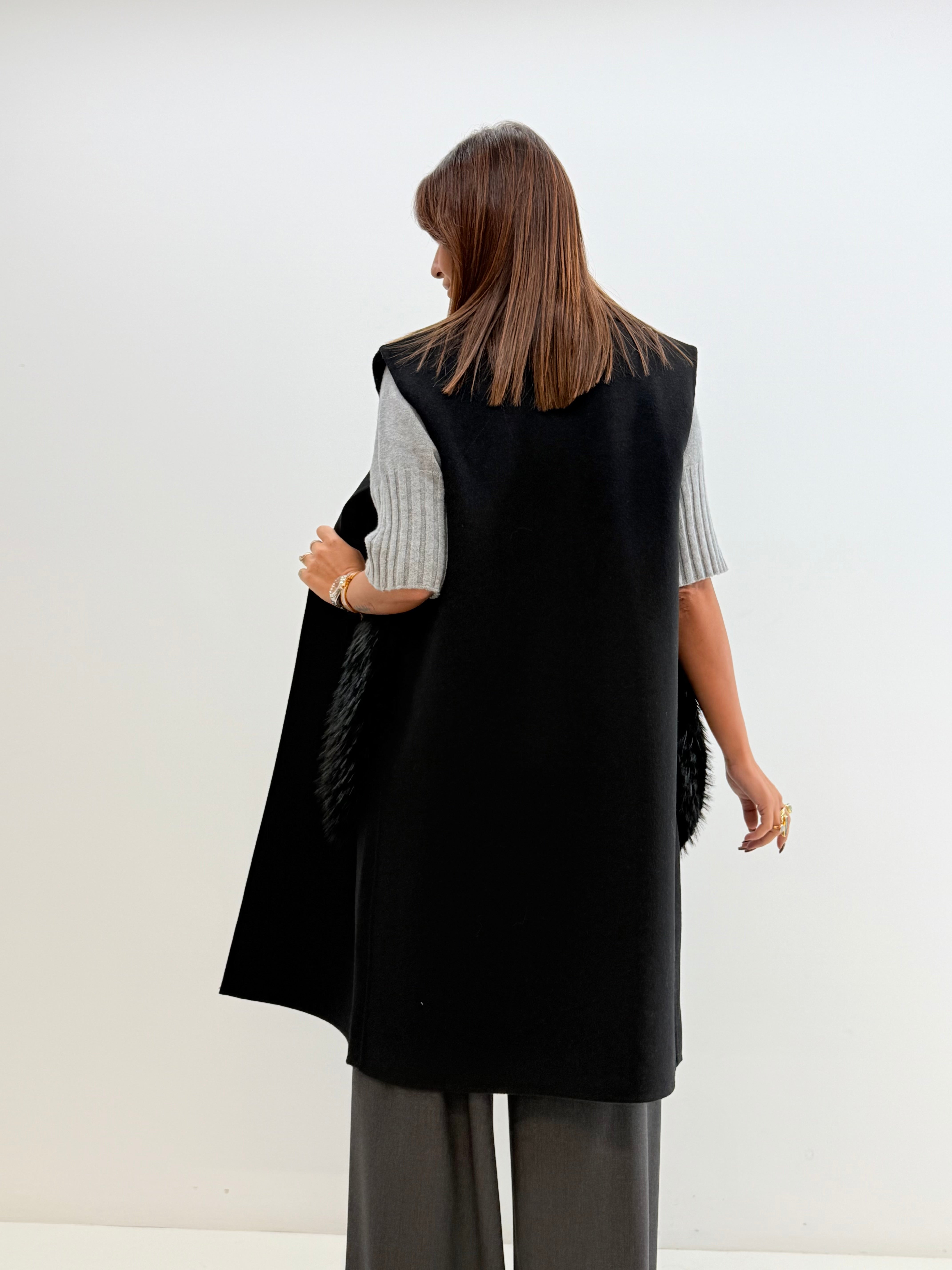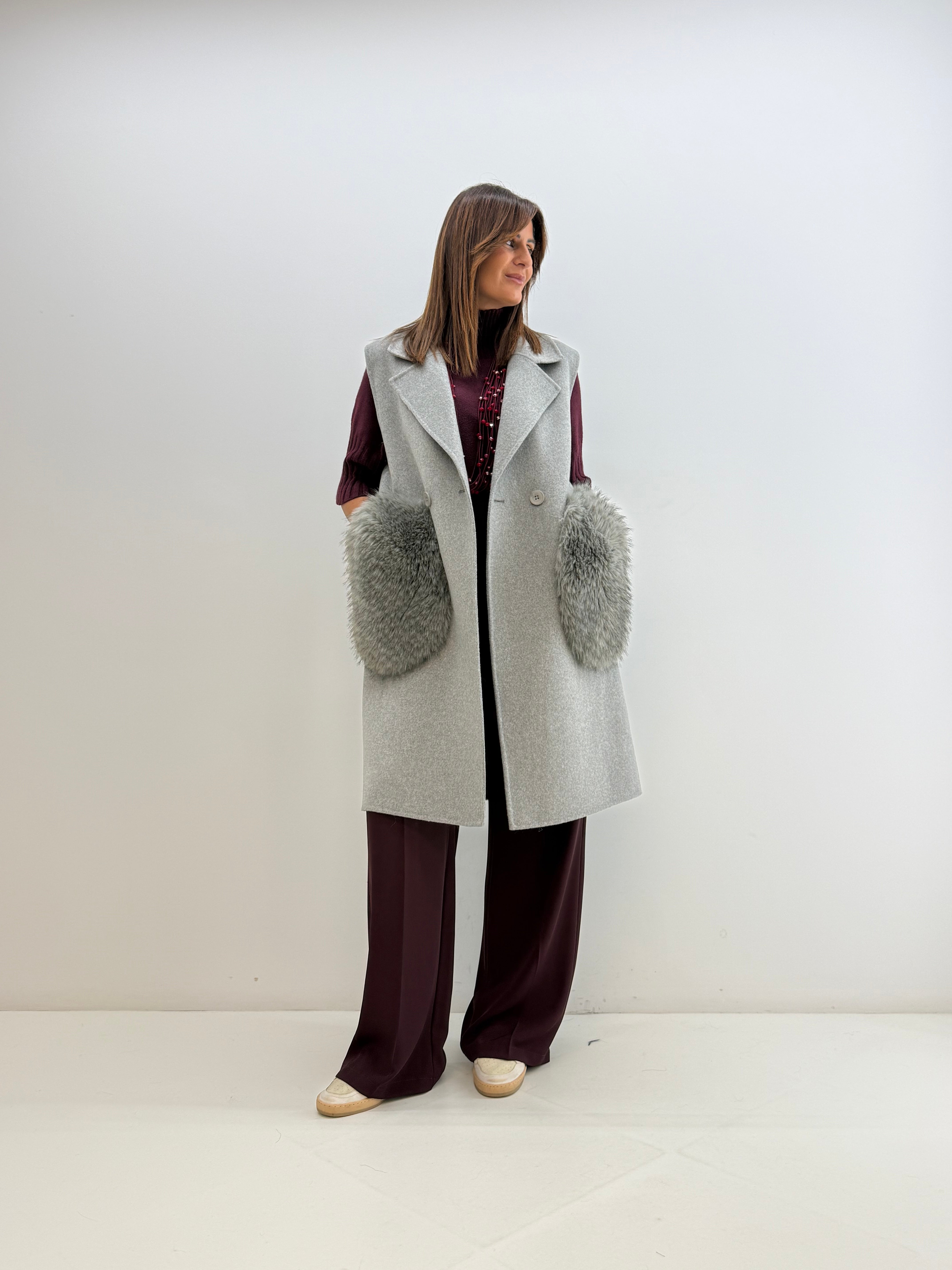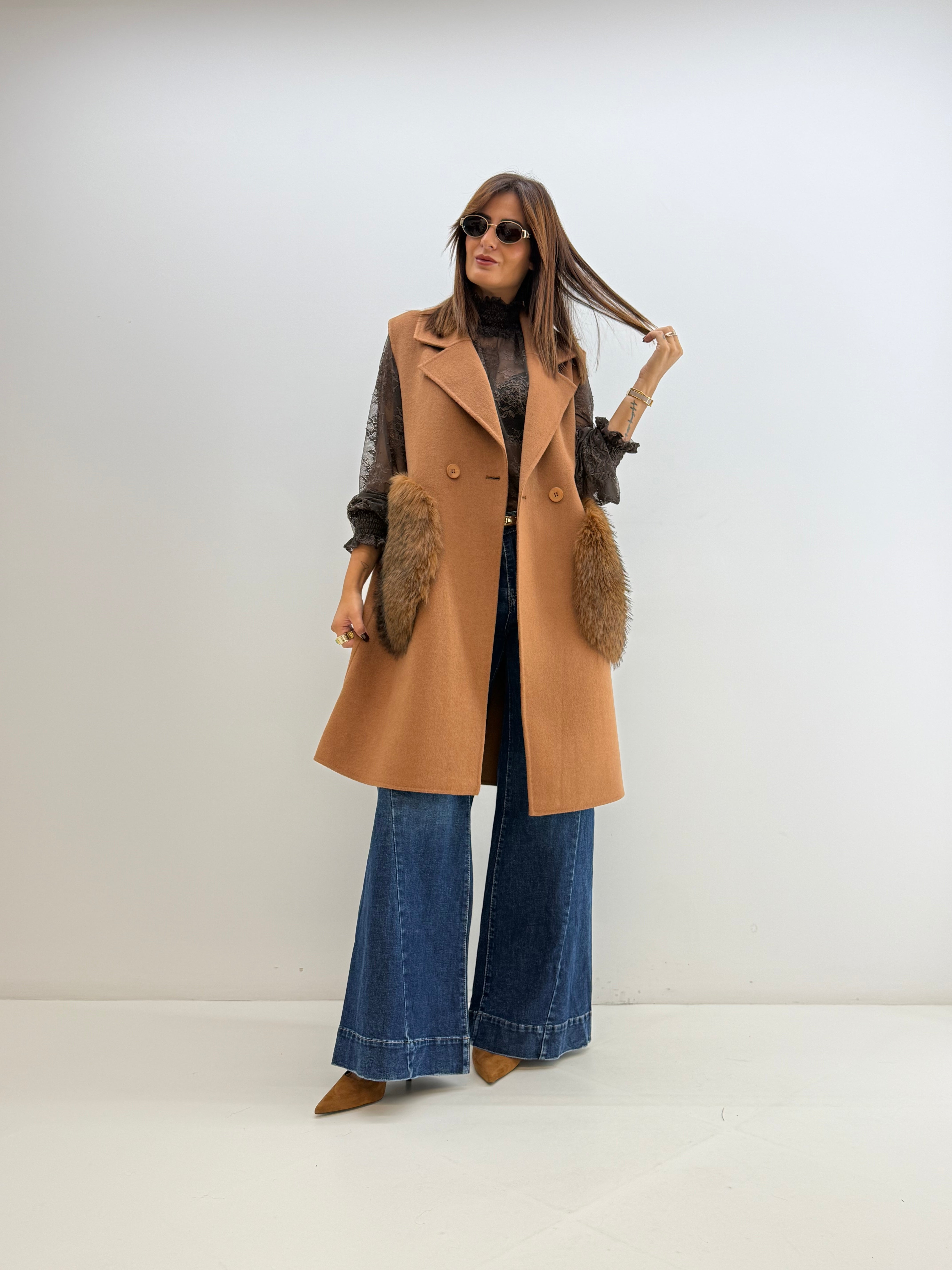Cappotto smanicato a doppiopetto con colletto revers. Chiusura con bottoni davanti. Tasche con applicazione di pelliccetta.