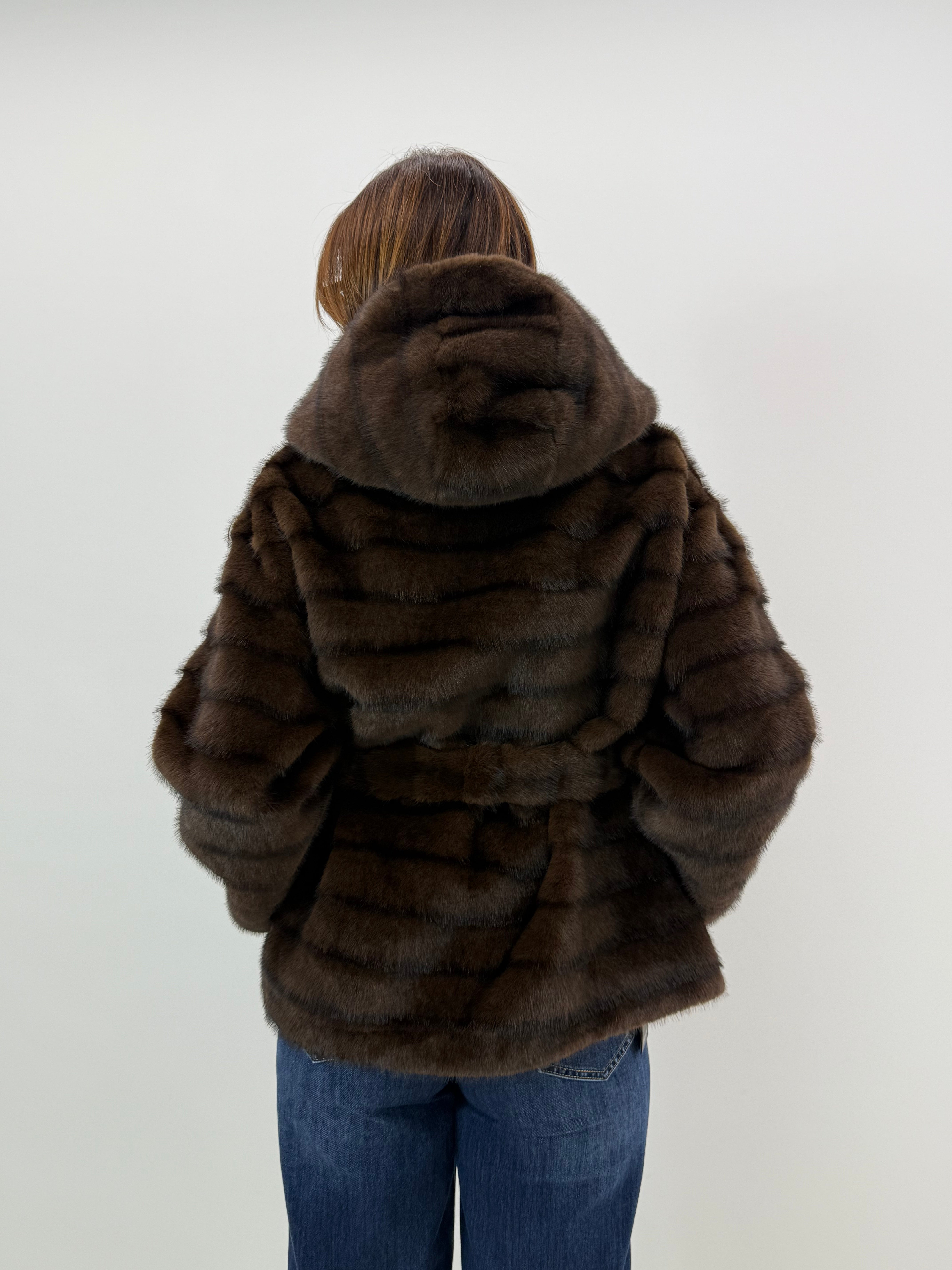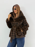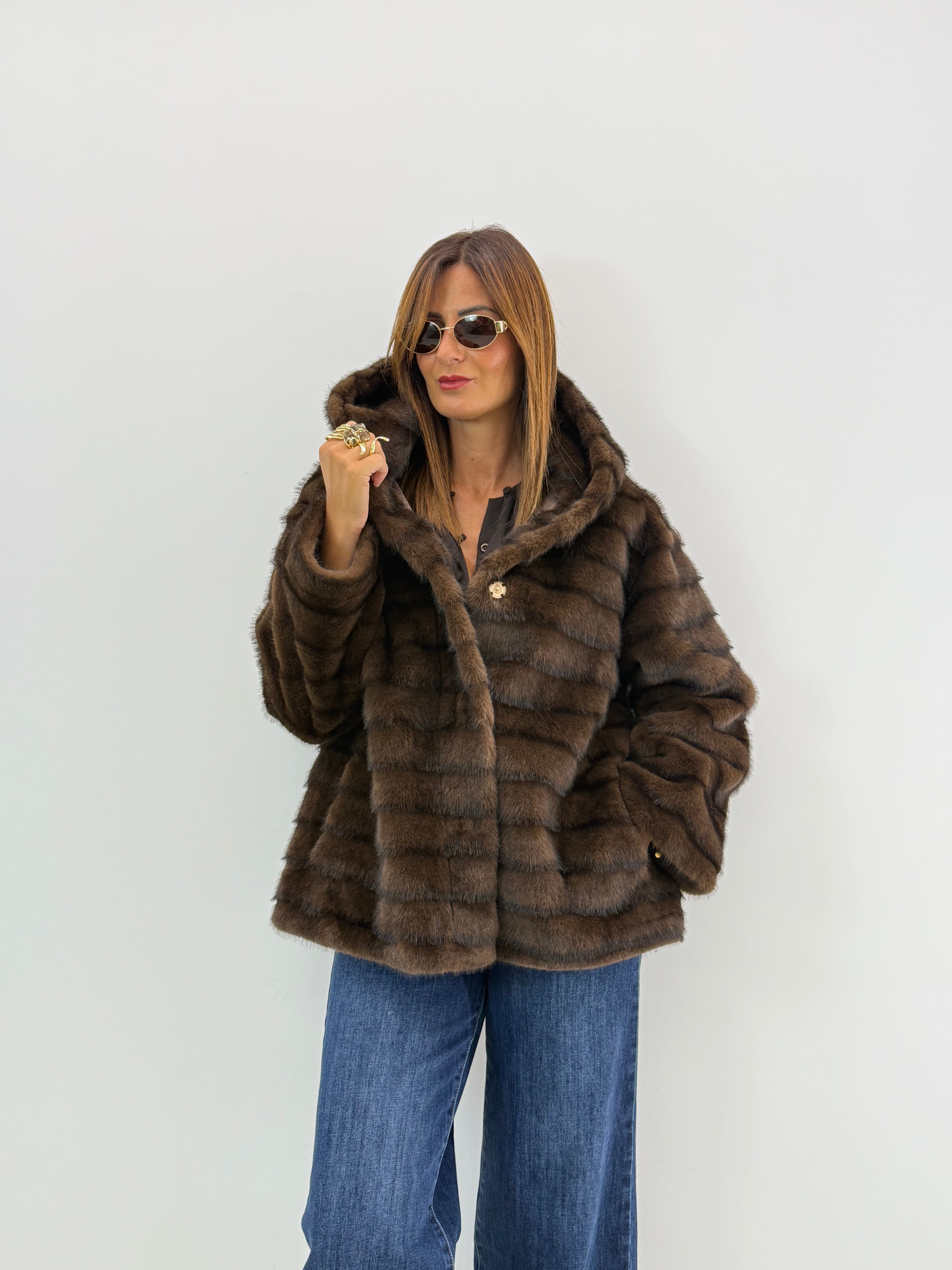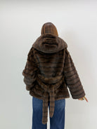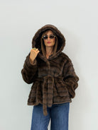 Cappotto con cinturino in pelliccia sintetica con cappuccio voluminoso, che aggiunge un tocco di lusso e calore, stile glamour urbano con un equilibrio tra eleganza e modernità.