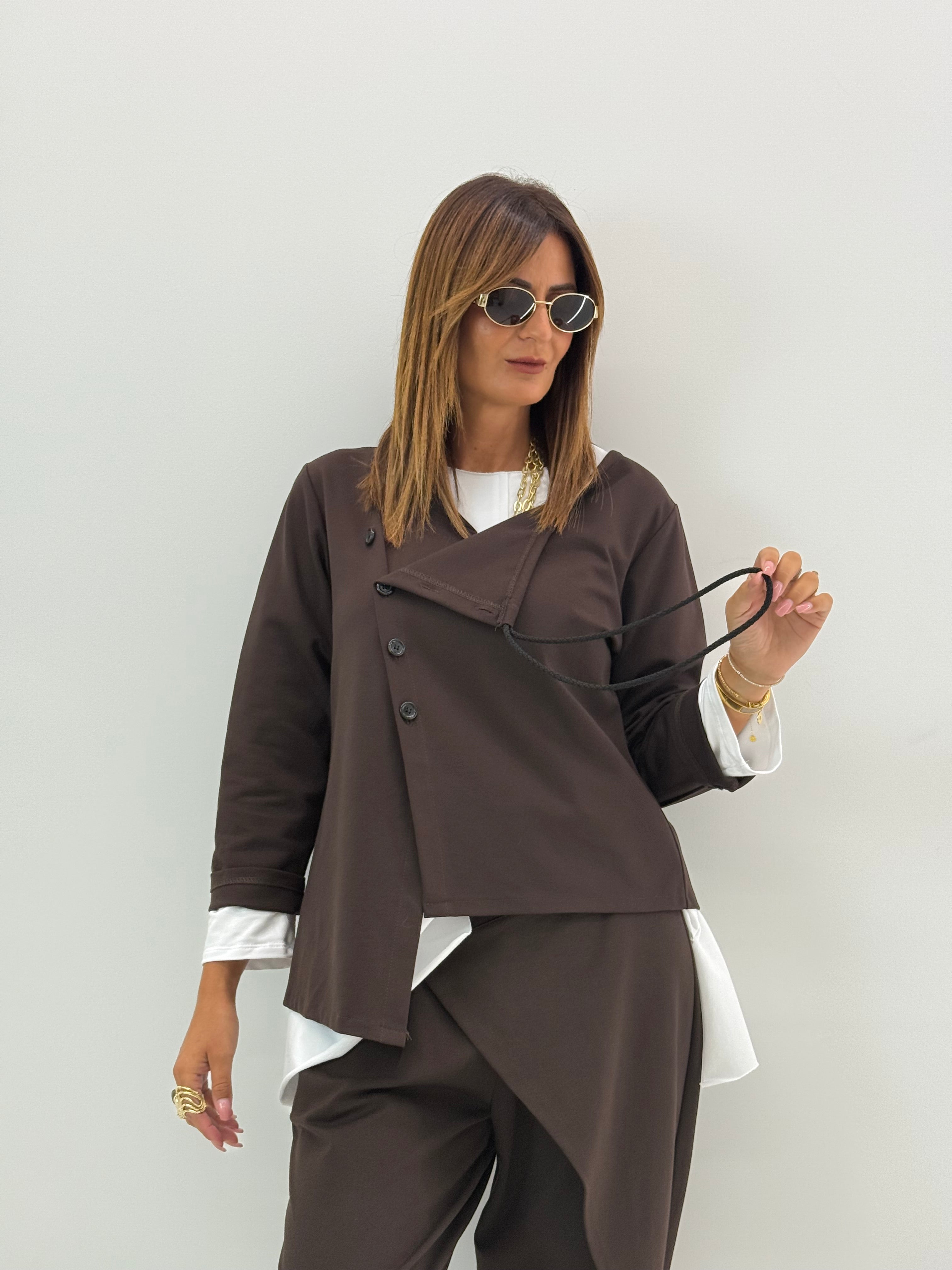 Giacca asimmetrica in punto Milano, scollo asimmetrico. Chiusura con bottoni trasversali, linea leggermente svasata. Vestibilità comoda.