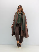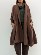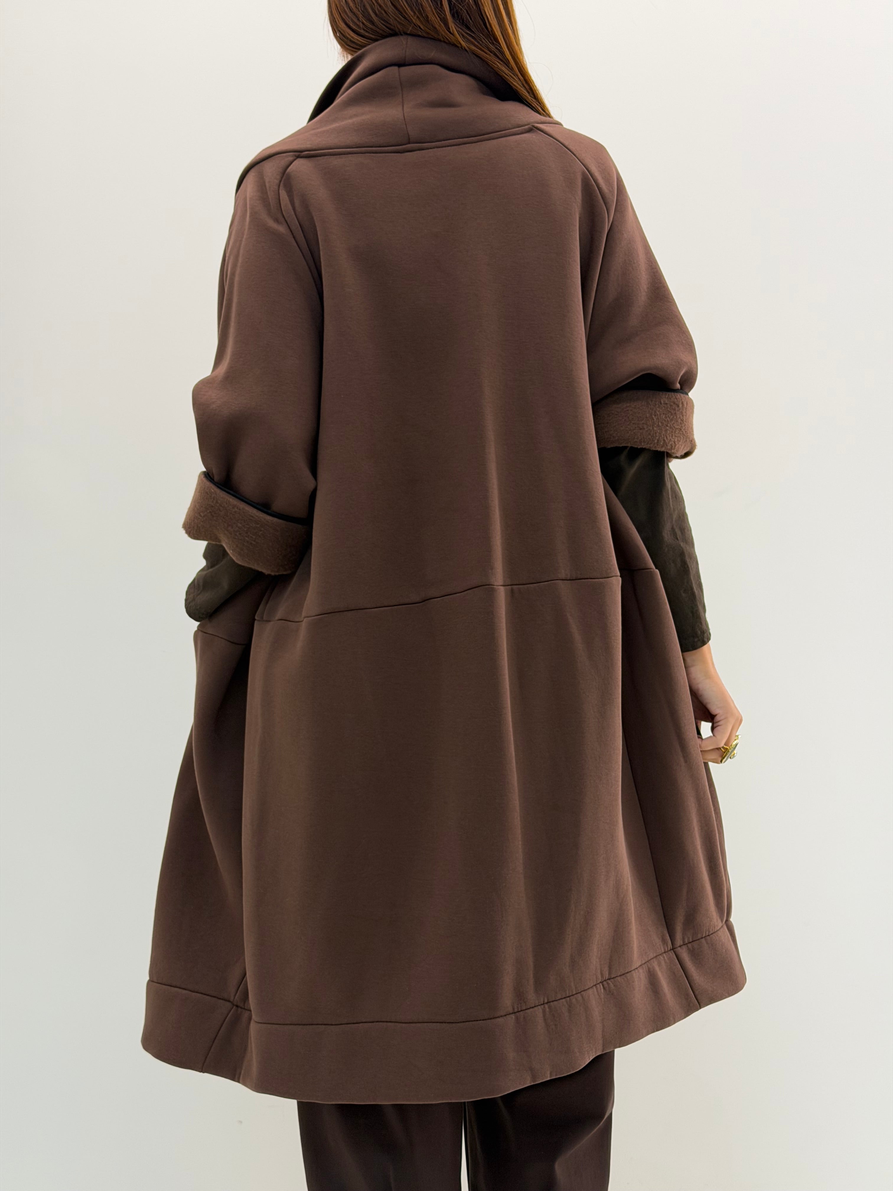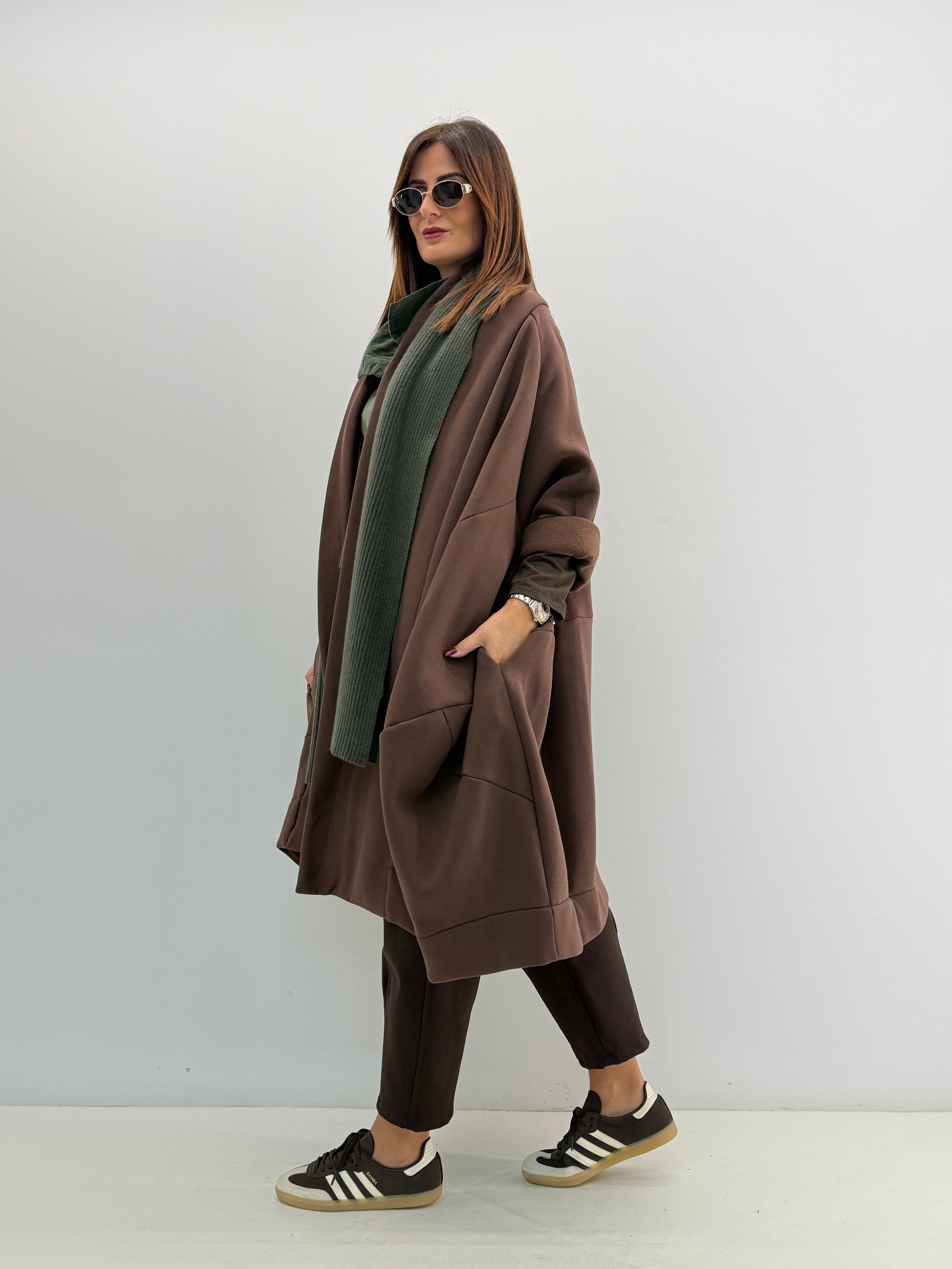 Cardigan over lungo in felpa. Senza chiusure, tasche laterali a scomparsa. Vestibilità comoda.