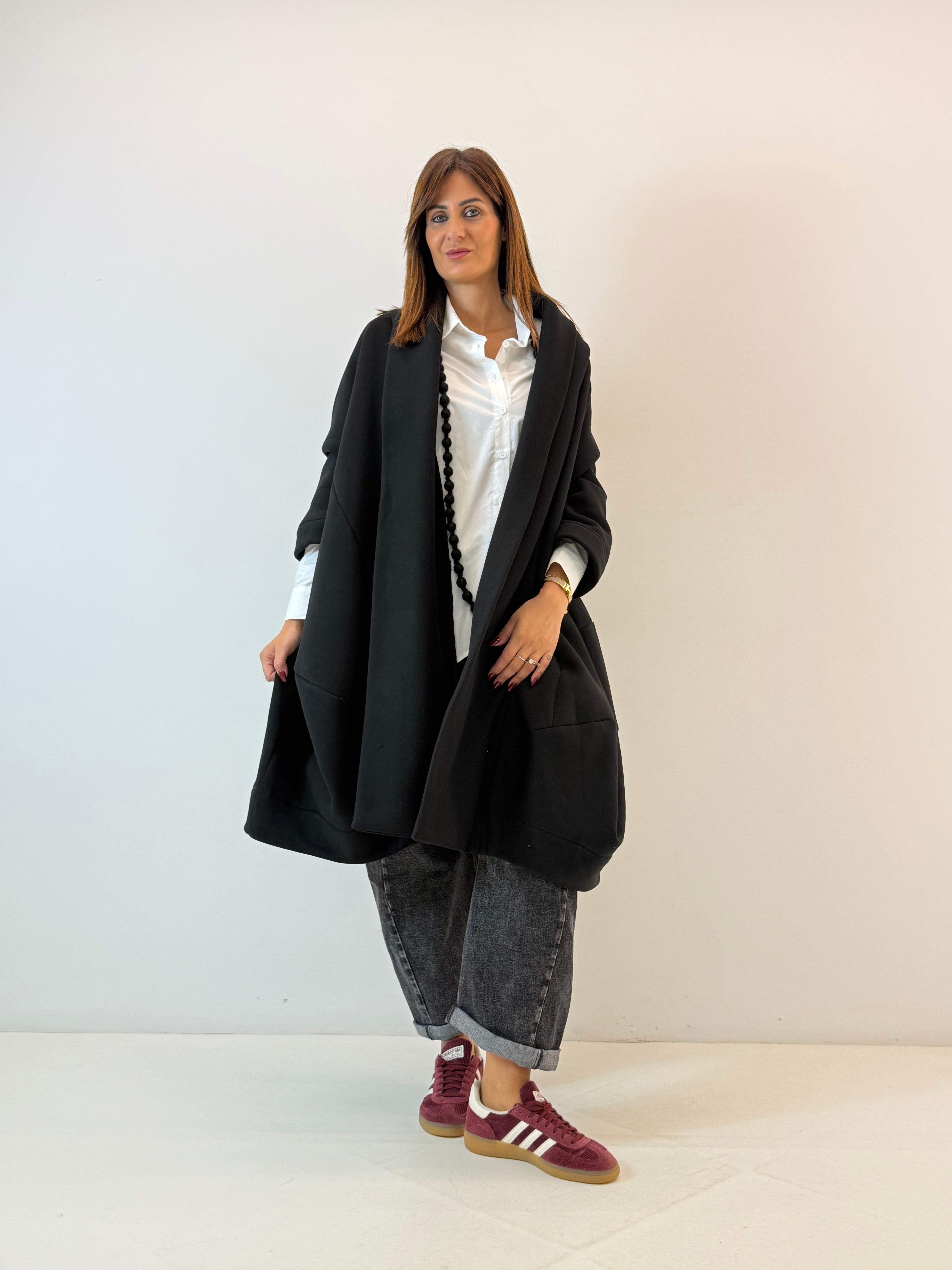 Cardigan over lungo in felpa. Senza chiusure, tasche laterali a scomparsa. Vestibilità comoda.