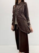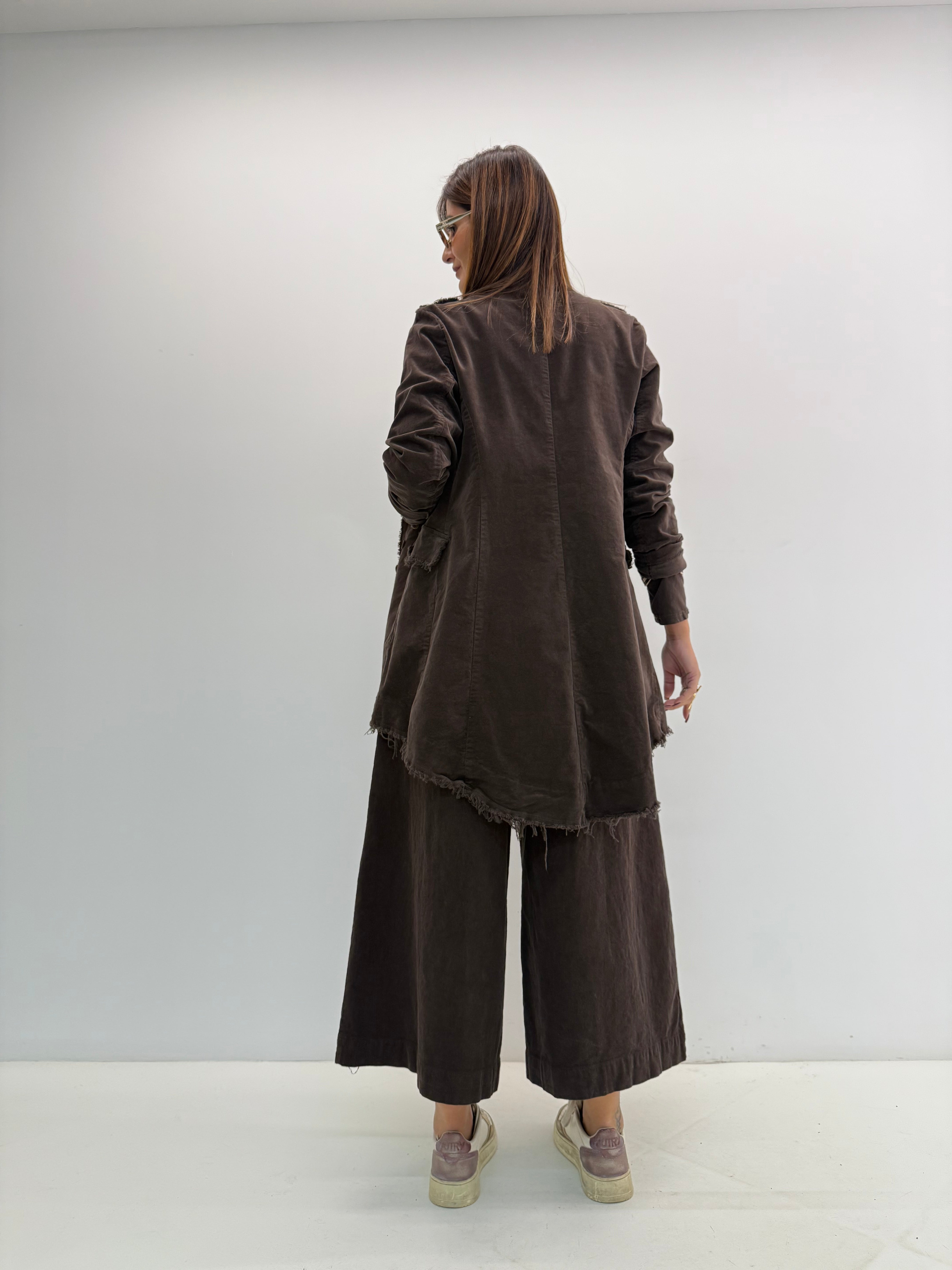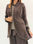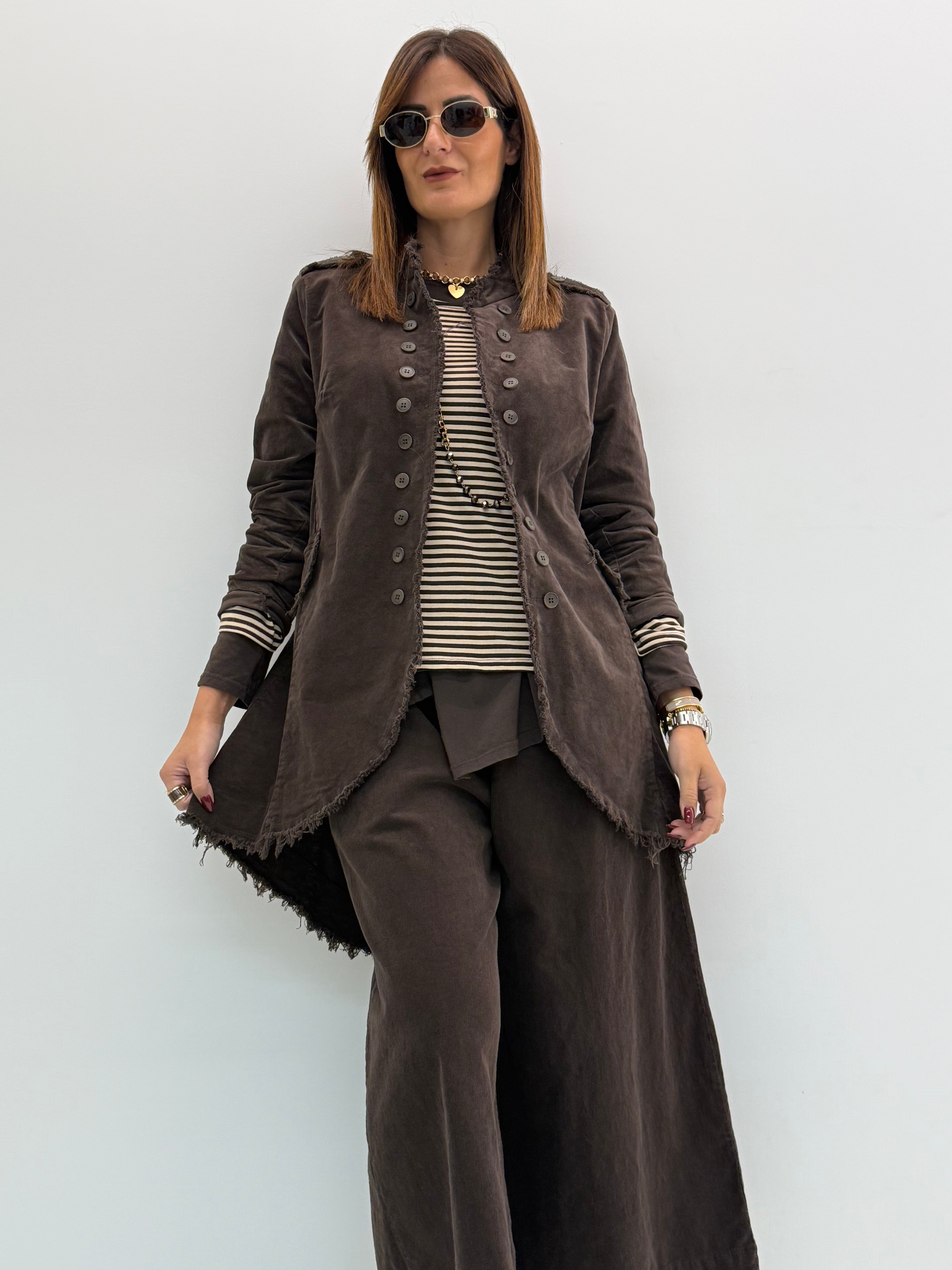 Giacca in velluto, finte tasche con patta, dettaglio di bottoni sul davanti. Più lunga dietro.