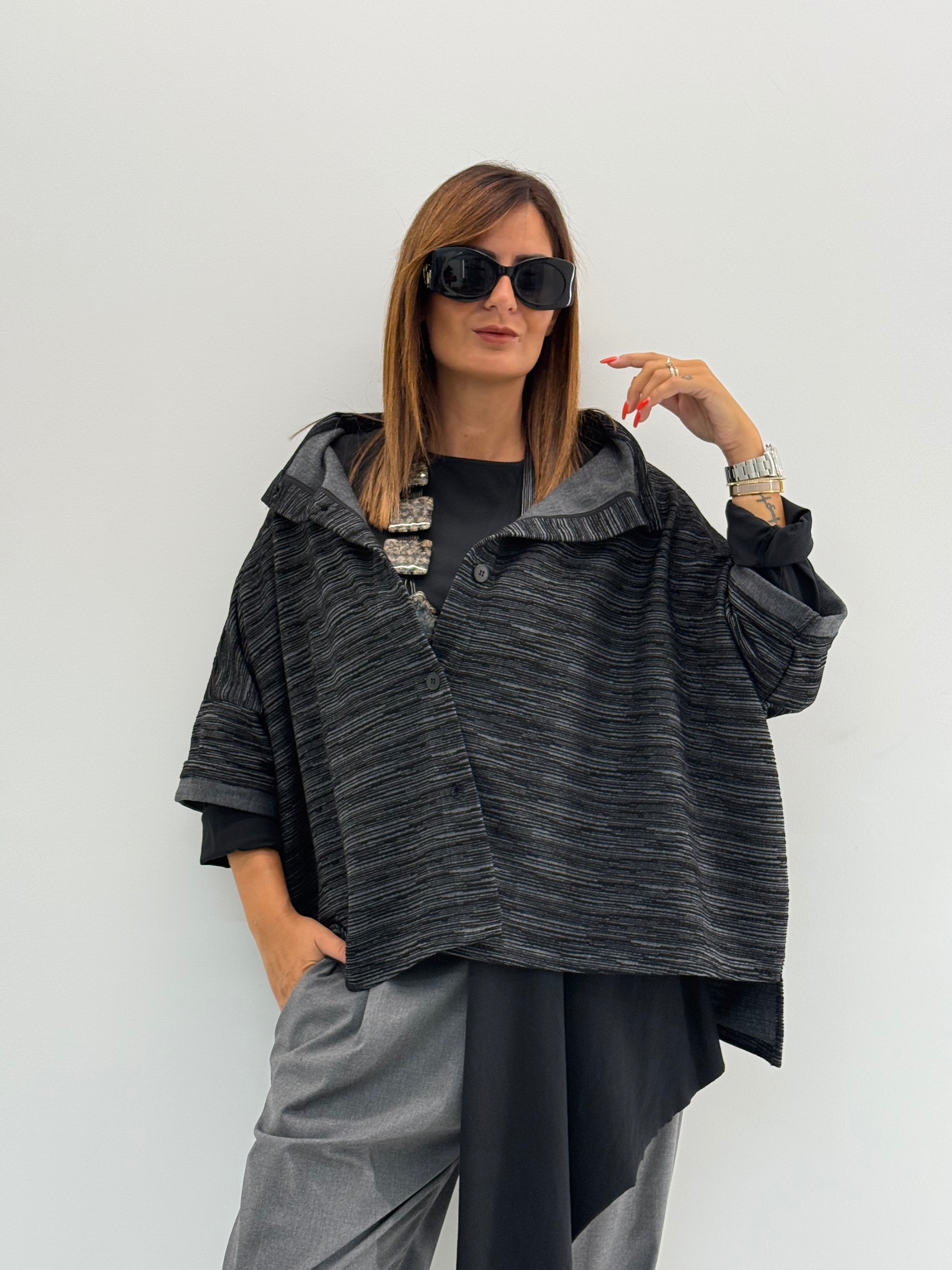 Giacca morbida e destrutturata spalle scese e maniche ampie a 3/4, ampio collo revers, chiusura frontale con bottoni, colore grigio antracite scuro con rigature sottili, che creano una texture visiva raffinata. Vestibilità comoda.