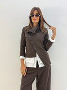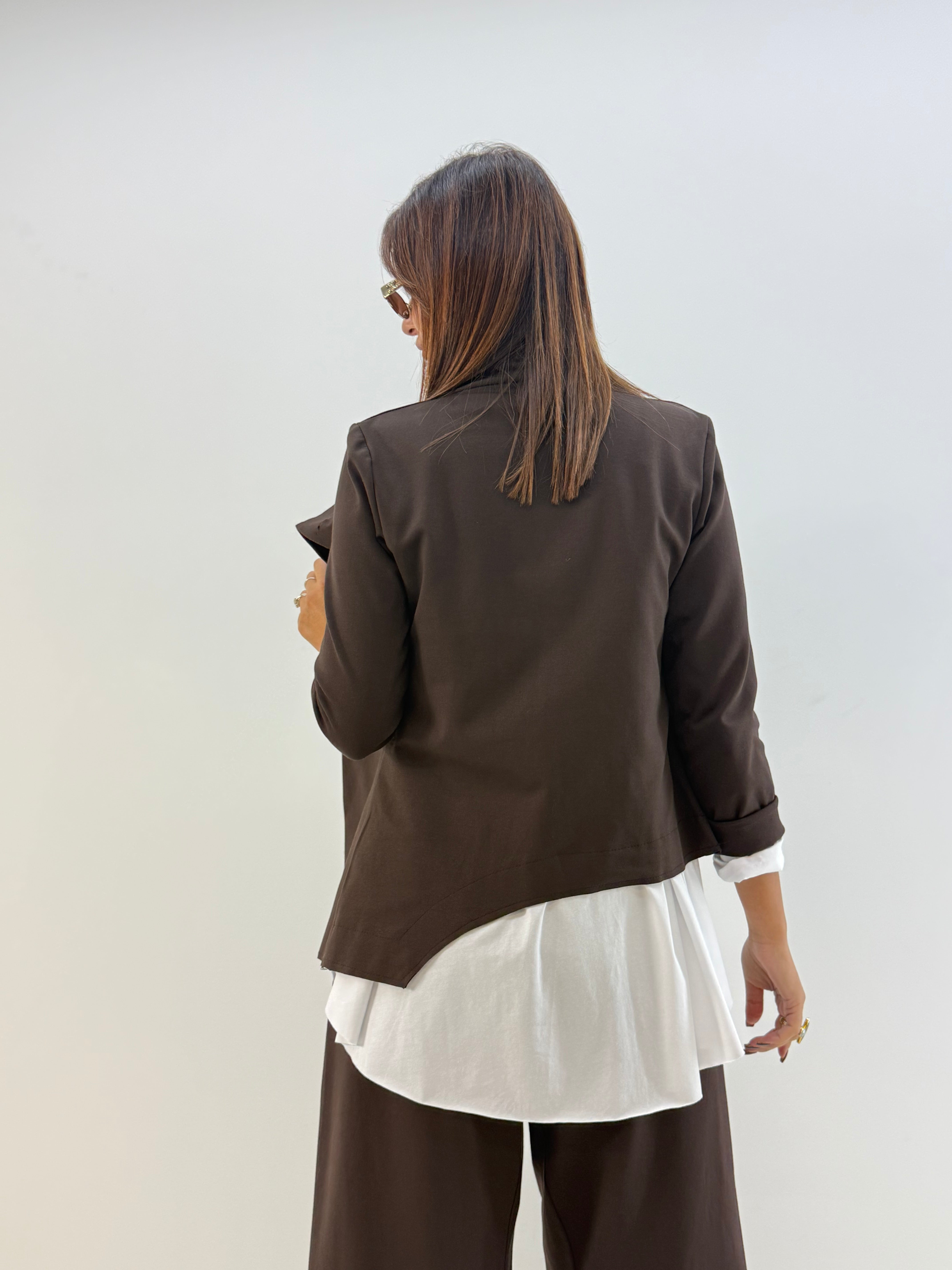 Giacca asimmetrica in punto Milano. Chiusura con bottoni trasversali.