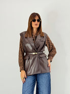Gilet in ecopelle, chiusura con bottone sul davanti, passanti pere cintura e cinturino, spacchi laterali. Foderato all'interno.