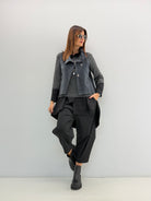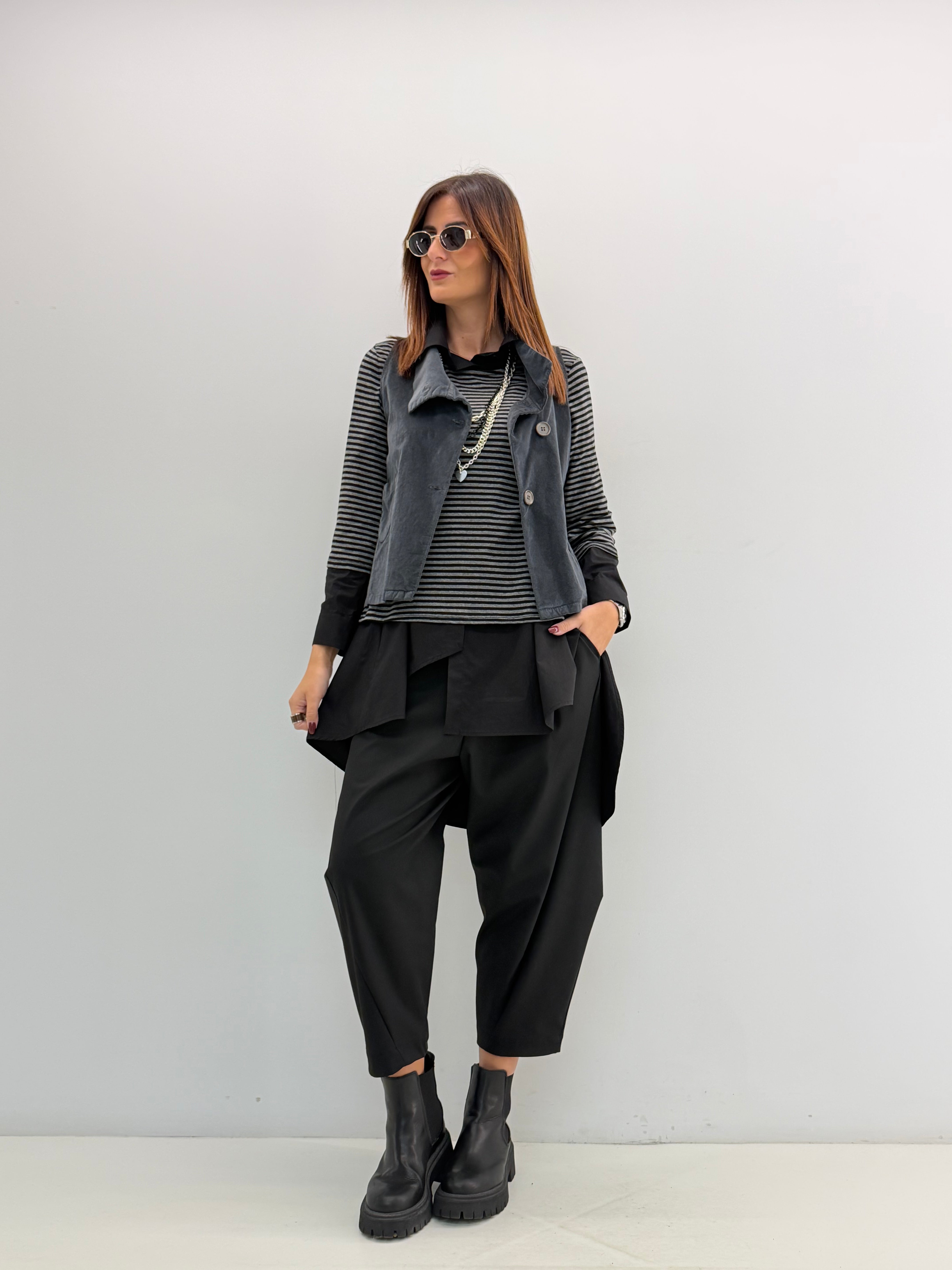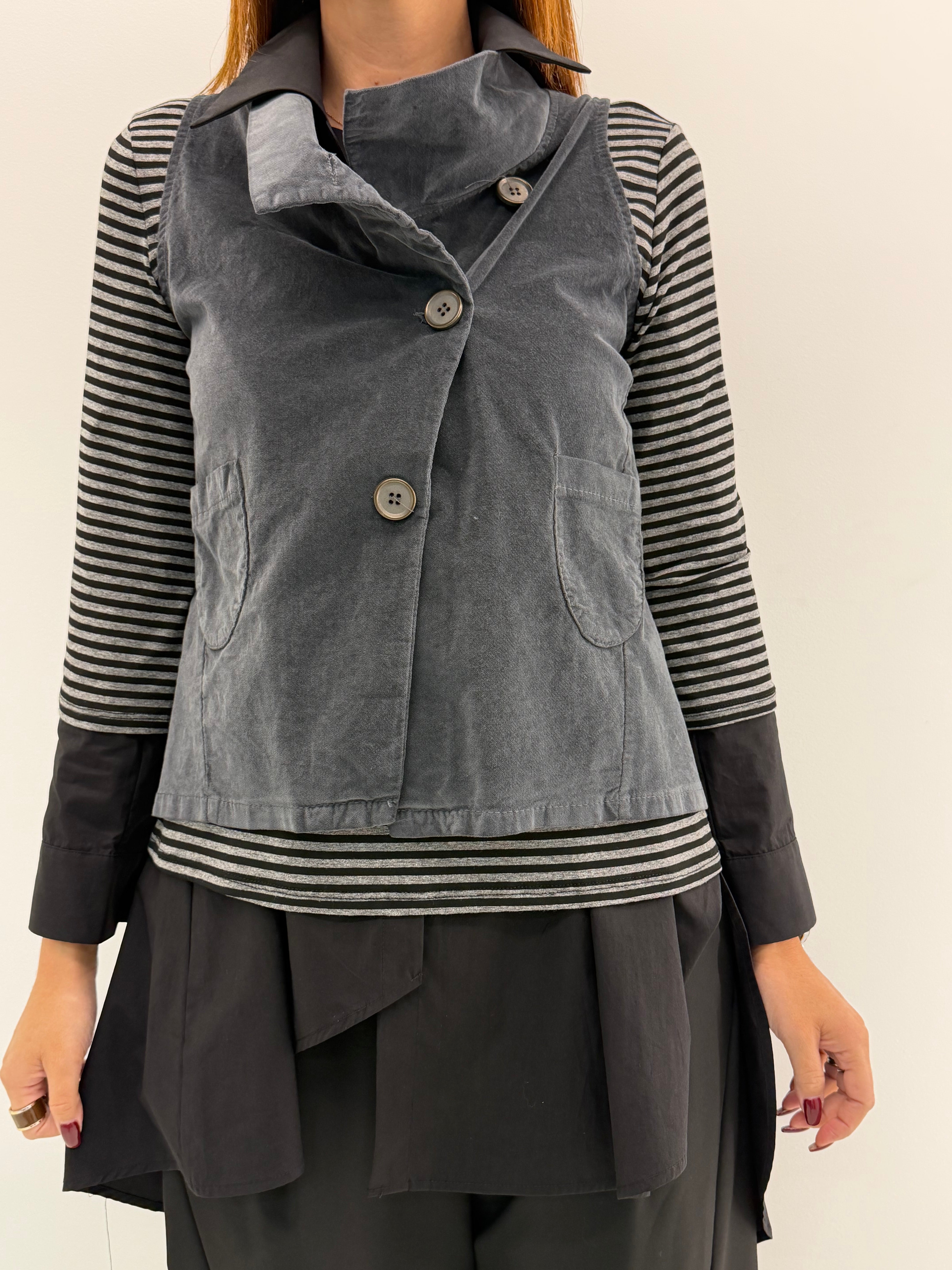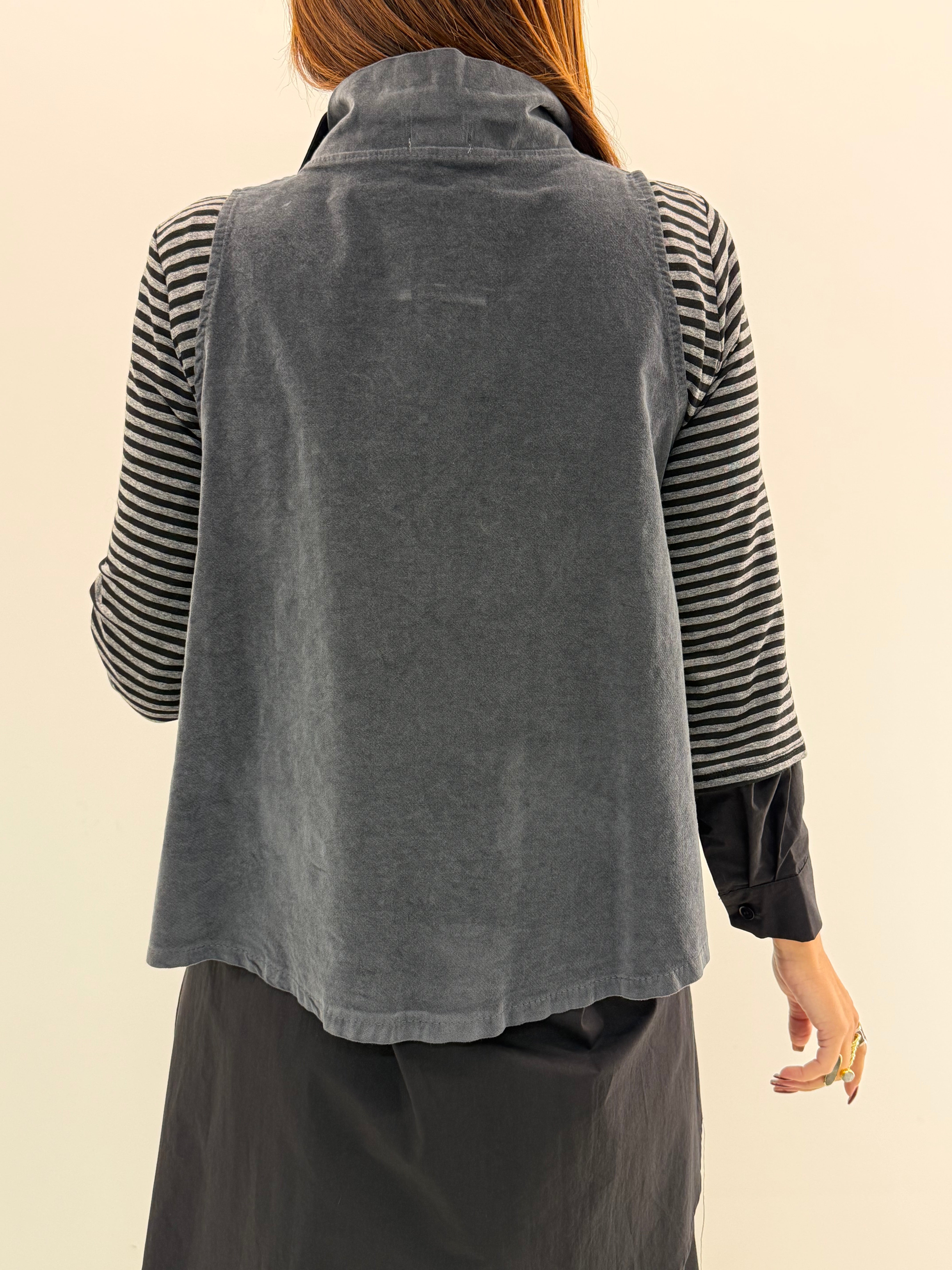 Gilet effetto velluto, chiusura con bottoni sul davanti. Colletto asimmetrico a punta. Tasche applicate frontali. Linea svasata. Più corto davanti e più lungo dietro.