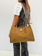 Borsa modello tote bag, con doppio manico e tracolla removibile, materiale in morbido suede vellutato al tatto con dettagli in eco-pelle martellata colore marrone, chiusura con zip e chiusura a scatto frontale