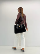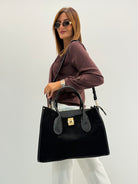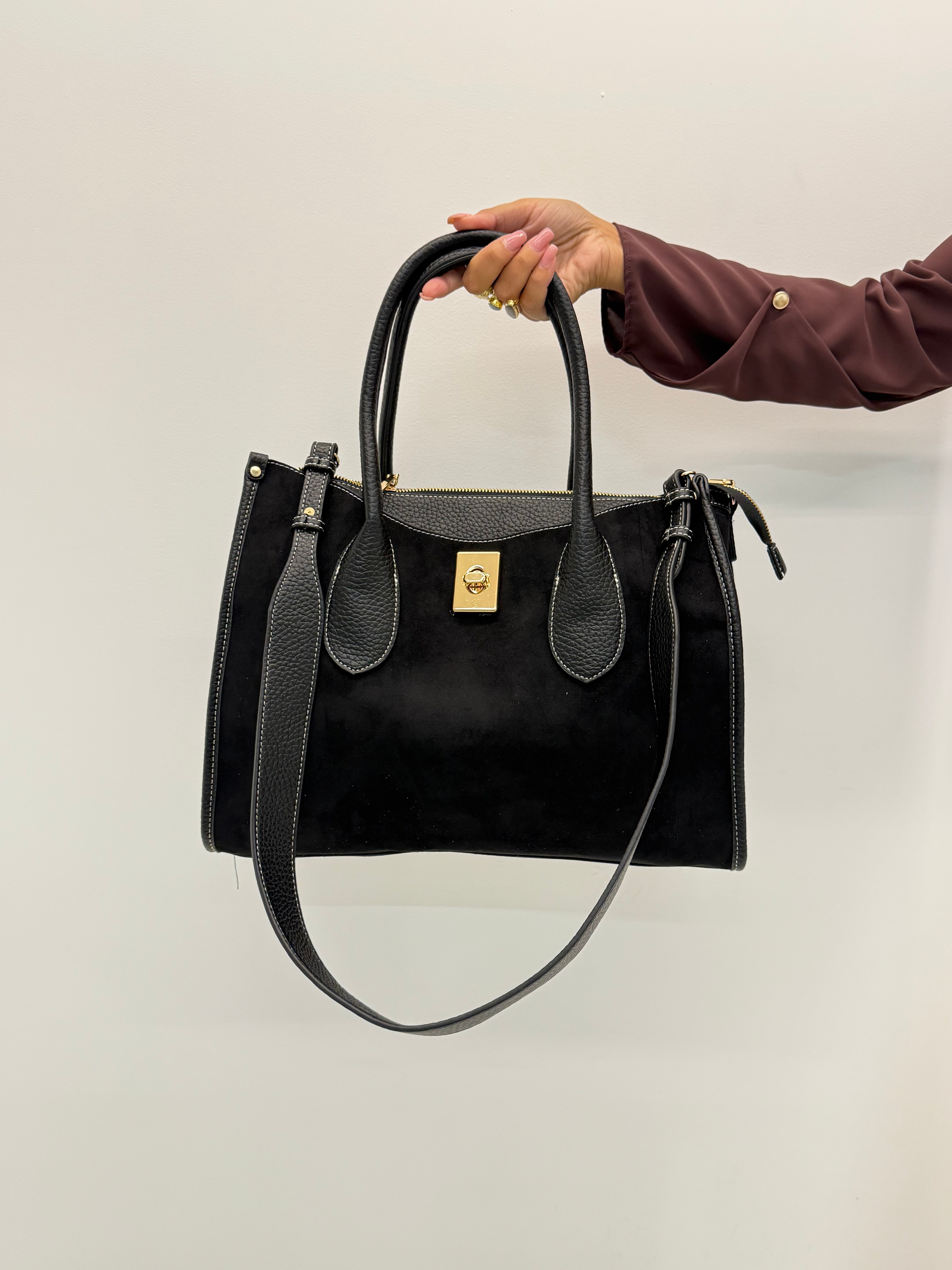 Borsa modello tote bag, con doppio manico e tracolla removibile, materiale in morbido suede vellutato al tatto con dettagli in eco-pelle martellata colore nero, chiusura con zip e chiusura a scatto frontale