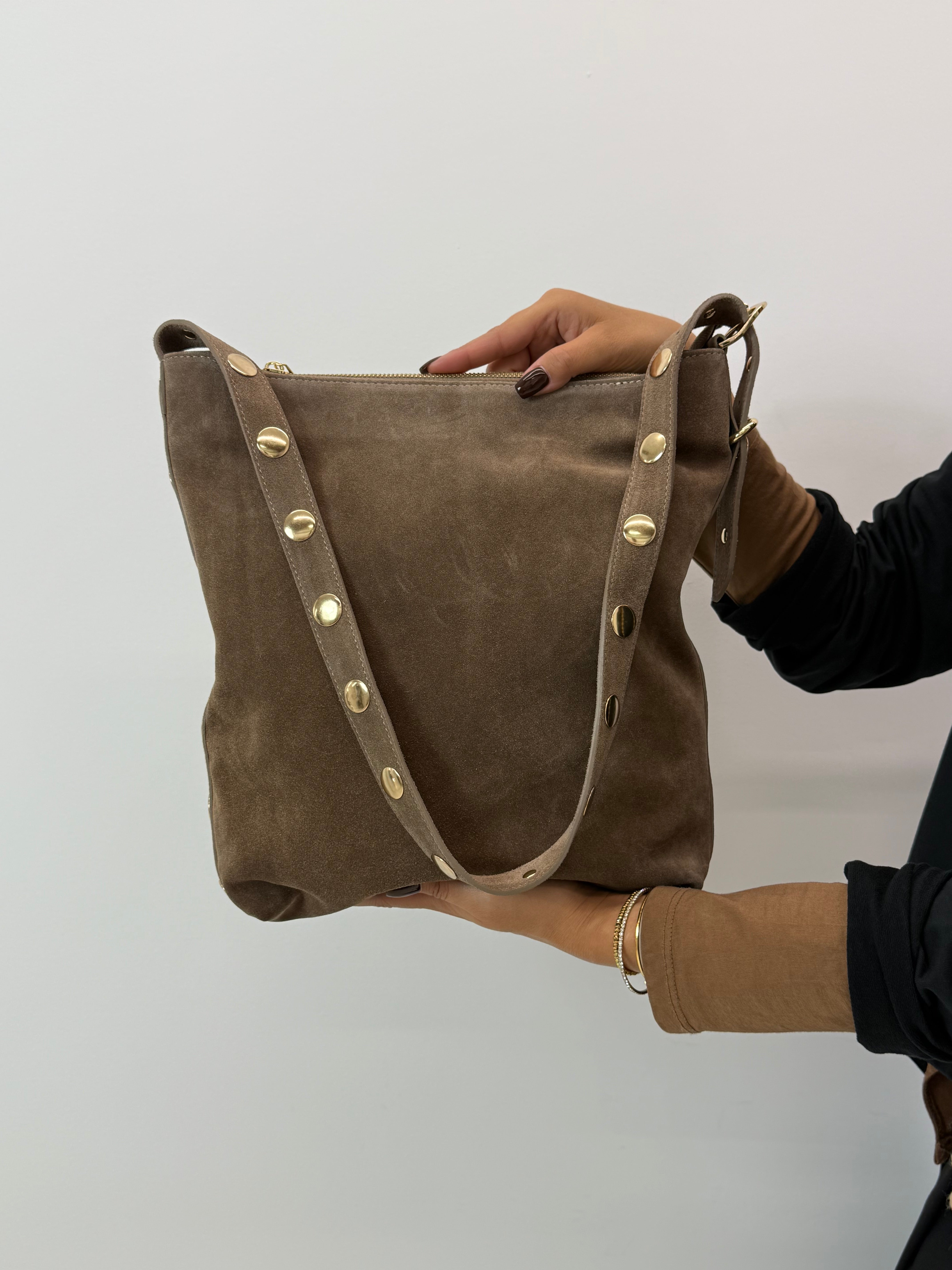 Borsa in vera pelle scamosciata, perfetta per ogni occasione, tracolla removibile, foderata all'interno.