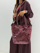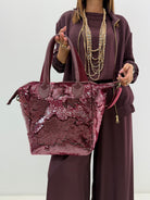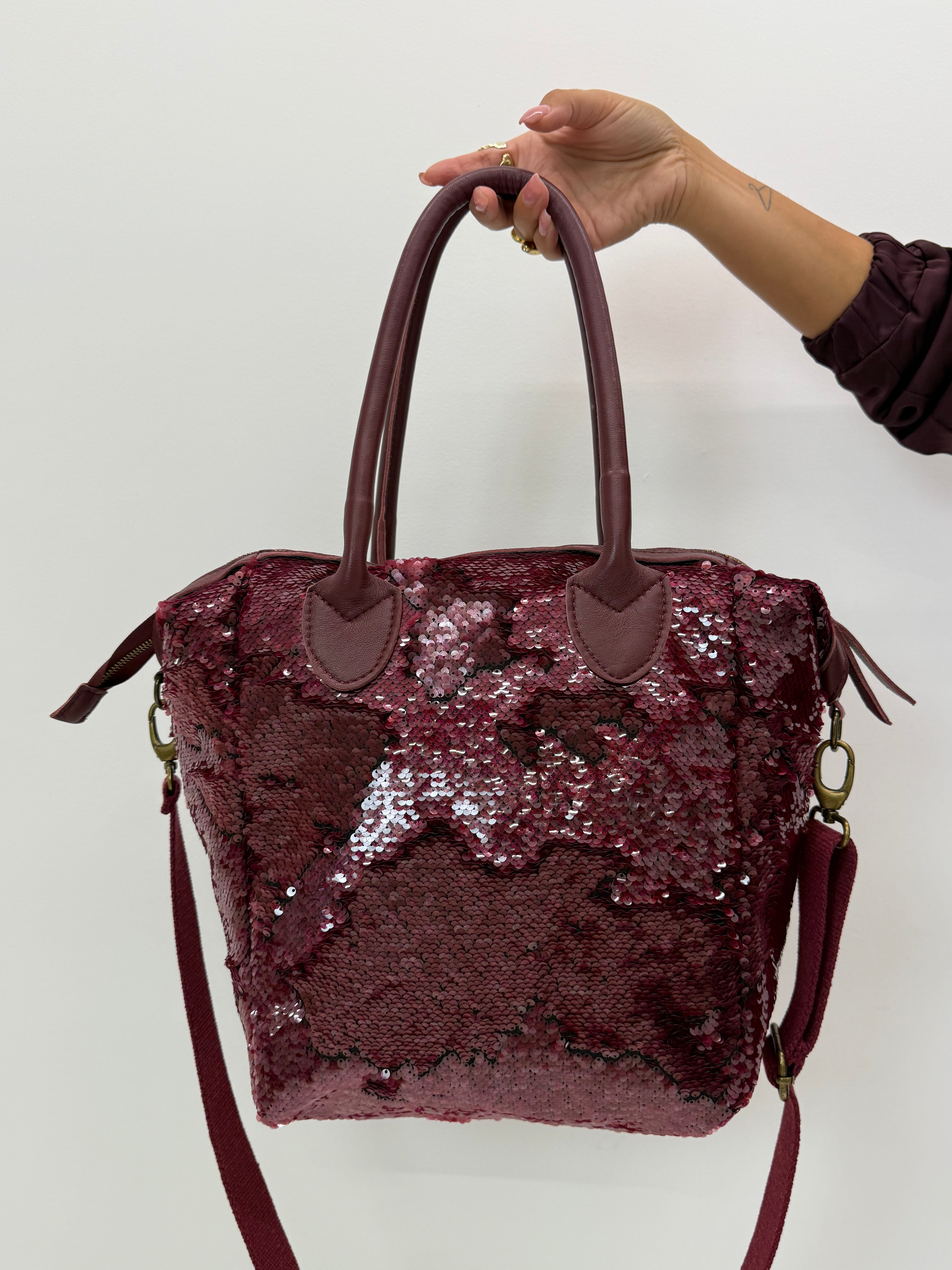 Borsa in vera pelle con paillettes, chiusura con zip, tracolla removibile.