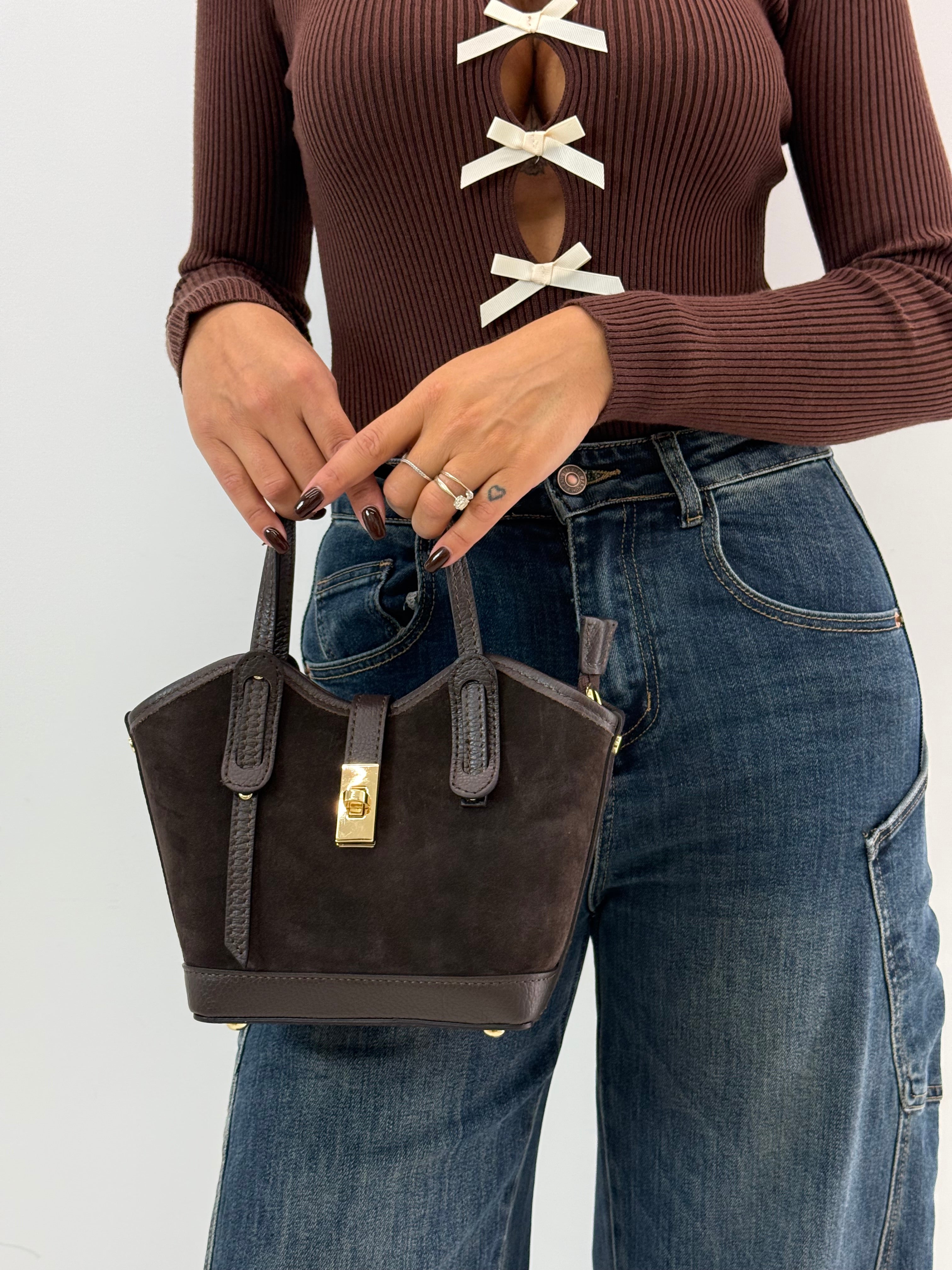 Borsa in vera pelle scamosciata, perfetta per ogni occasione, tracolla removibile, foderata all'interno.