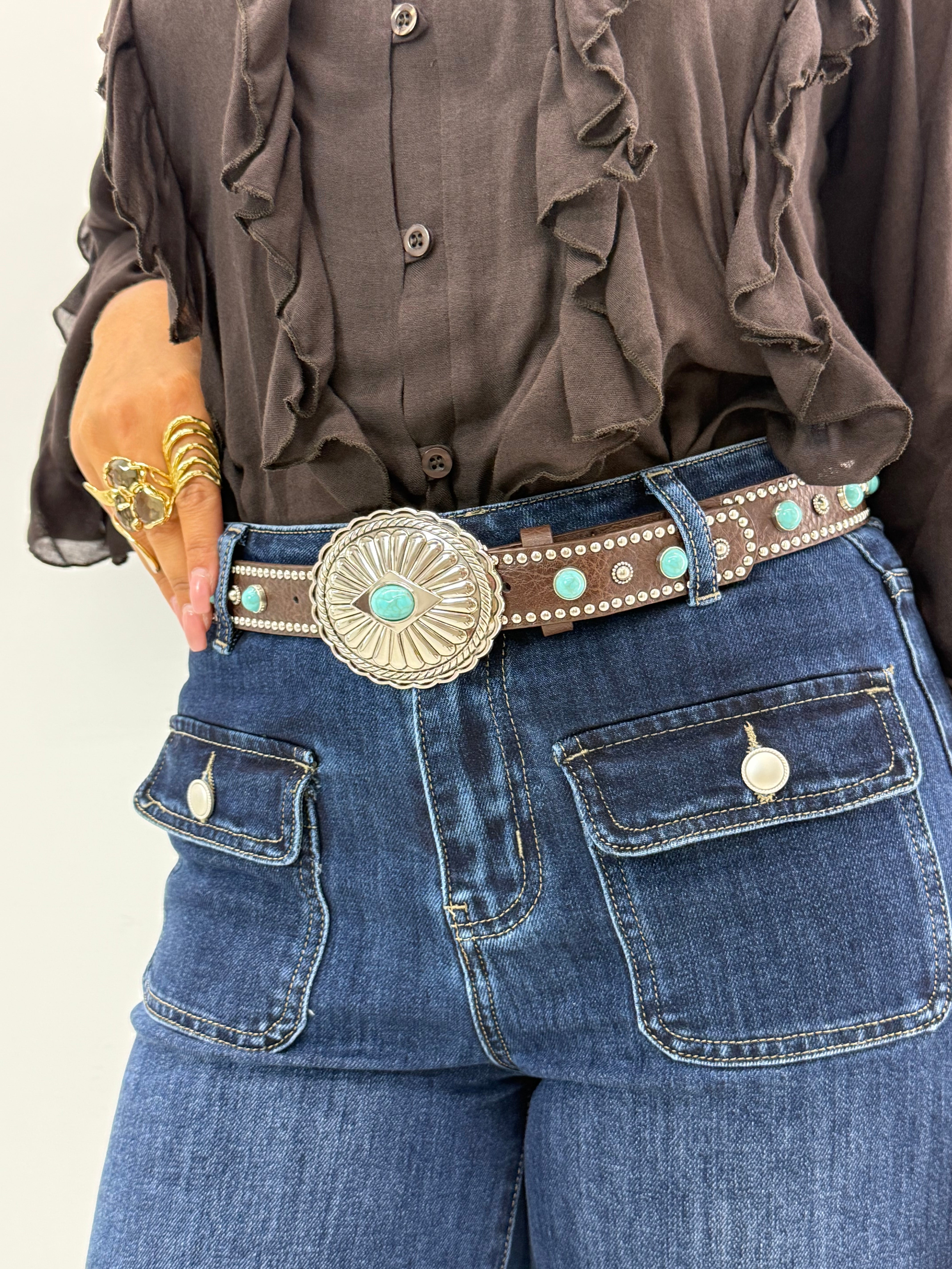 Cintura con dettagli azzurri e silver, larghezza 3cm chiusura con chiodino.
