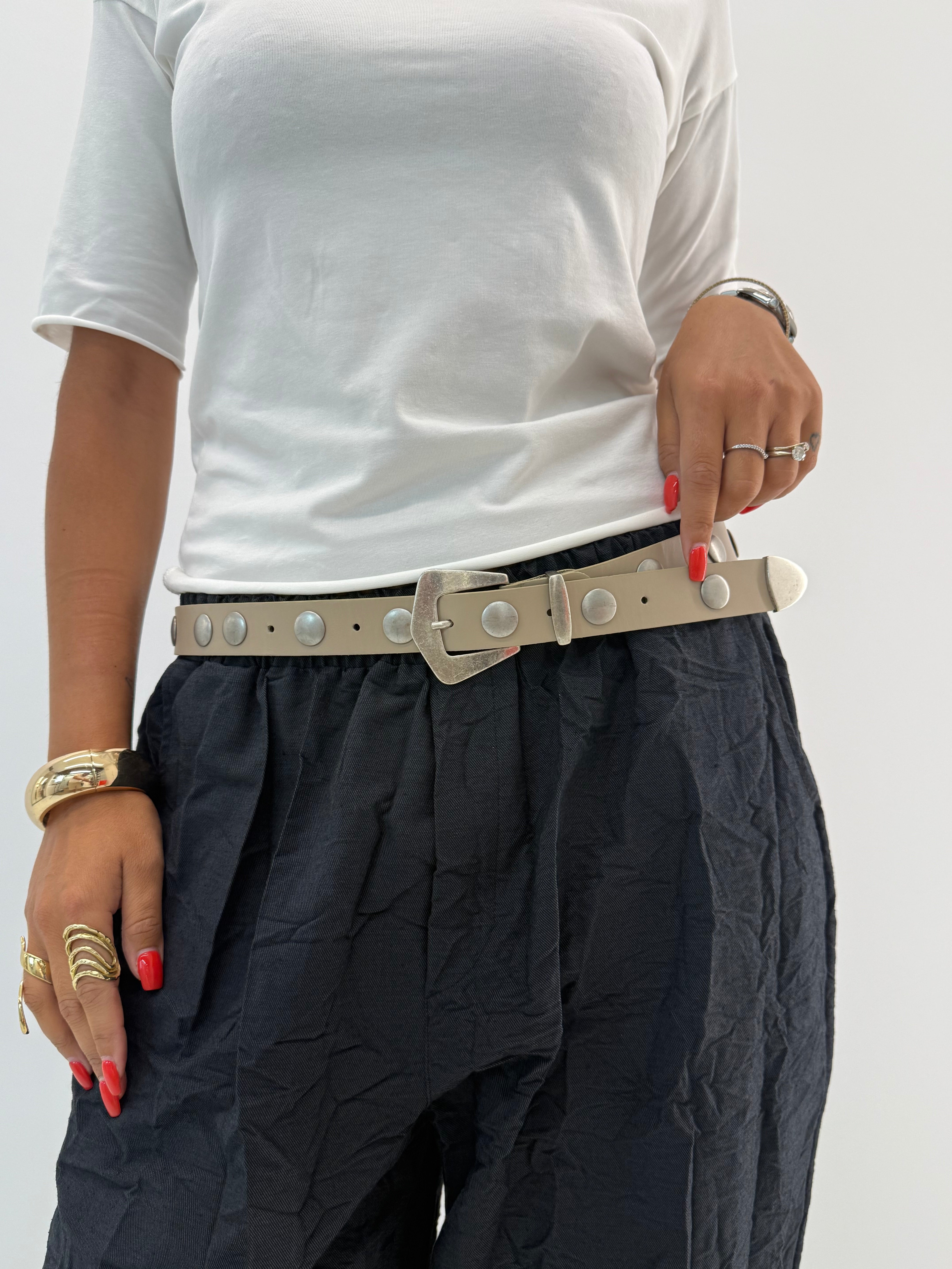 Cintura in pelle con borchie, vita media, finitura silver, larghezza 3 cm, chiusura fibbia a perno.