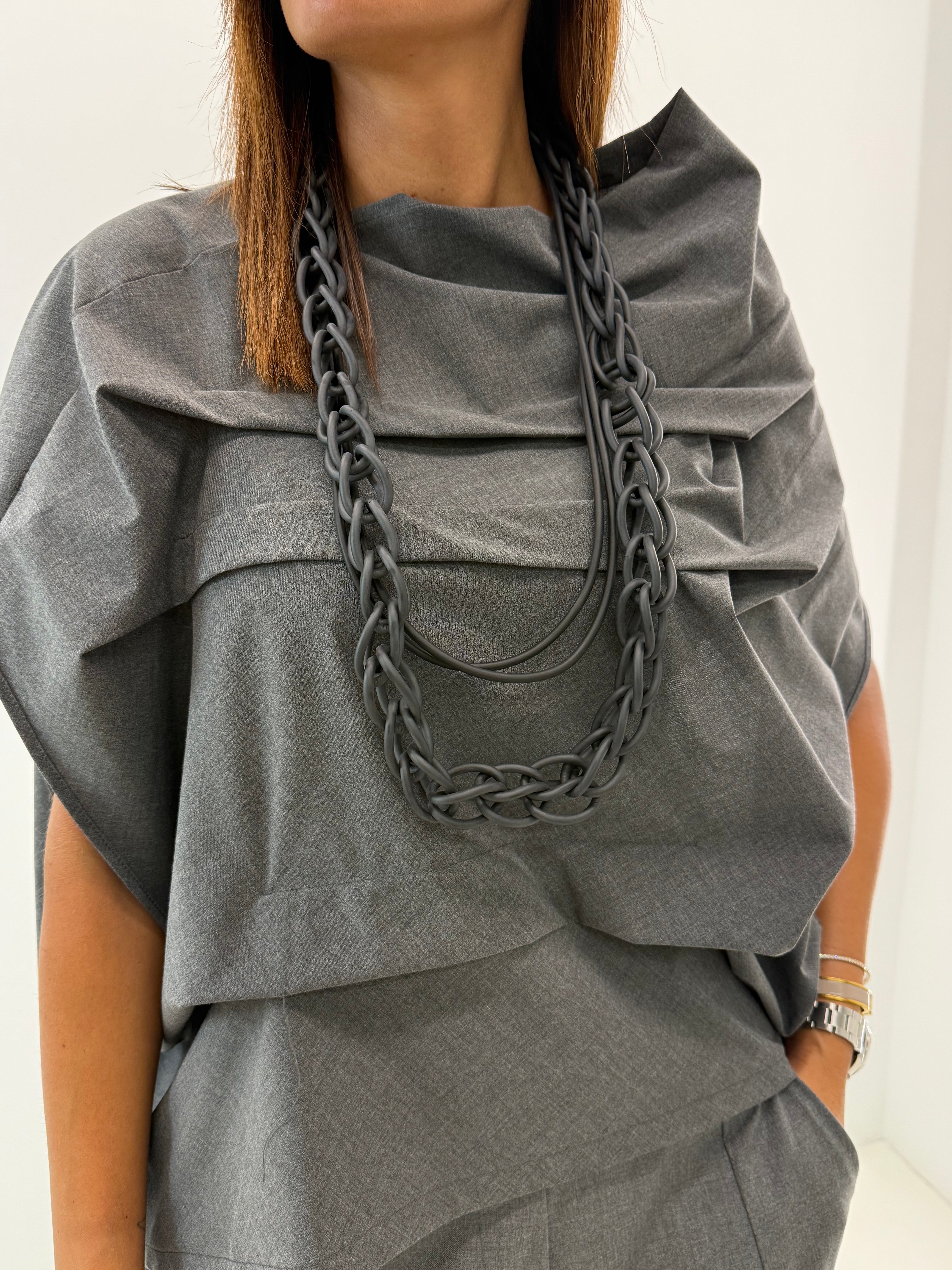 Collana tripla, in gomma. Elementi geometrici caratterizzano questa collana dal design fresco e divertente, renderà il tuo outfit ancora più raffinato. Senza chiusure.