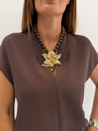 Collana con dettaglio fiore gold. Elementi geometrici caratterizzano questa collana dal design fresco e divertente, renderà il tuo outfit ancora più raffinato. Chiusura con gancetto.