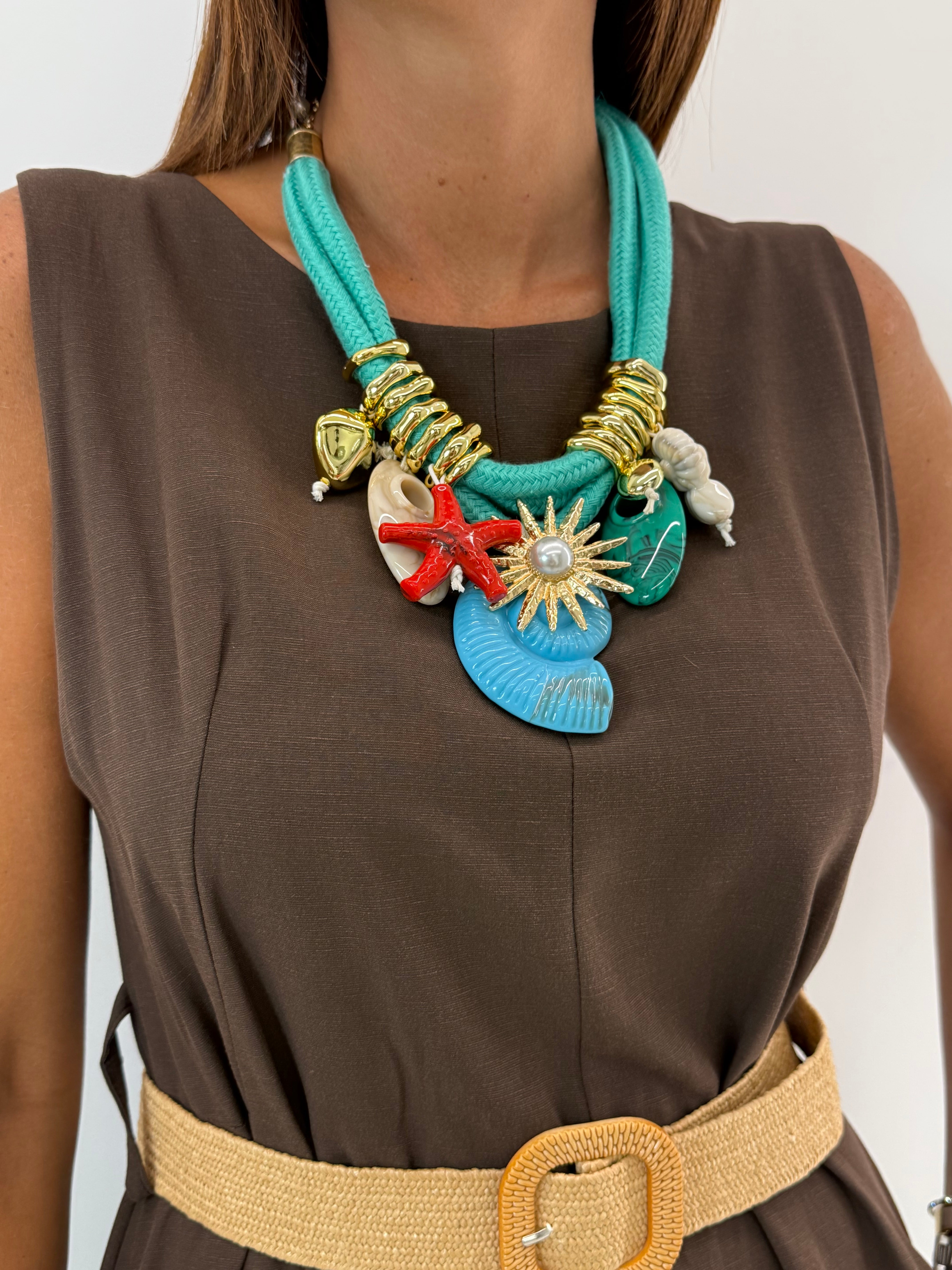 Collana in corda, con ciondoli. Elementi geometrici caratterizzano questa collana dal design fresco e divertente, renderà il tuo outfit ancora più raffinato. Chiusura con gancetto.