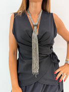 Collana a cravattina, chiusura con gancetto. Elementi geometrici caratterizzano questa collana dal design fresco e divertente, renderà il tuo outfit ancora più raffinato.