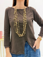Collana a più fili elastici, con perline. Elementi geometrici caratterizzano questa collana dal design fresco e divertente, renderà il tuo outfit ancora più raffinato. Chiusura con gancetto.