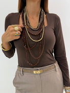 Collana a più fili con perle. Elementi geometrici caratterizzano questa collana dal design fresco e divertente, renderà il tuo outfit ancora più raffinato. Chiusura con gancetto.