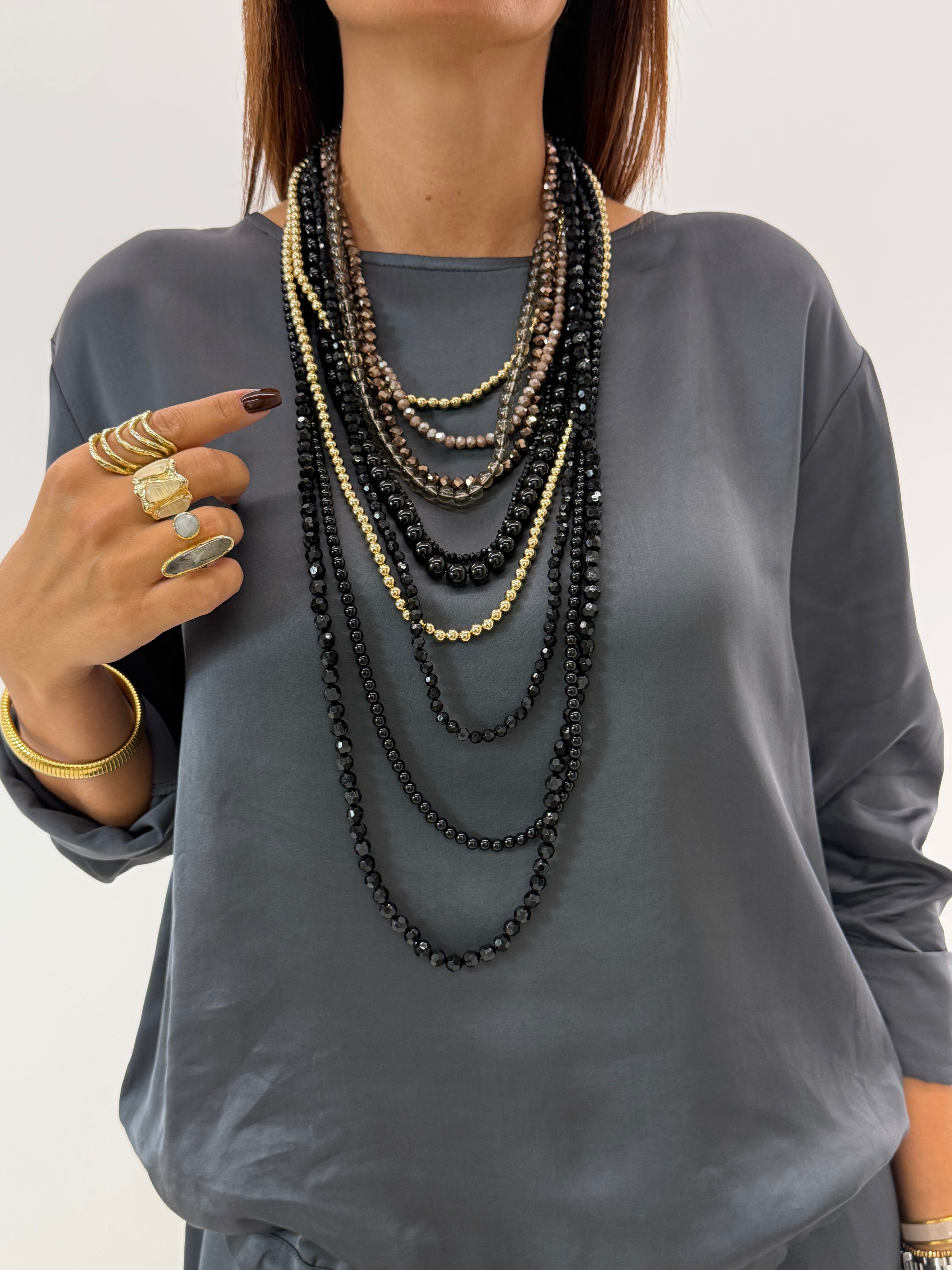 Collana a più fili con perle. Elementi geometrici caratterizzano questa collana dal design fresco e divertente, renderà il tuo outfit ancora più raffinato. Chiusura con gancetto.