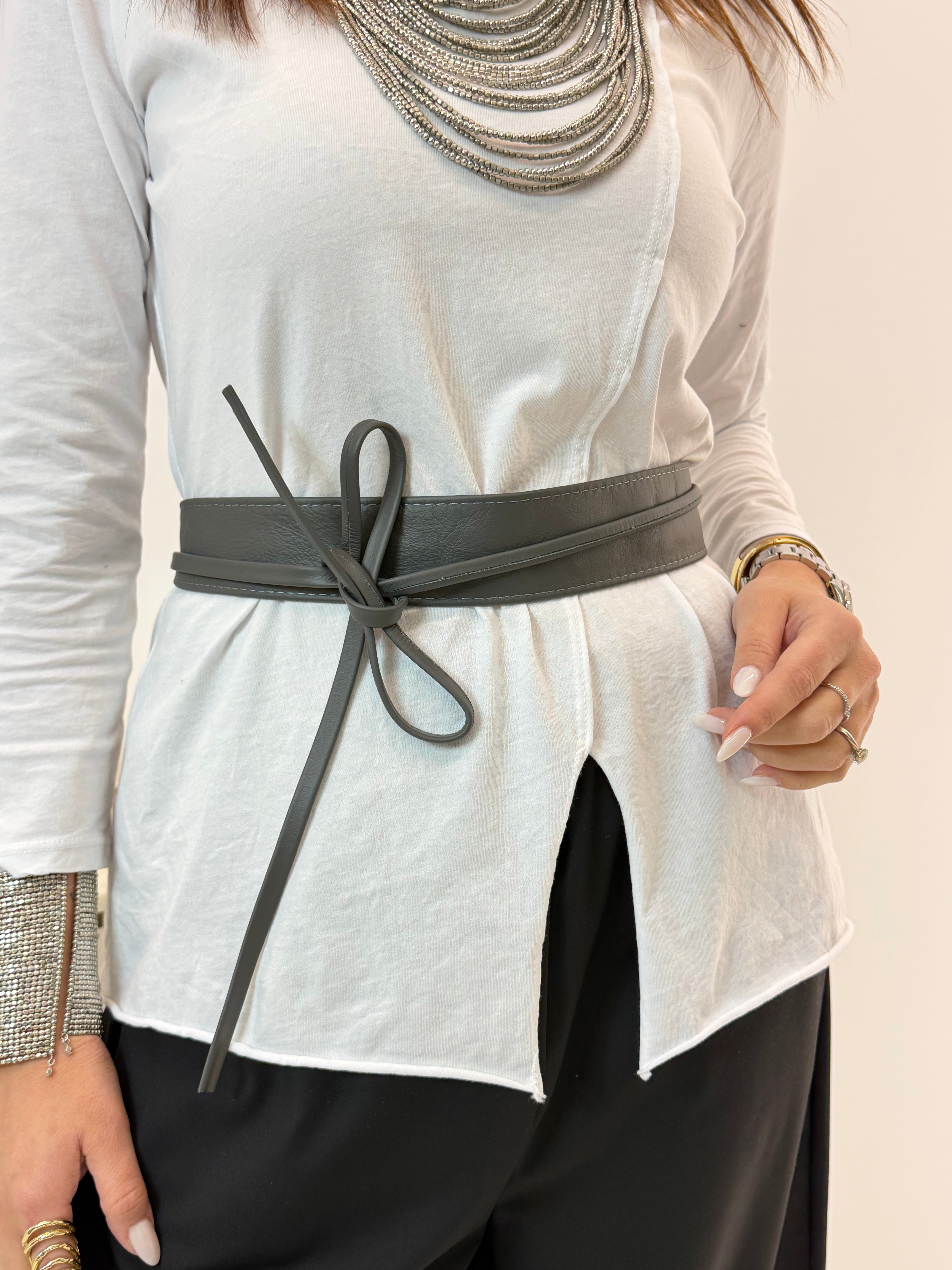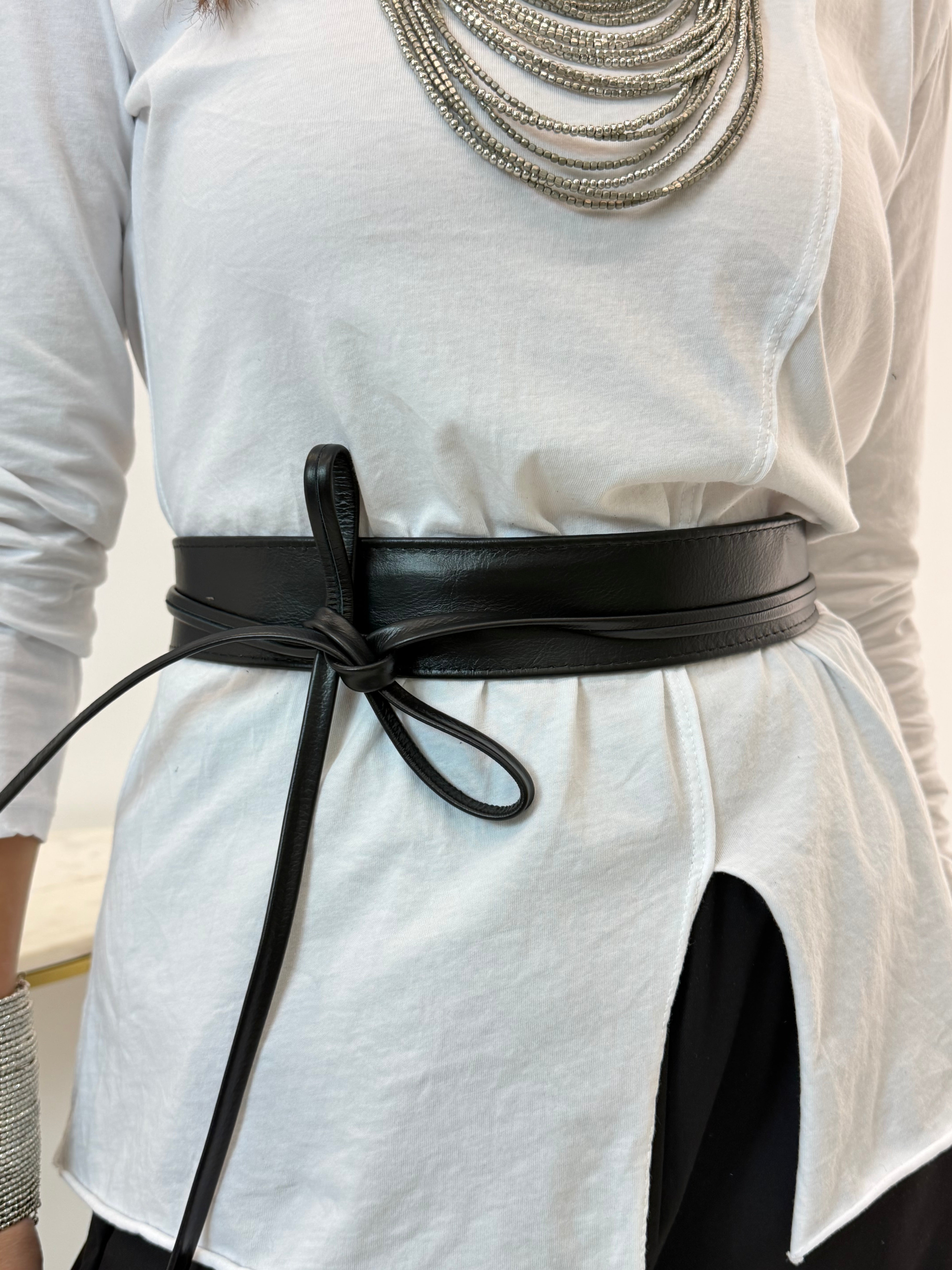 Cintura in vera pelle, chiusura con laccetti.