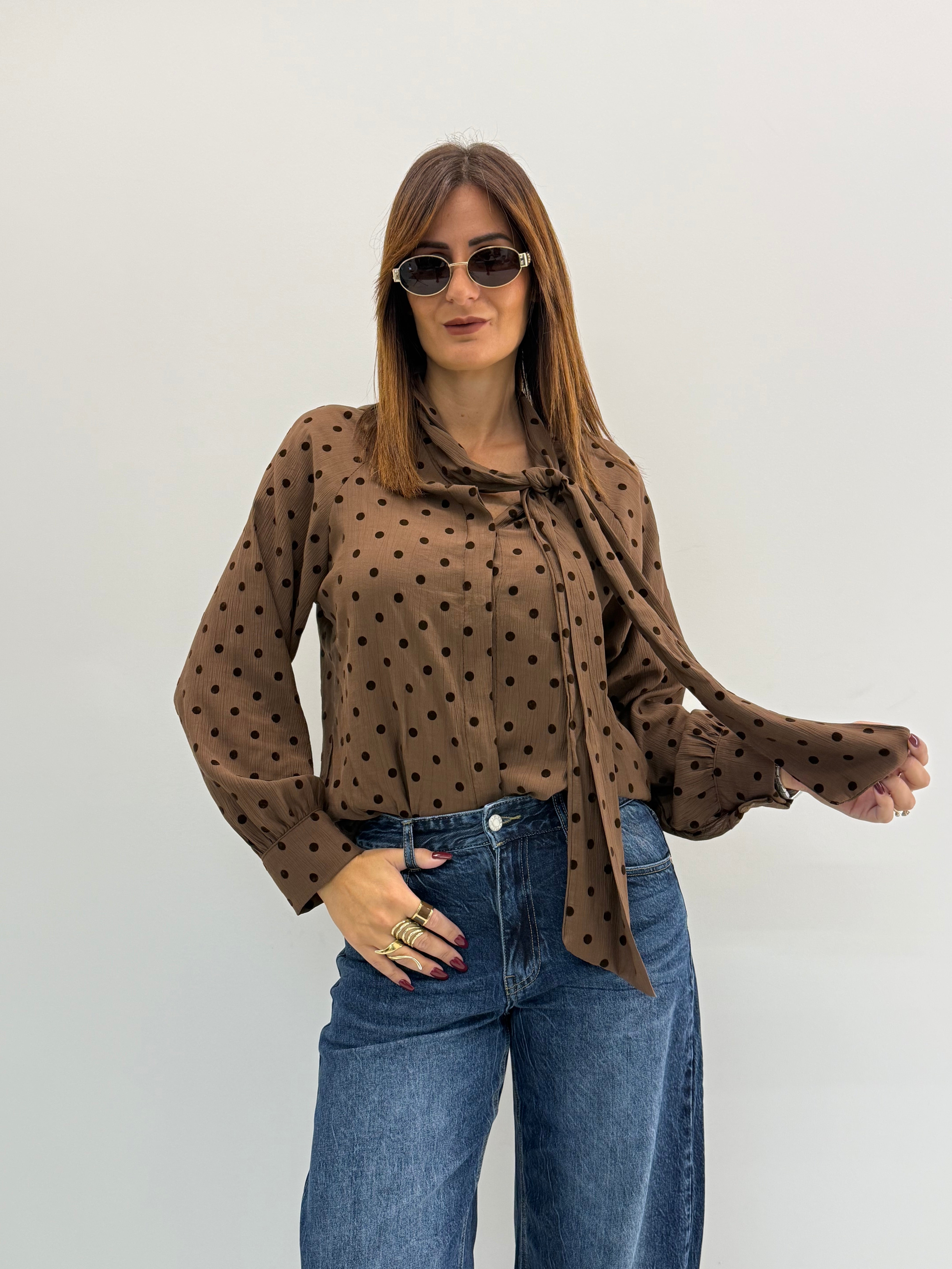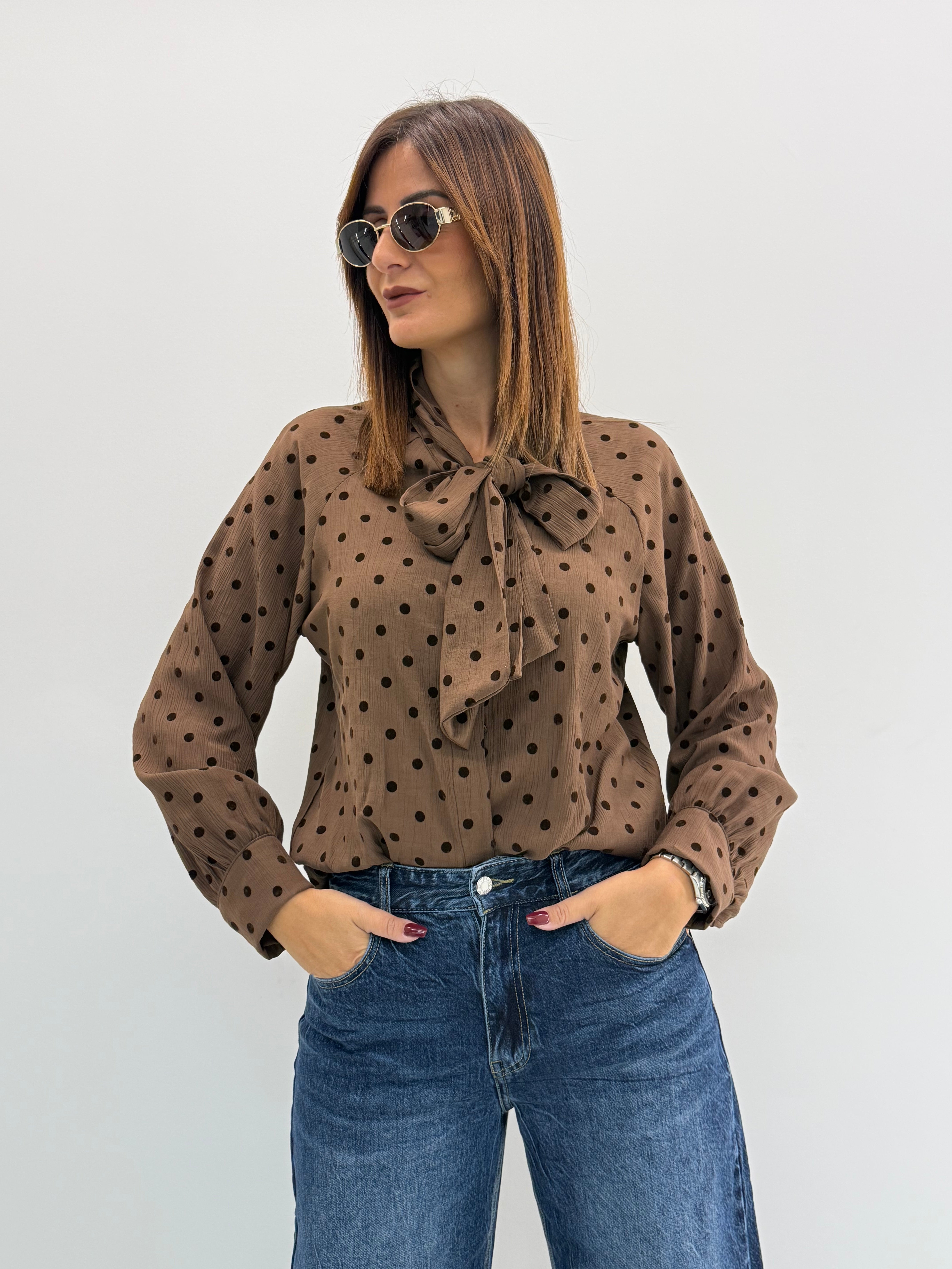 Camicia con fantasia a pois, caratterizzata da un raffinato fiocco al collo. Chiusura con bottoni davanti. Taglia unica fino alla 46.