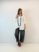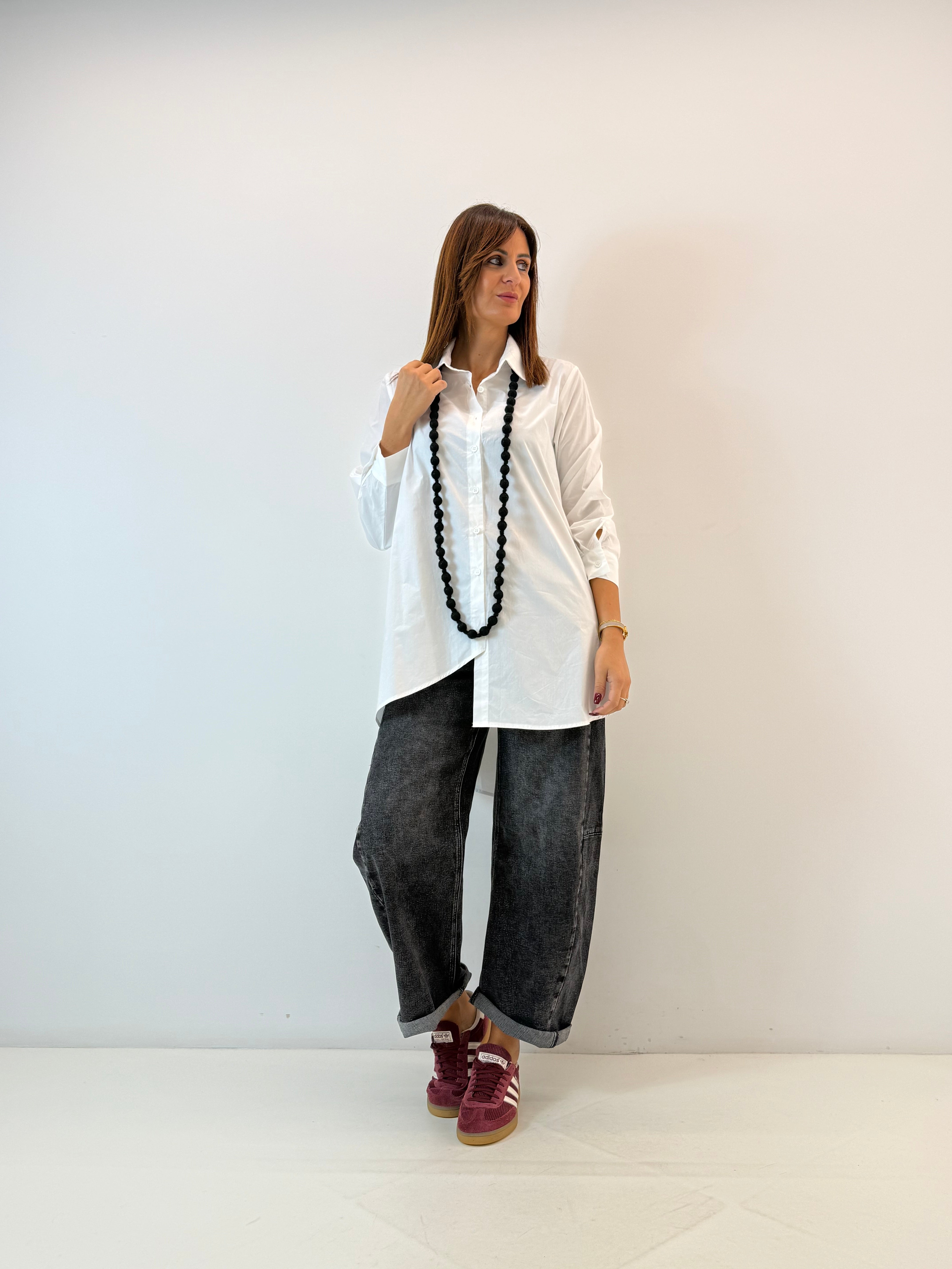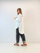 Camicia over in cotone, con colletto a polo. Orlo asimmetrico. Chiusura con bottoni. Comoda vestibilità.