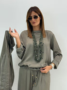 Blusa in satin di viscosa, con elastico in vita e coulisse regolabile.