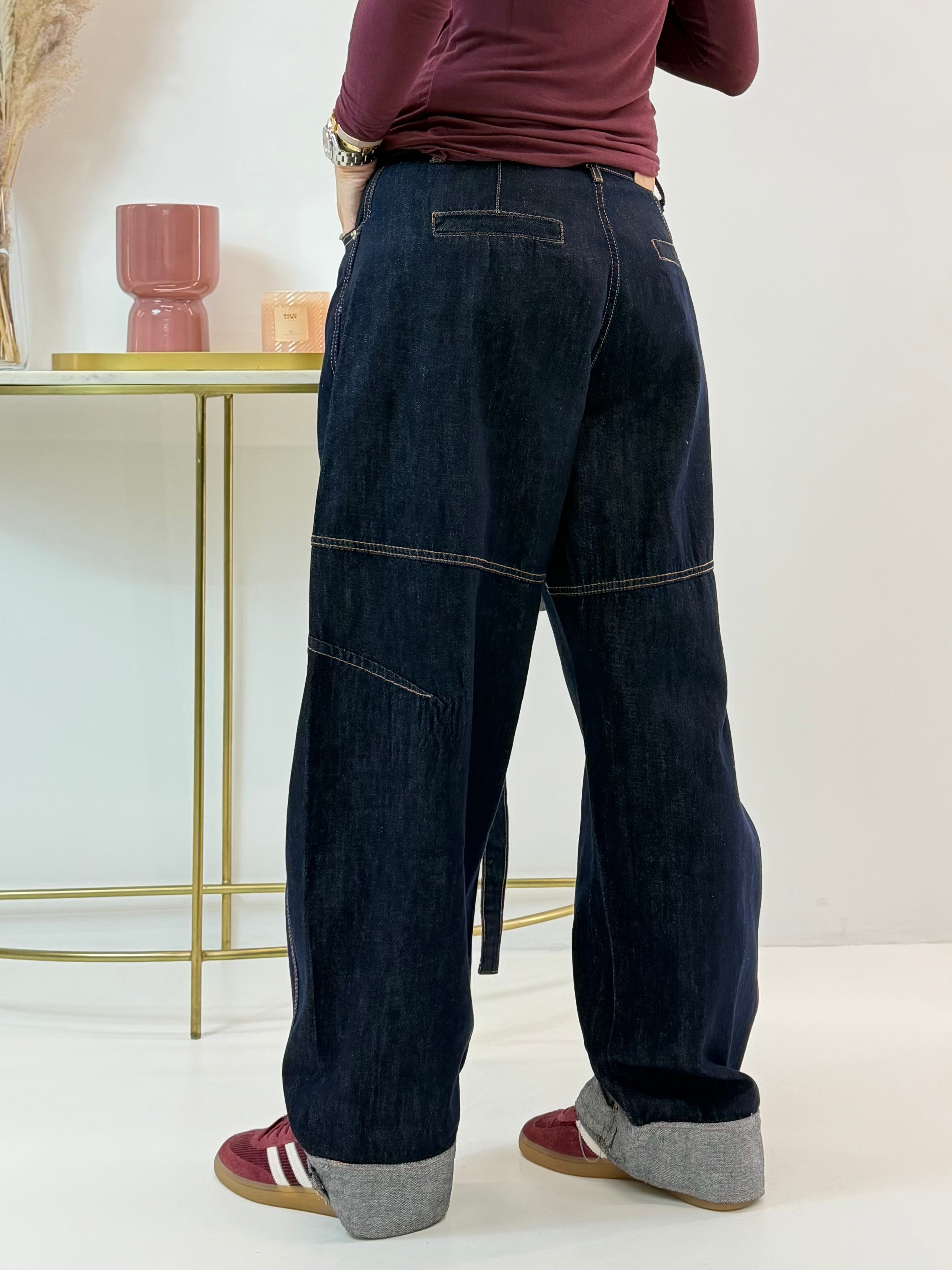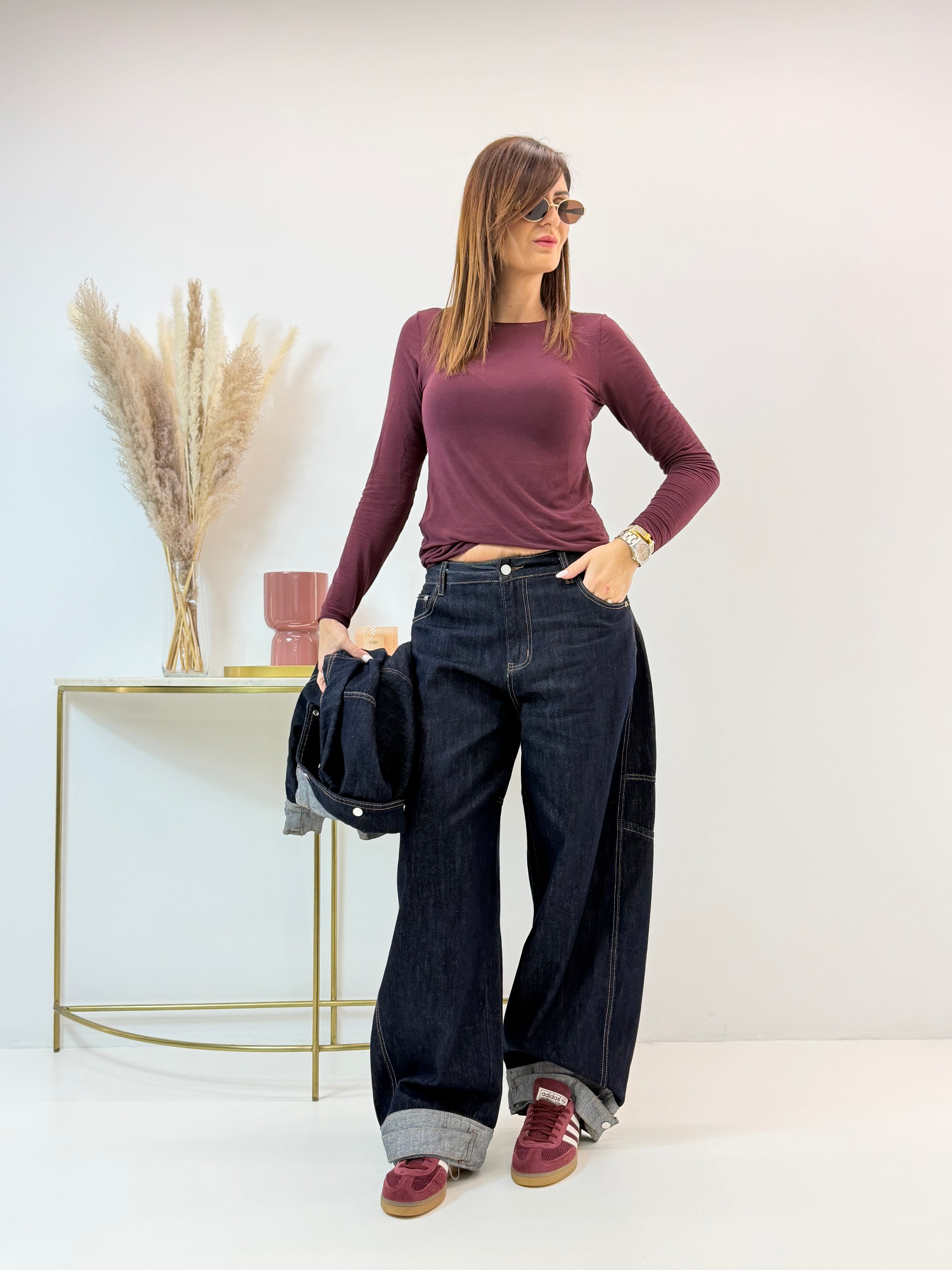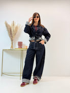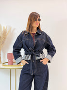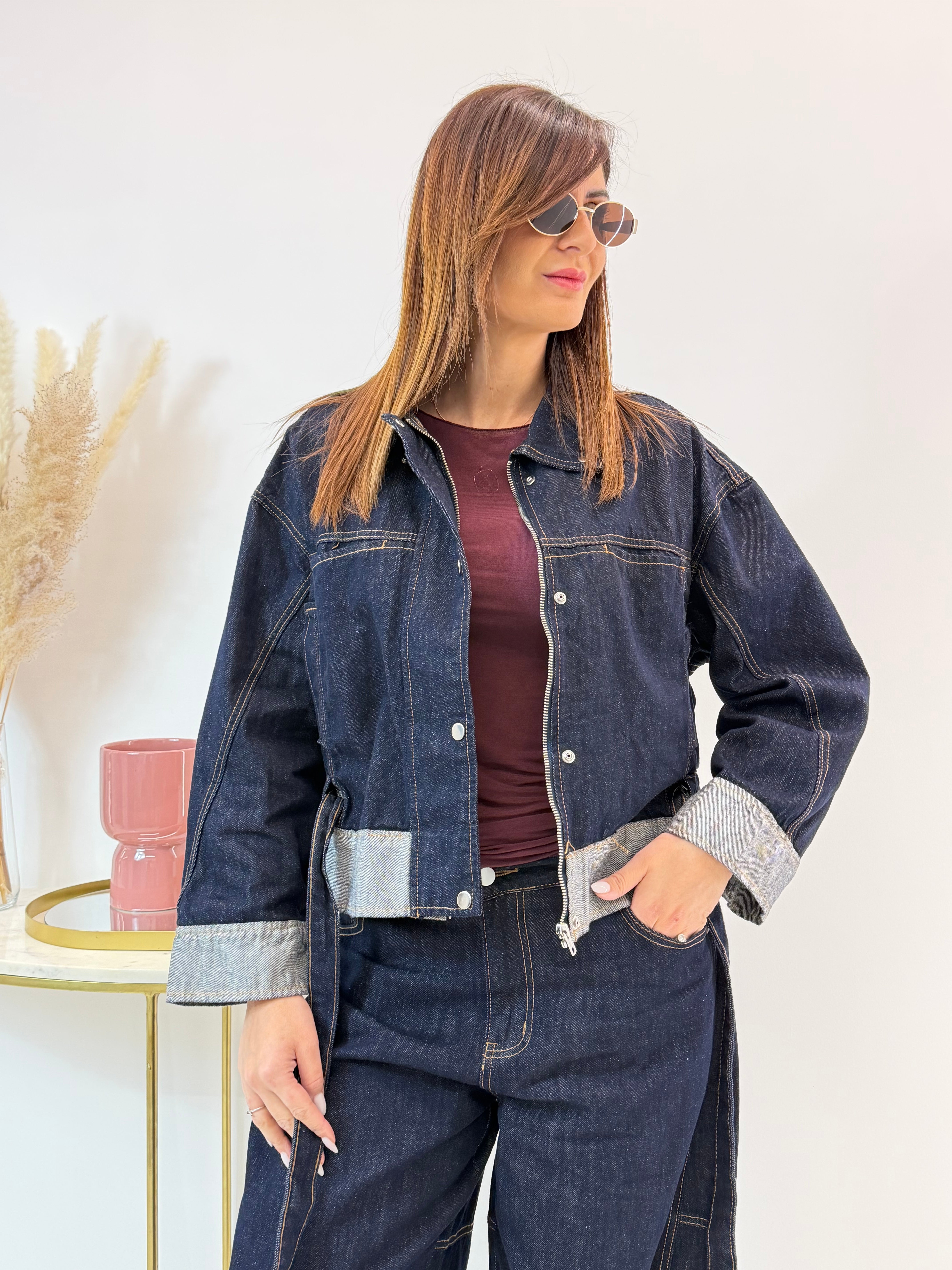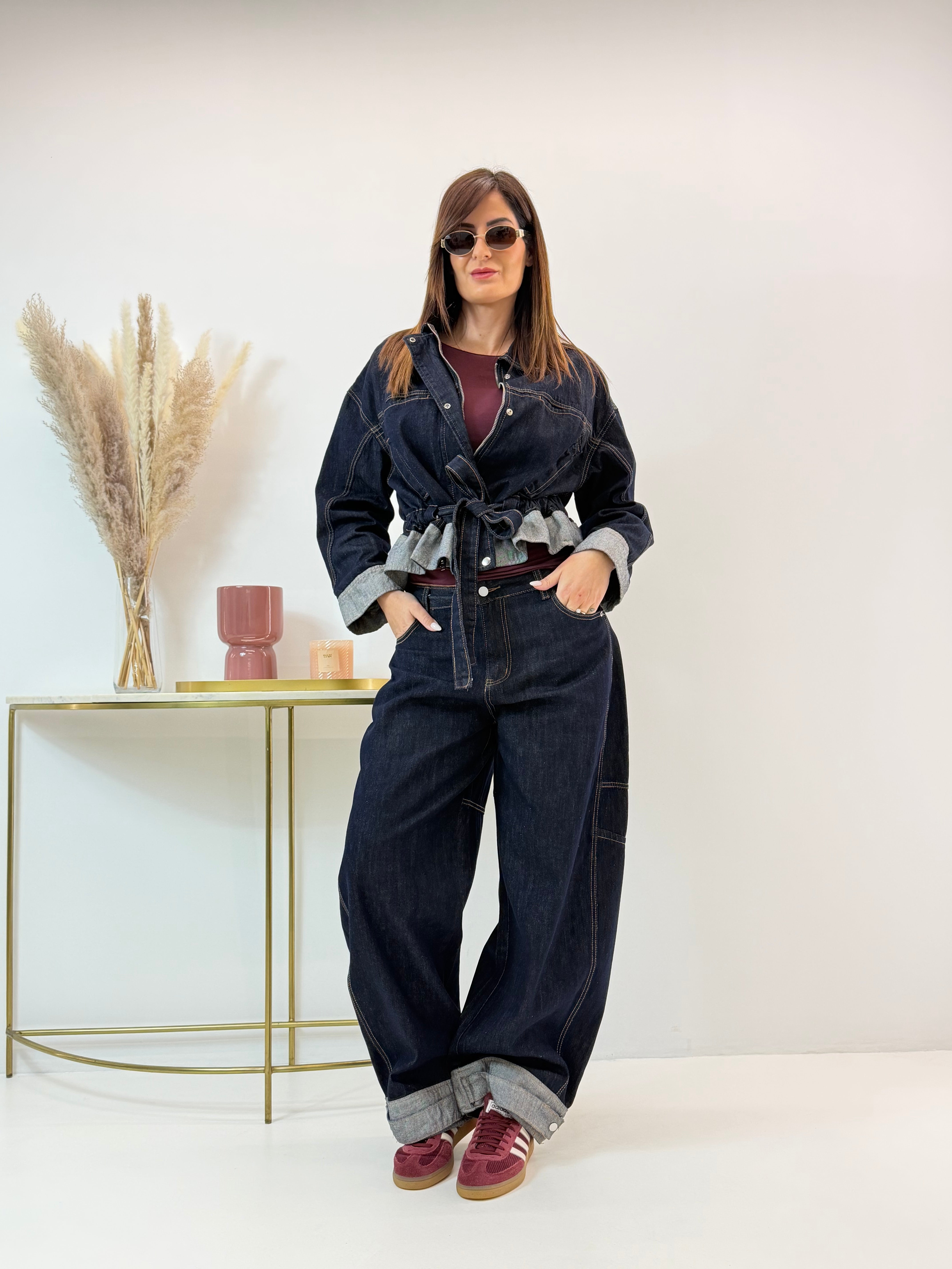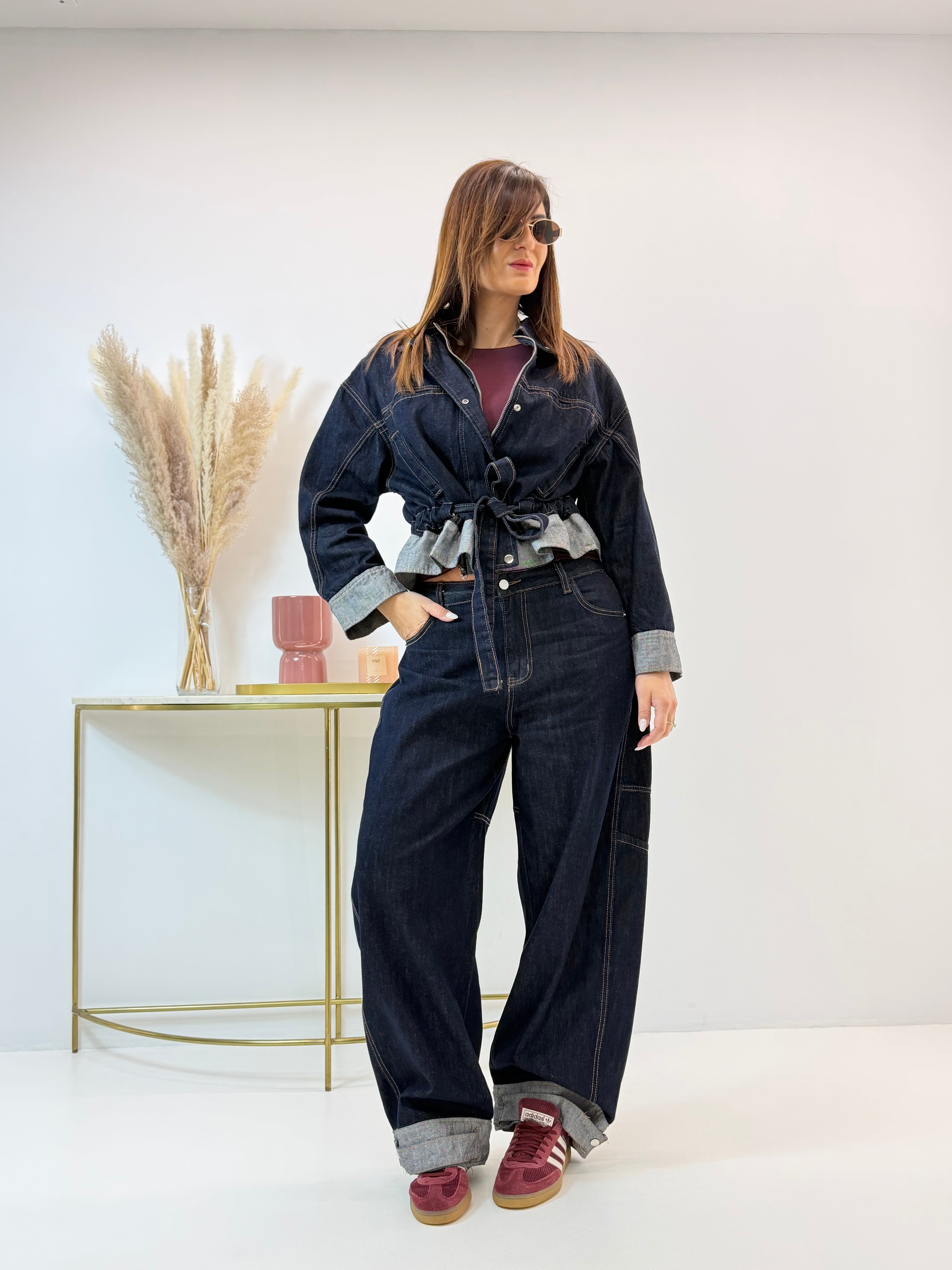 Coordinato composto da 2 pezzi: giacca in denim di cotone, finte tasche laterali, chiusura con zip e bottoni, coulisse regolabile in vita. Orlo e polsino risvoltati. Pantaloni modello barrel, a vita alta, passanti per cintura e chiusura con zip e bottone, finte tasche a filetto dietro, tasche a lunetta davanti. Orlo con risvolto e dettaglio con bottoncino.