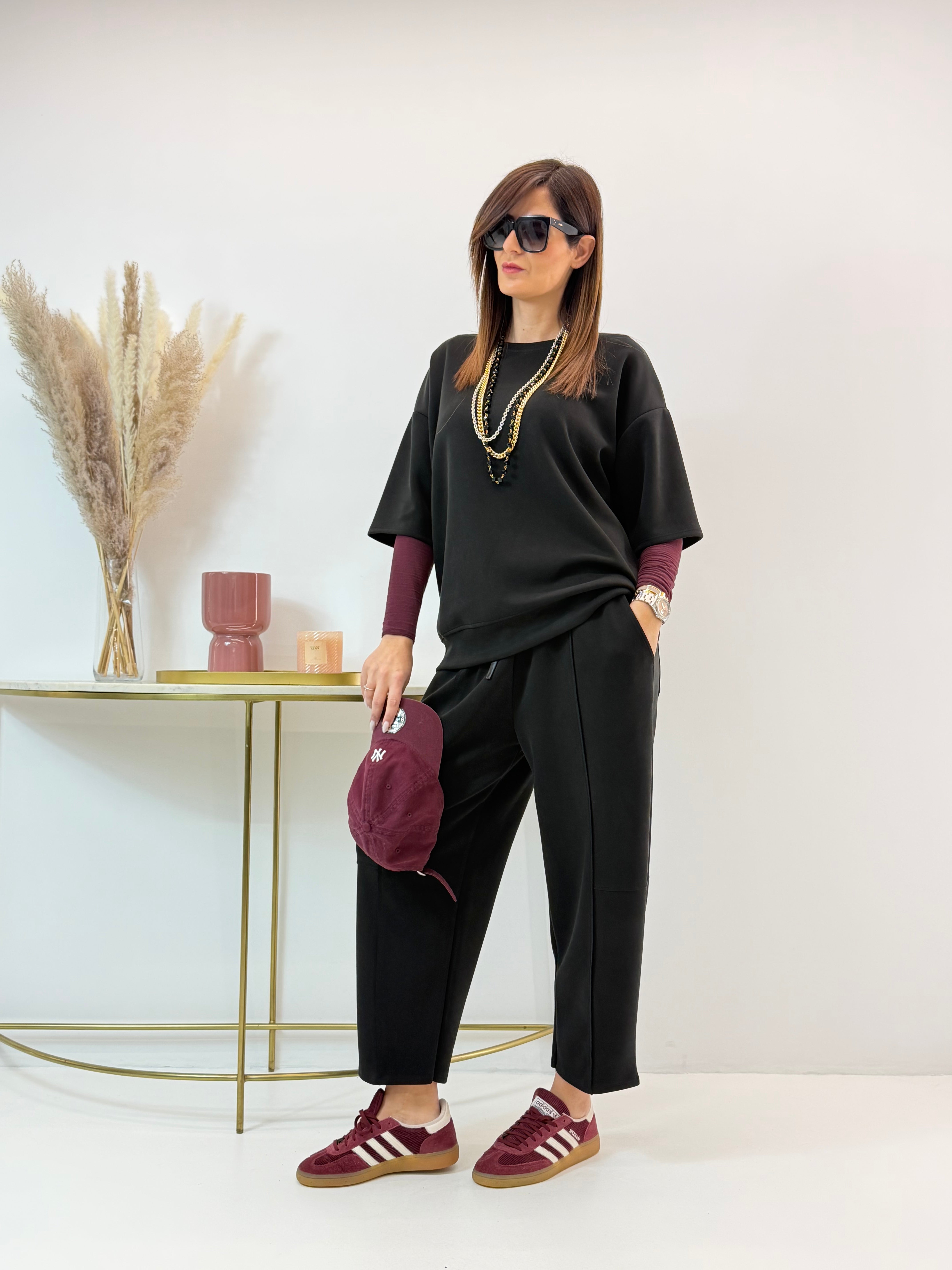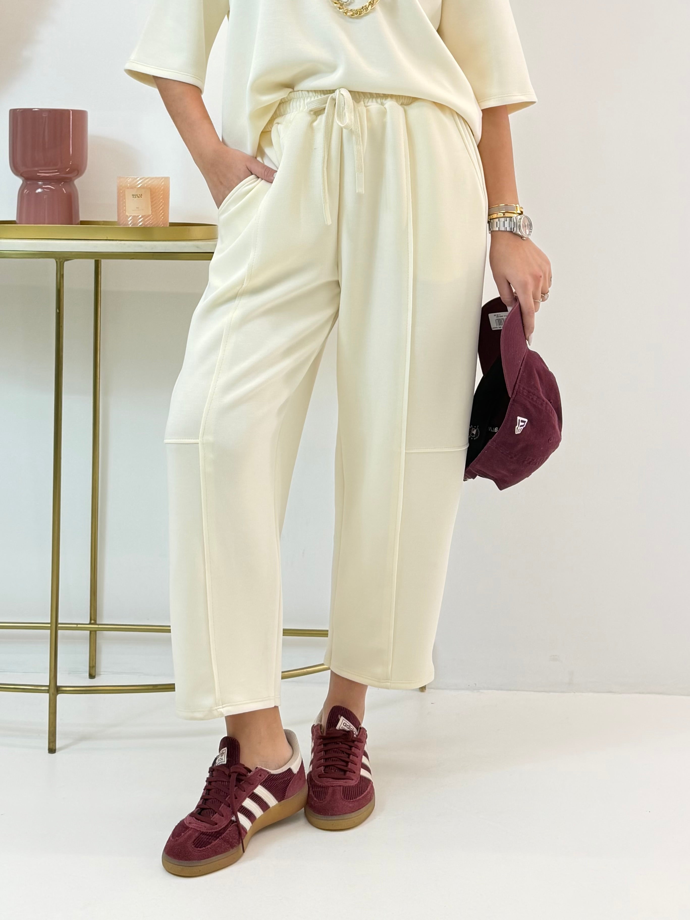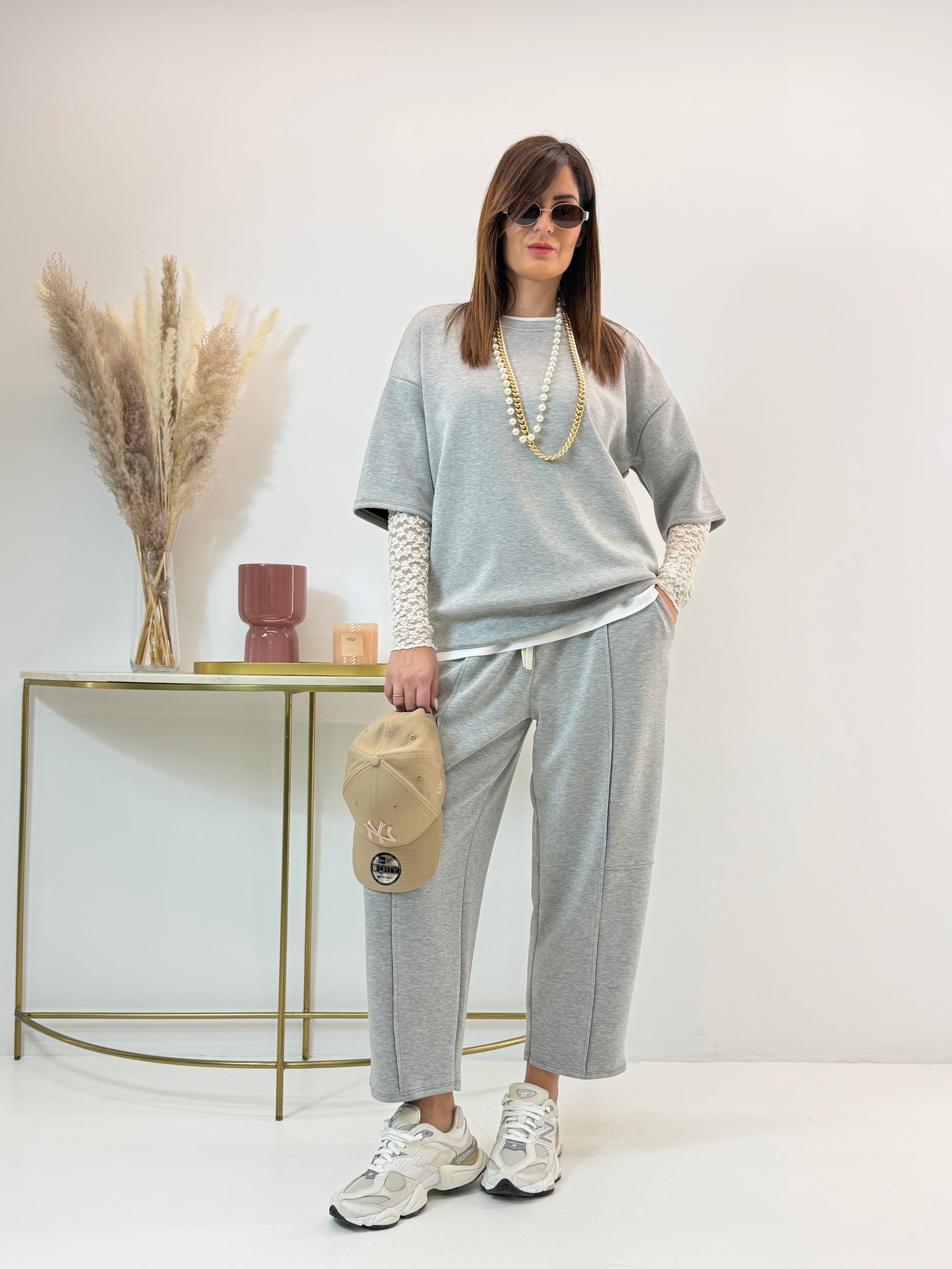 Tuta in neoprene, felpa con scollo rotondo, manica corta. Pantalone con elastico in vita e coulisse regolabile, tasche laterali a lunetta. Modello barrel, si ristringe alla caviglia.
