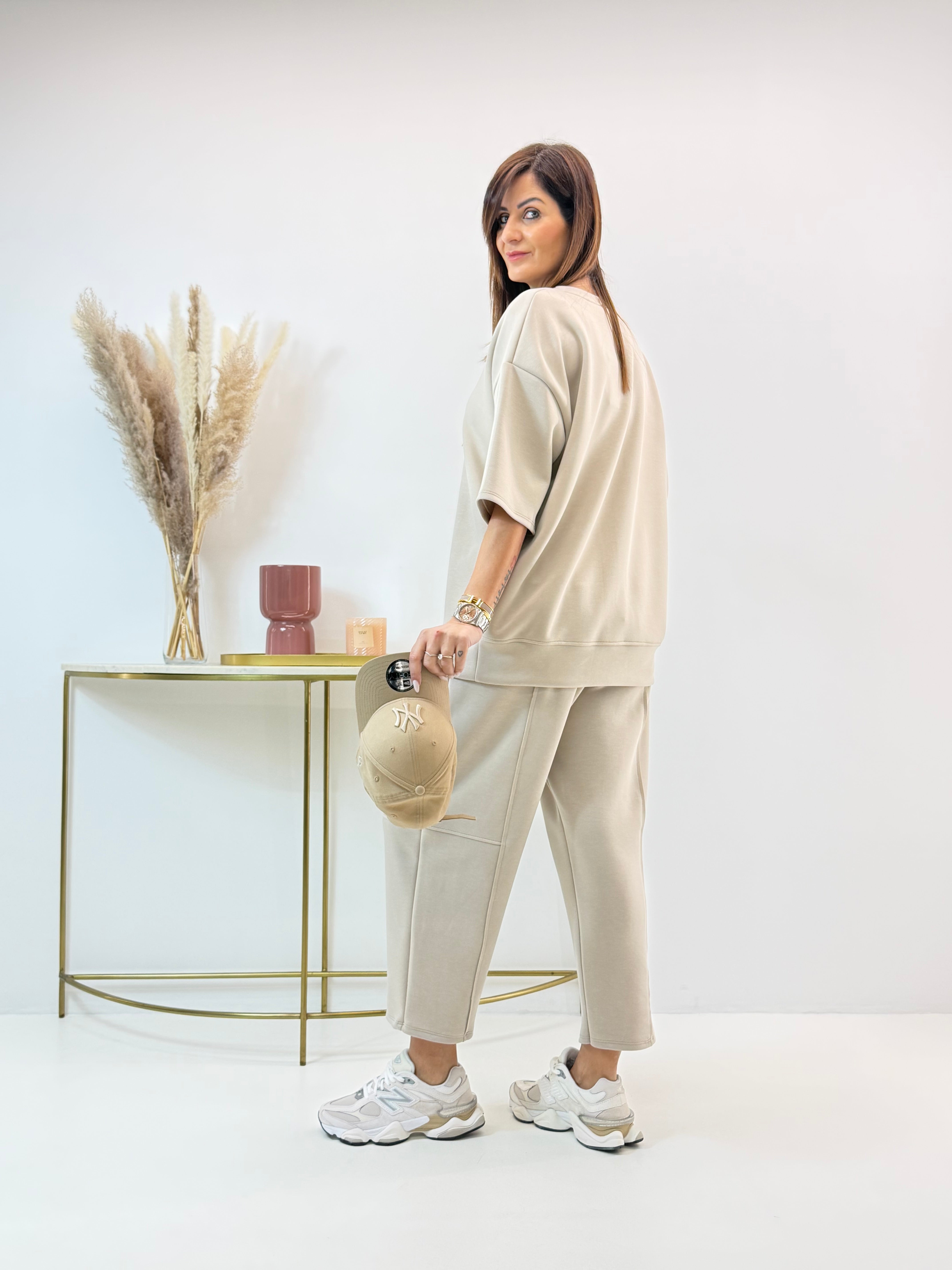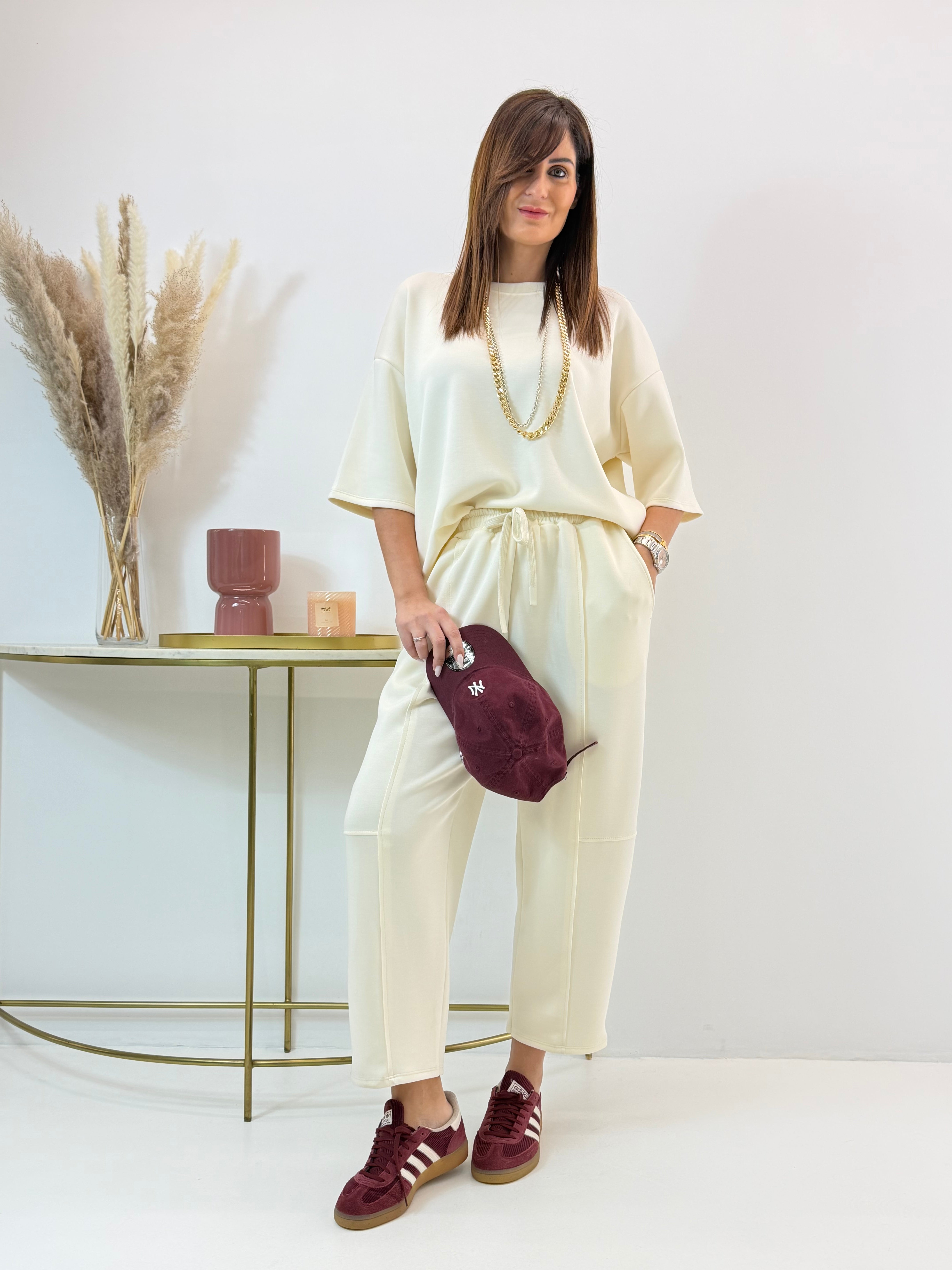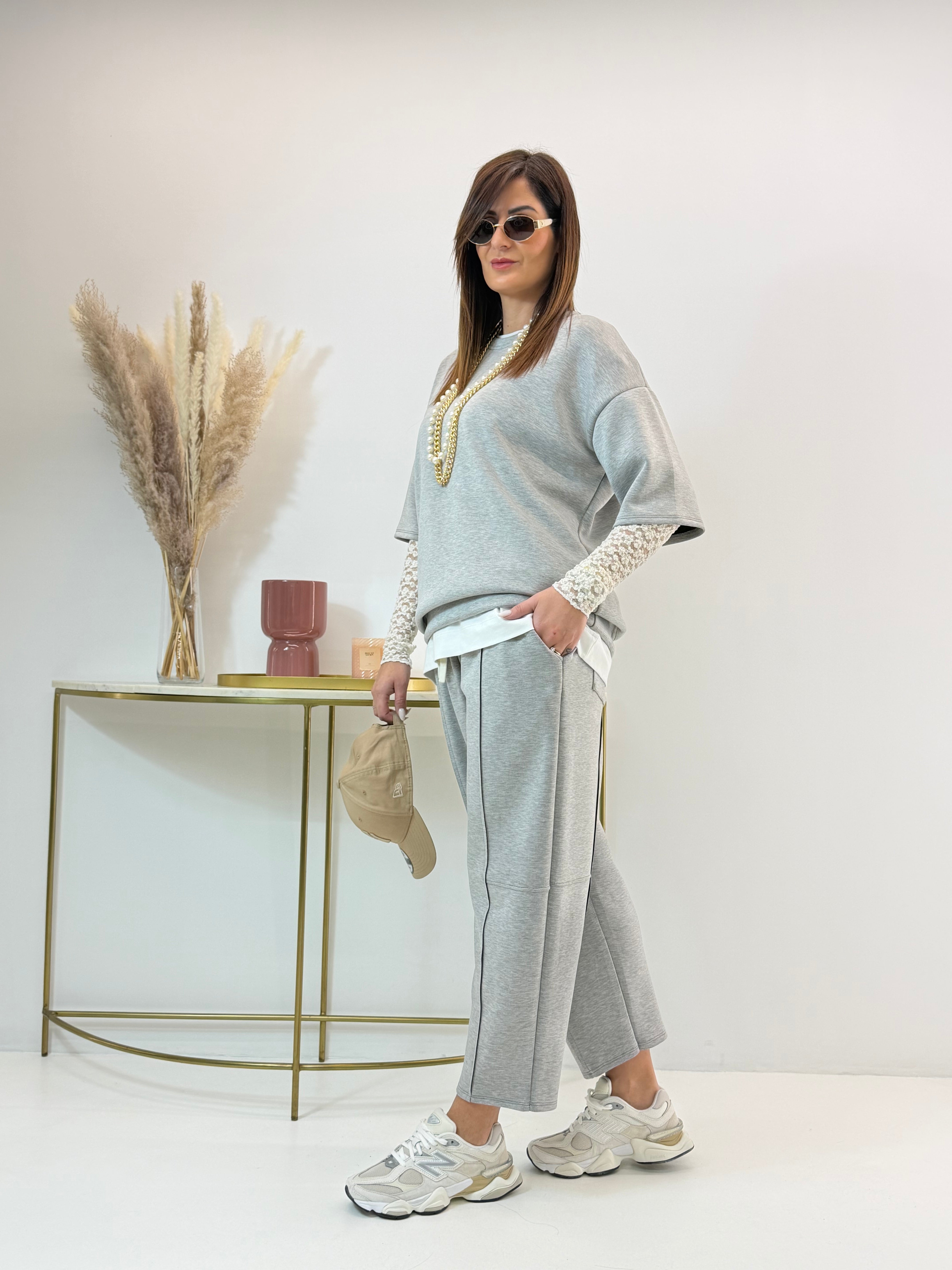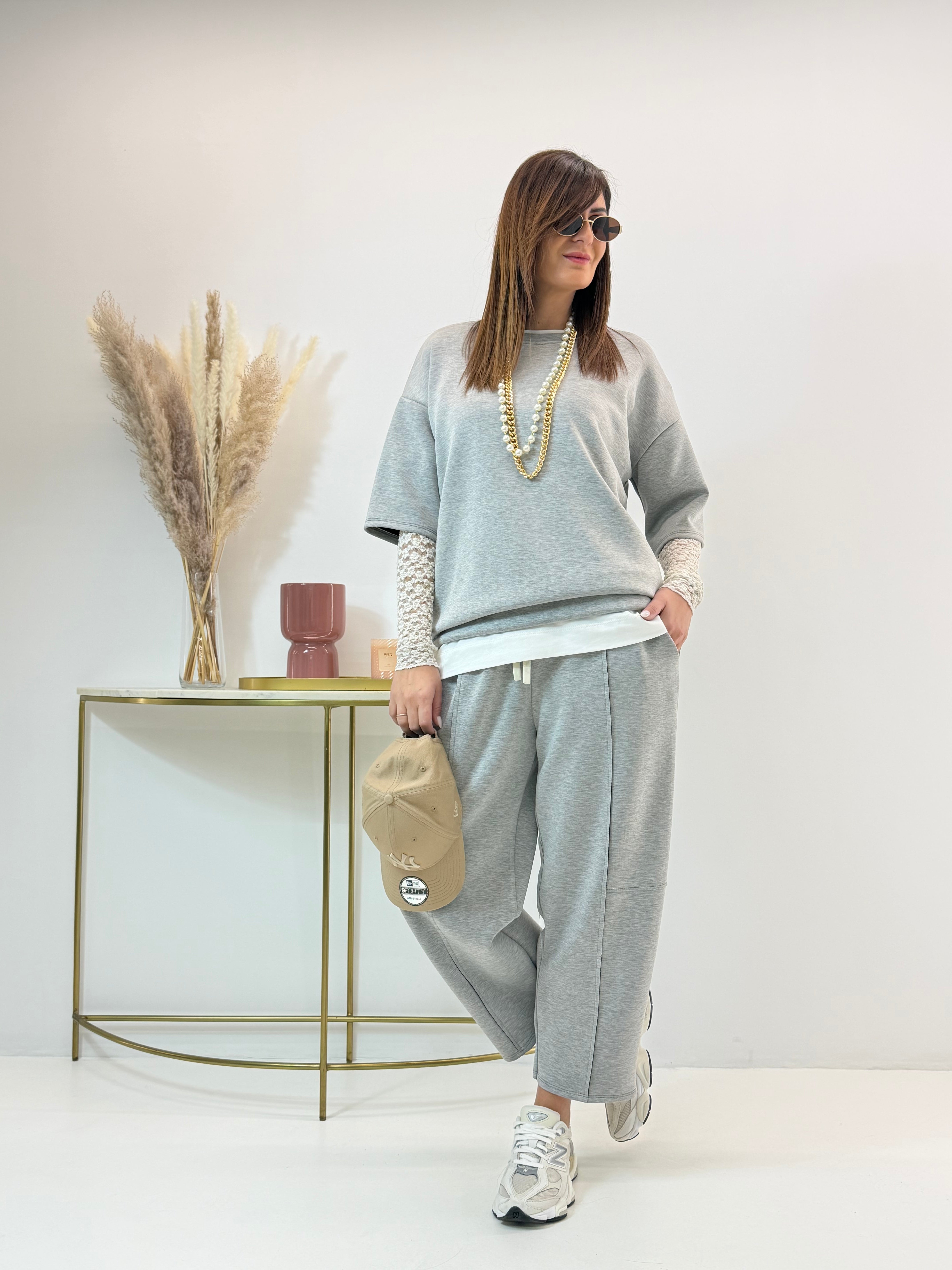 Tuta in neoprene, felpa con scollo rotondo, manica corta. Pantalone con elastico in vita e coulisse regolabile, tasche laterali a lunetta. Modello barrel, si ristringe alla caviglia.