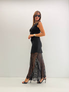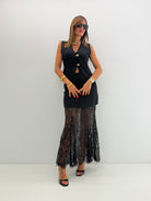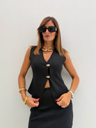 Coordinato composto da 2 pezzi: gilet e gonna. Gilet con lavorazione a costine, in misto viscosa, chiusura davanti con 2 bottoni a clip, spacchetto finale. Scollo a V. Senza maniche. Gonna in pizzo composta da due pezzi, parte sopra in misto viscosa con elastico in vita e parte sotto in pizzo, senza chiusure.