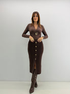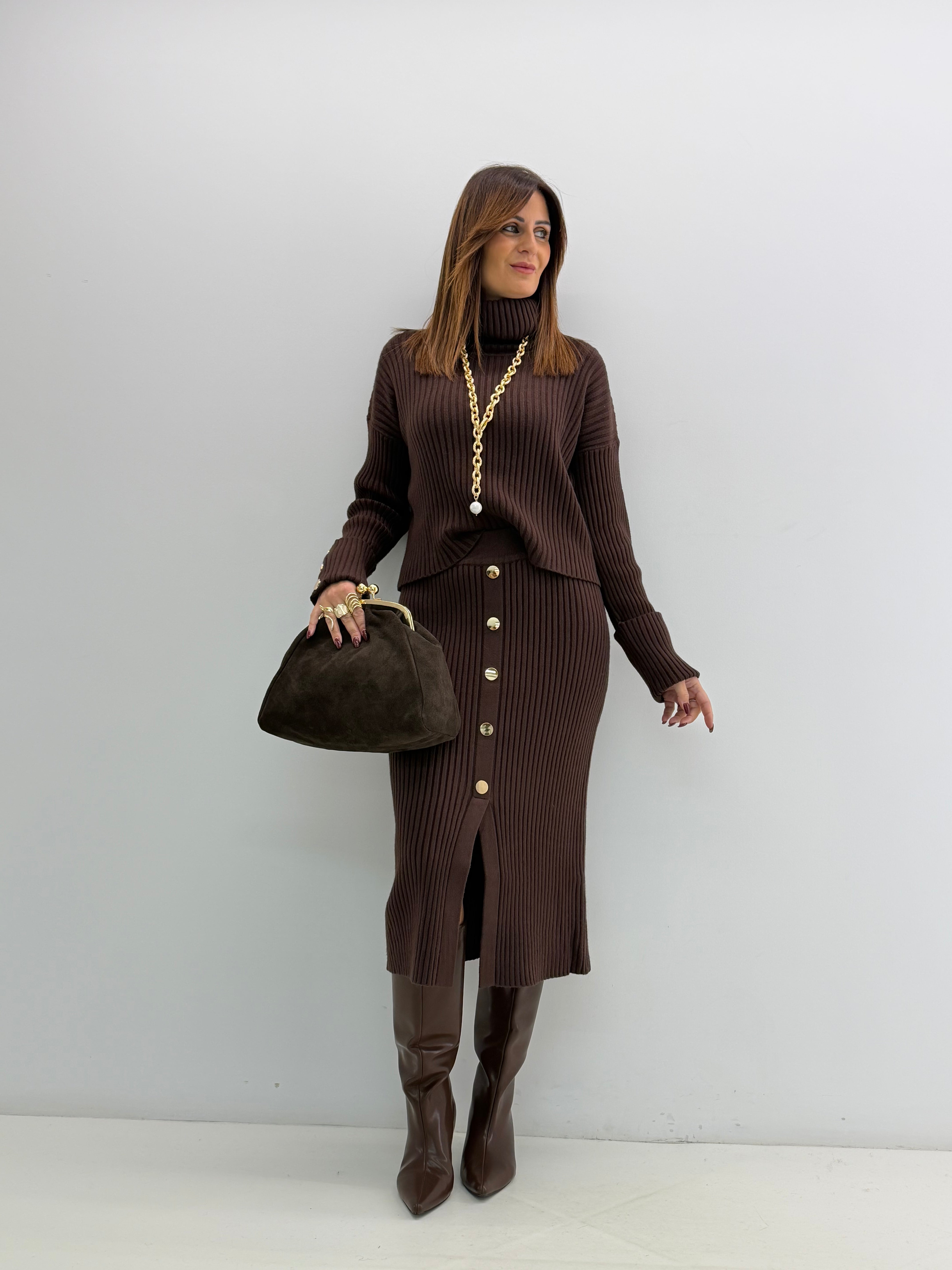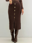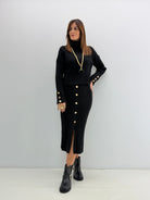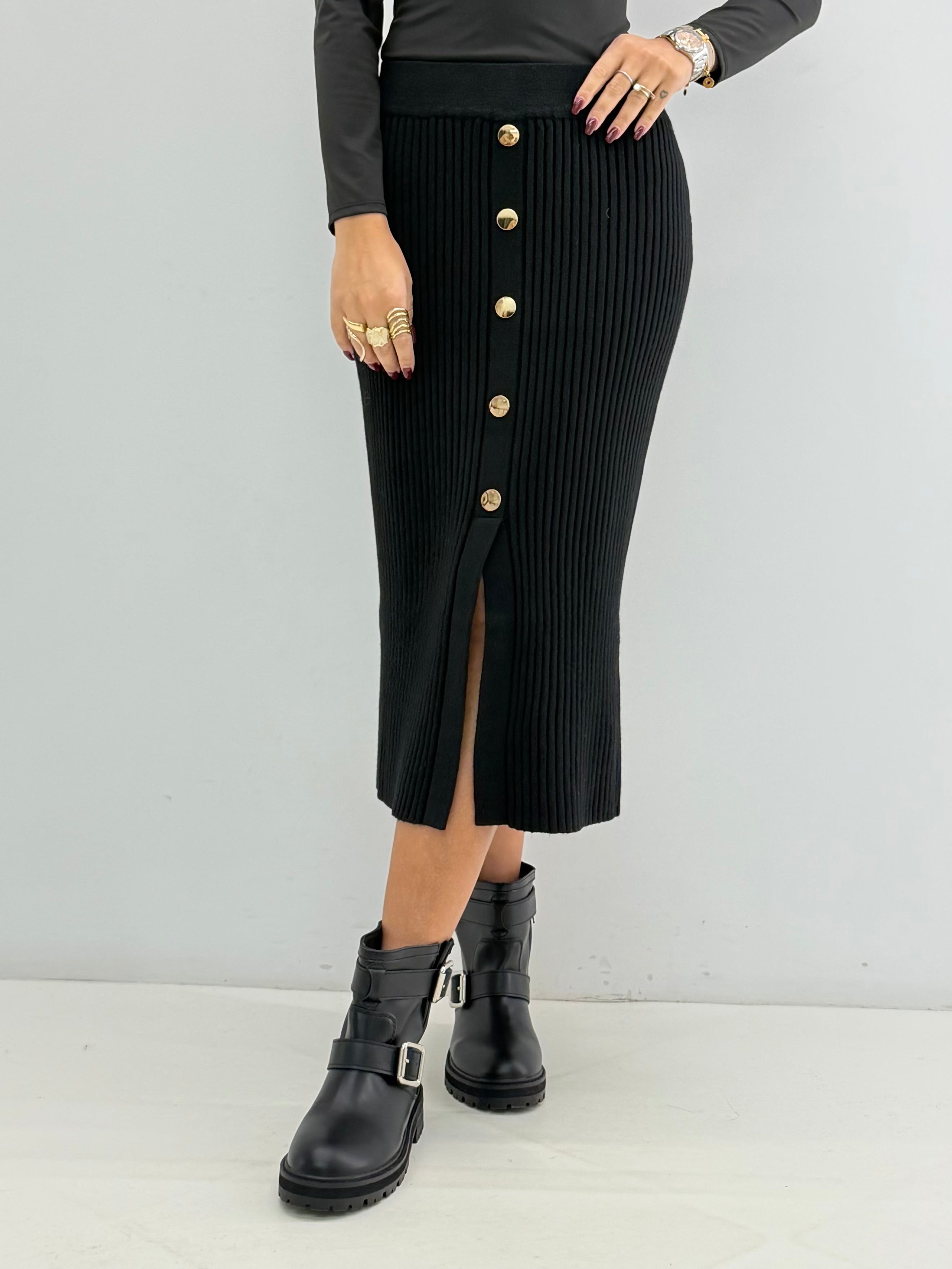 Gonna midi in maglia, elastico in vita. Spacco centrale, applicazione di finti bottoni gold.