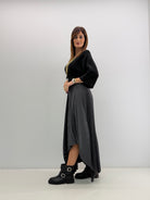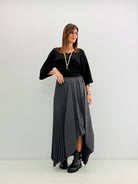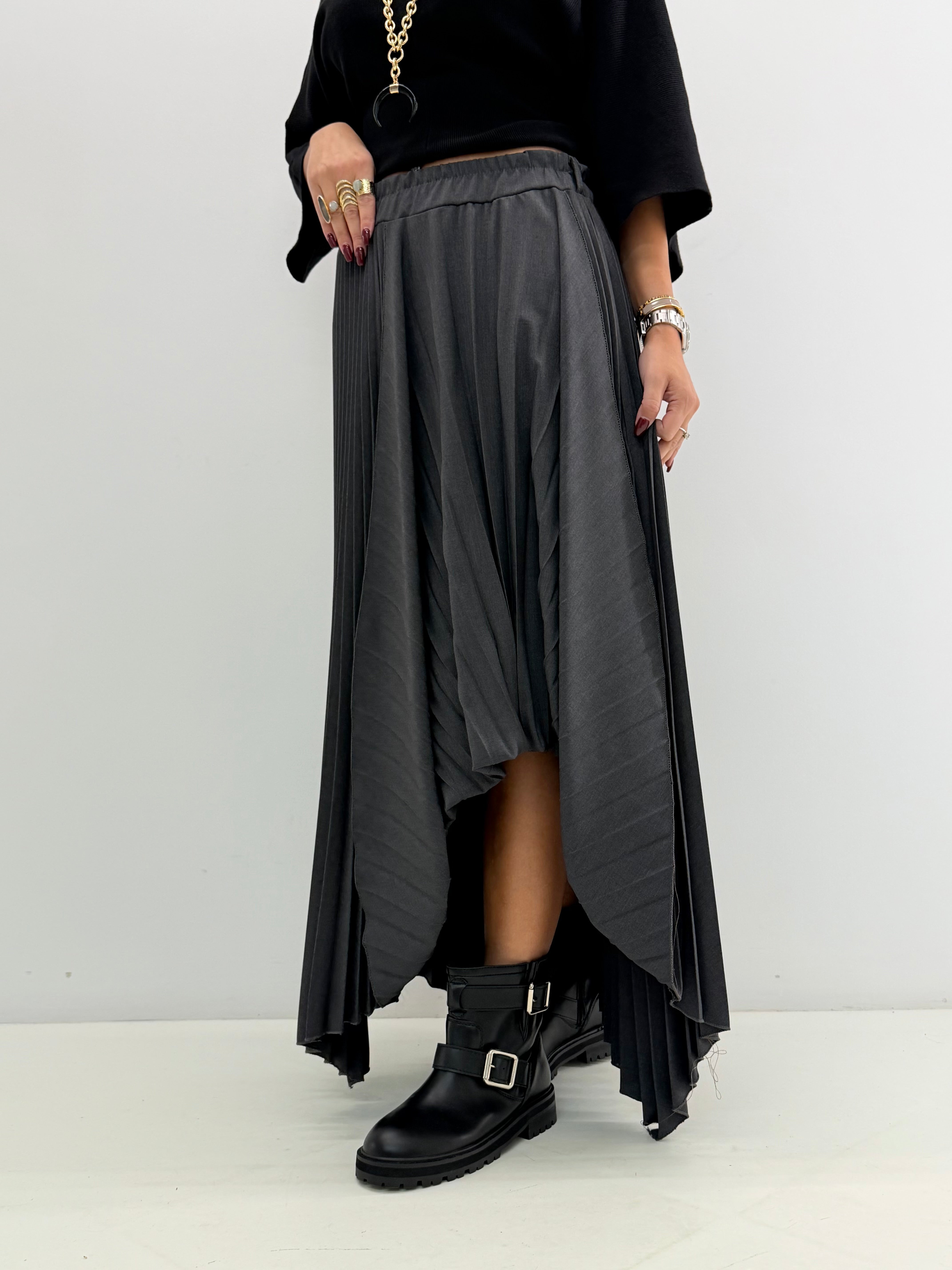 Gonna a pieghe con elastico in vita. Taglio asimmetrico e passanti per cintura.