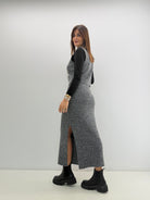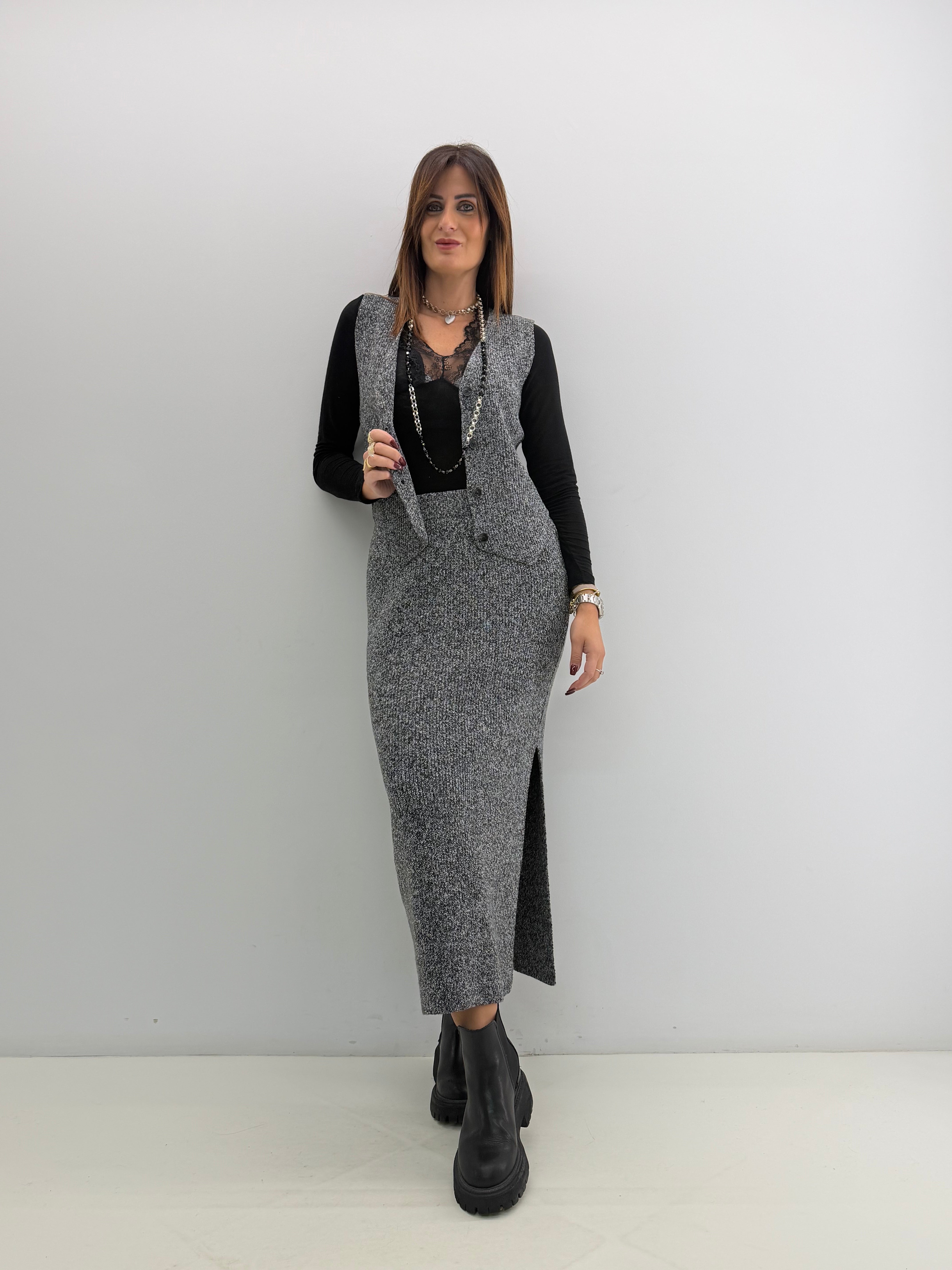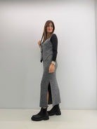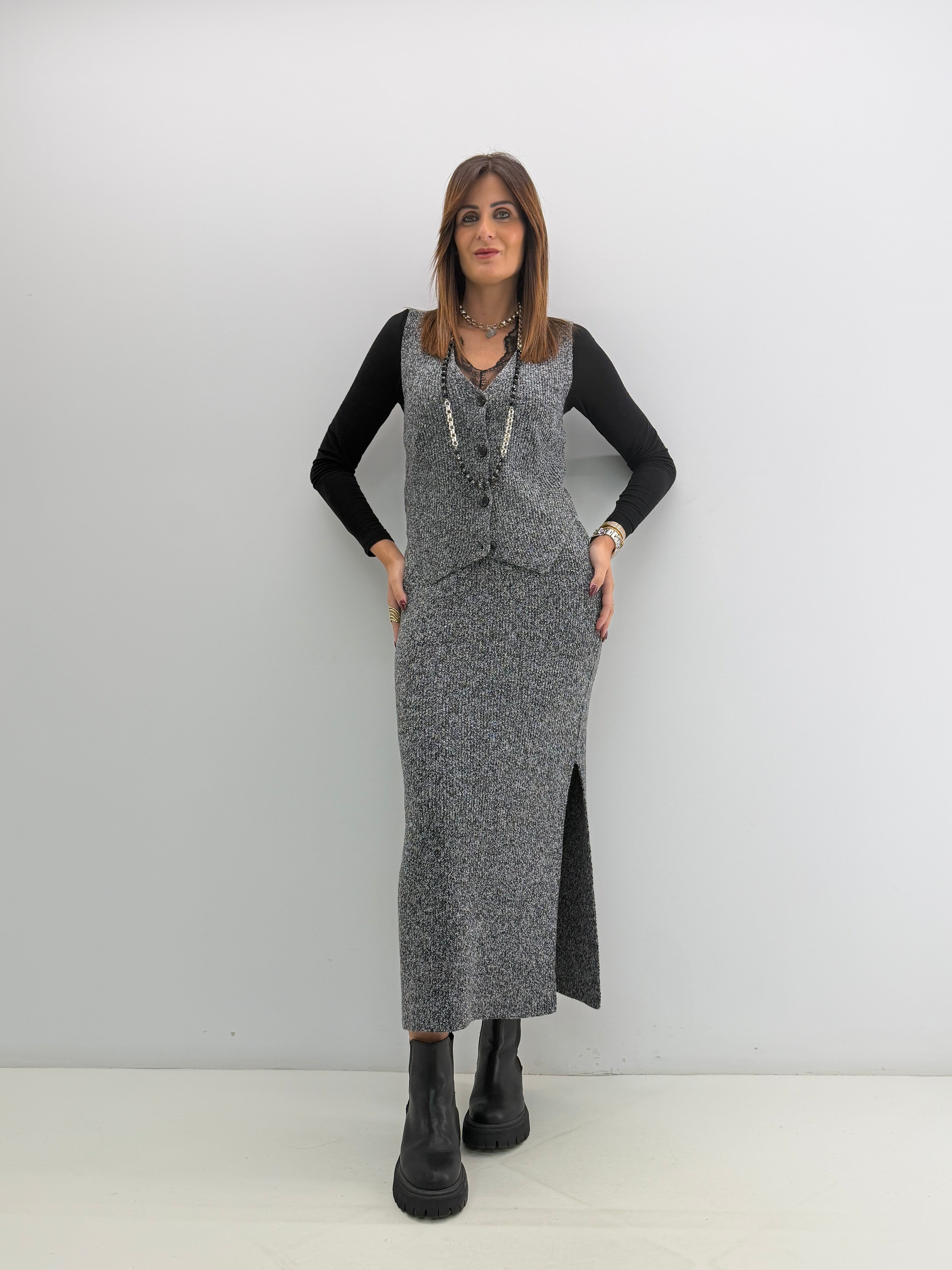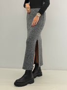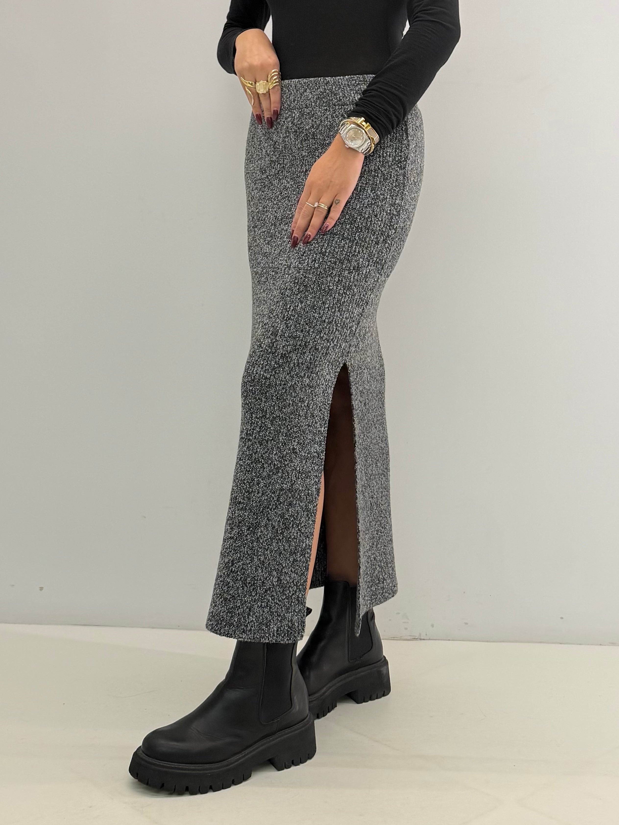 Gonna midi in maglia, filato melangiato, elastico in vita. Spacco laterale