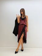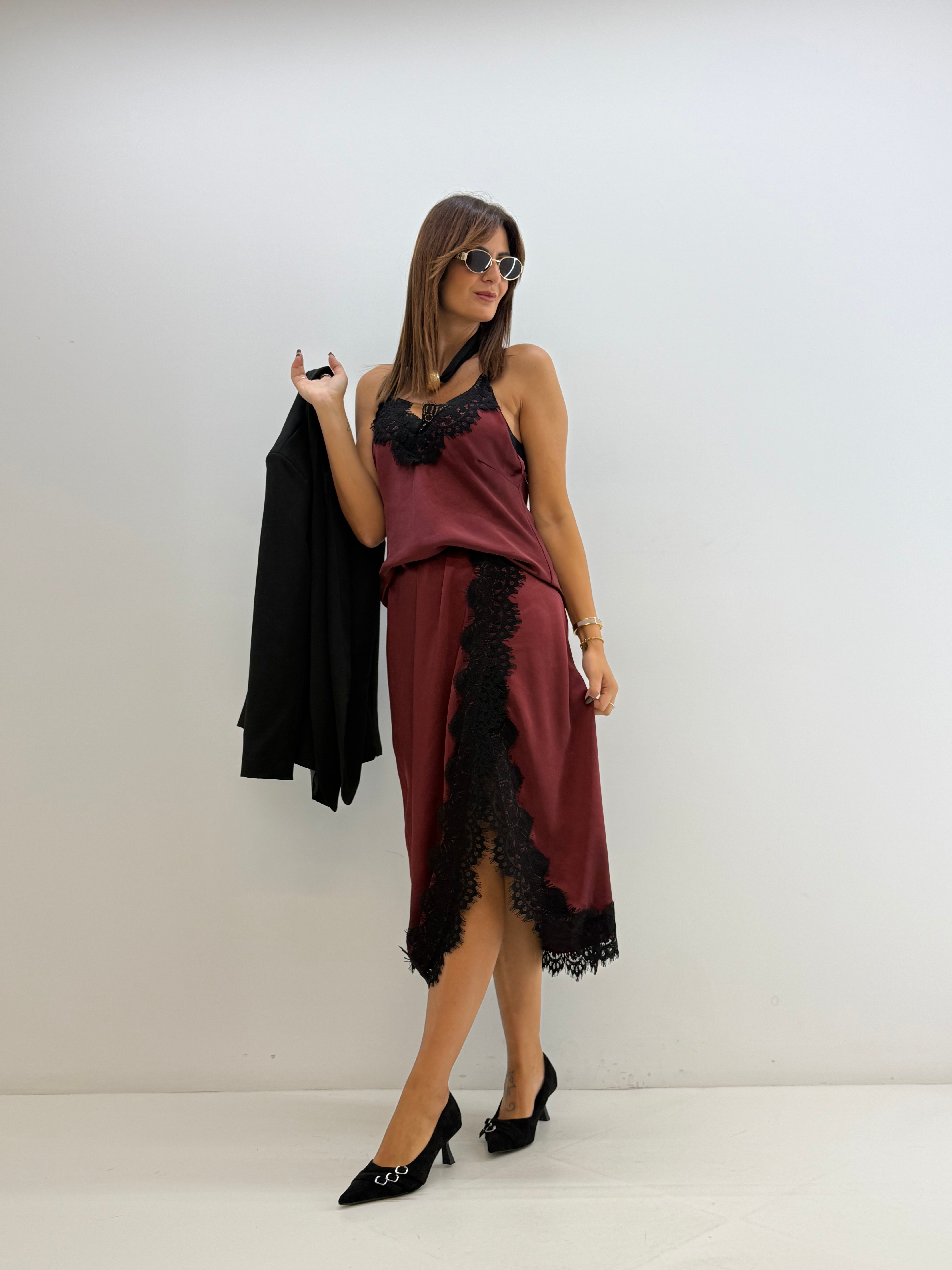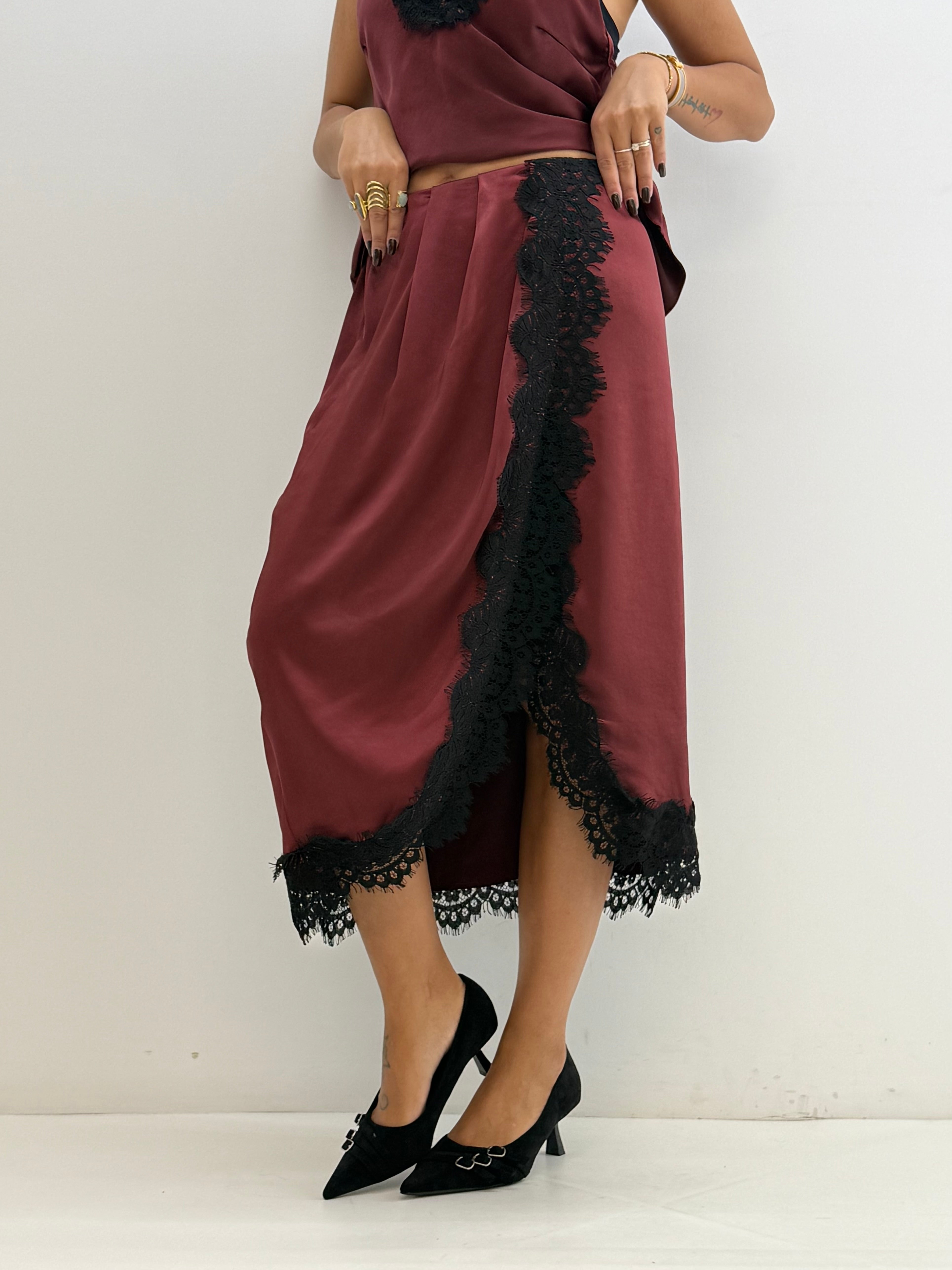Gonna effetto satin, con elastico in vita dietro, drappeggio sul davanti e inserto in pizzo. Spacco laterale.