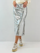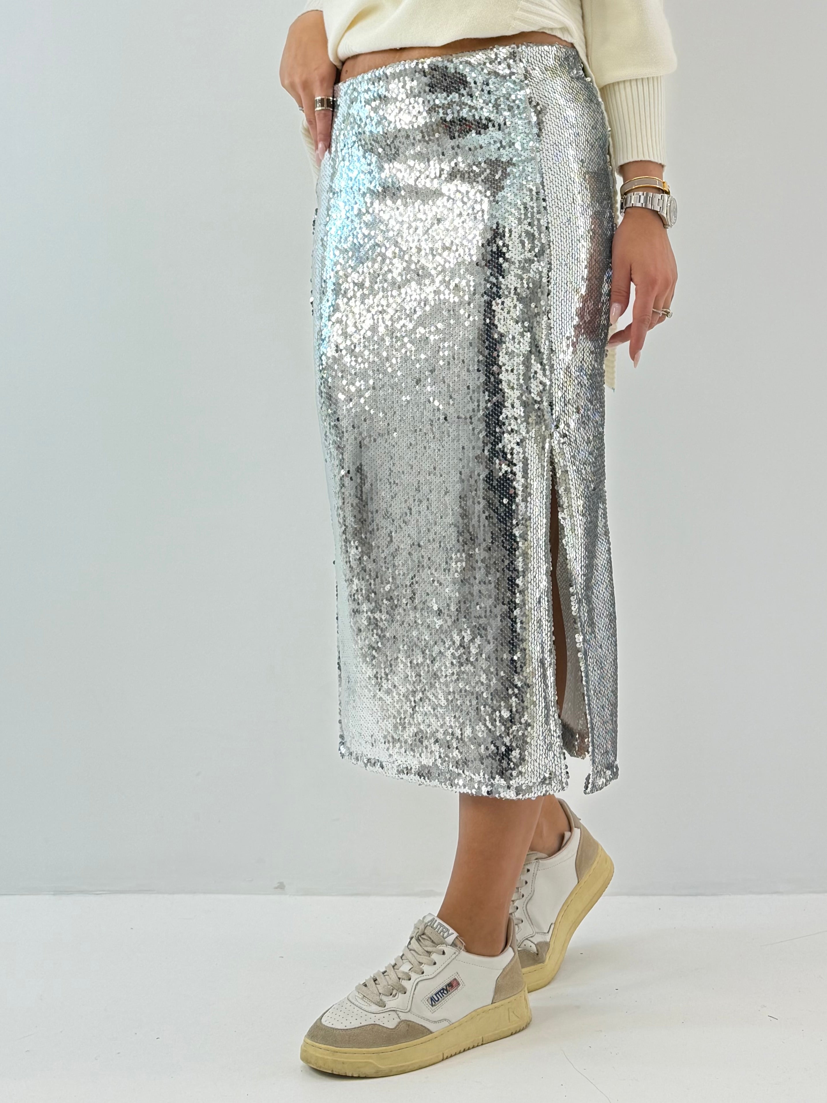 Gonna midi con paillettes, senza chiusure, elastico in vita e spacchetto laterale. Fodera interna
