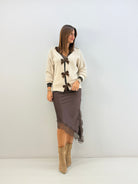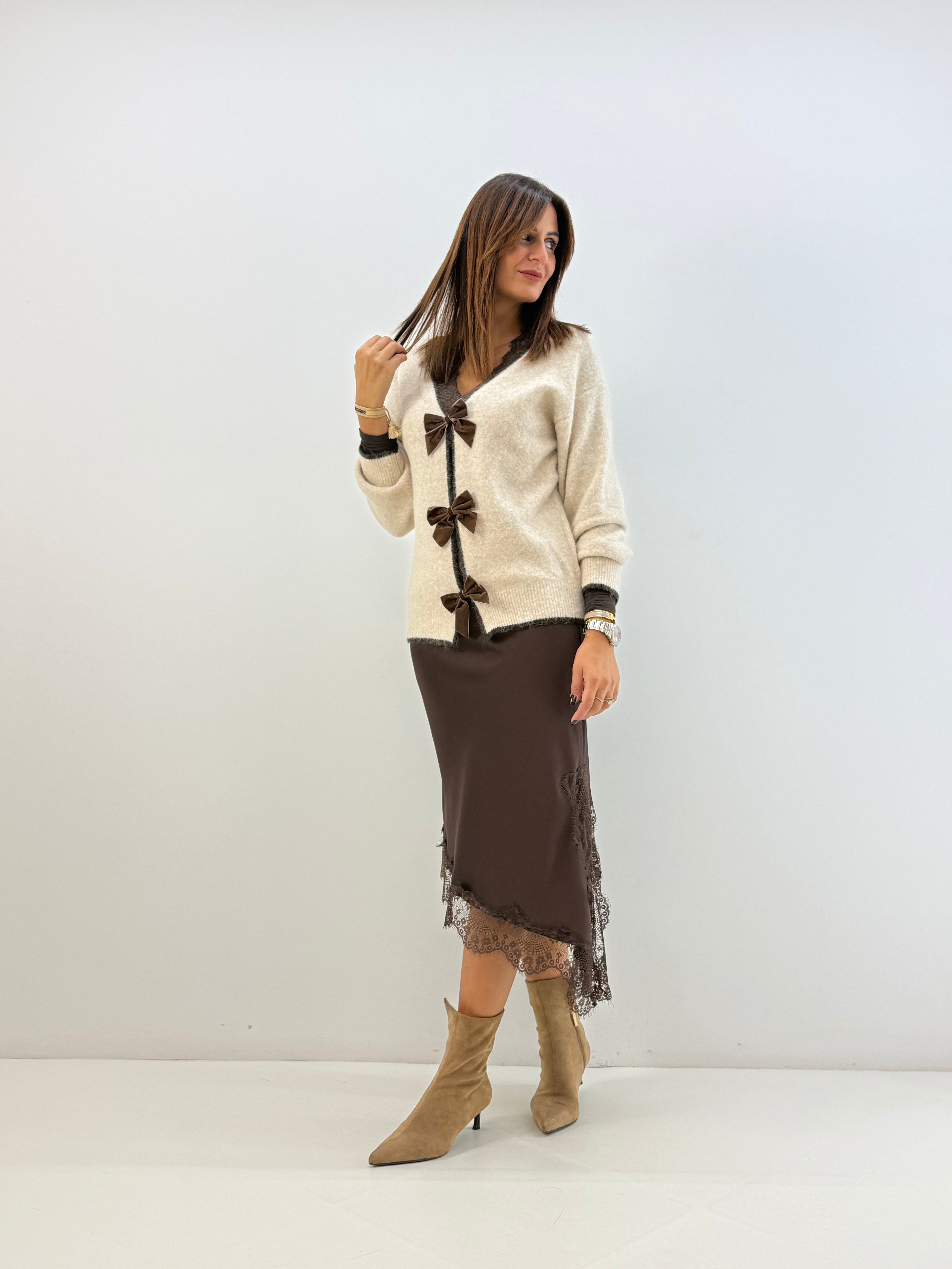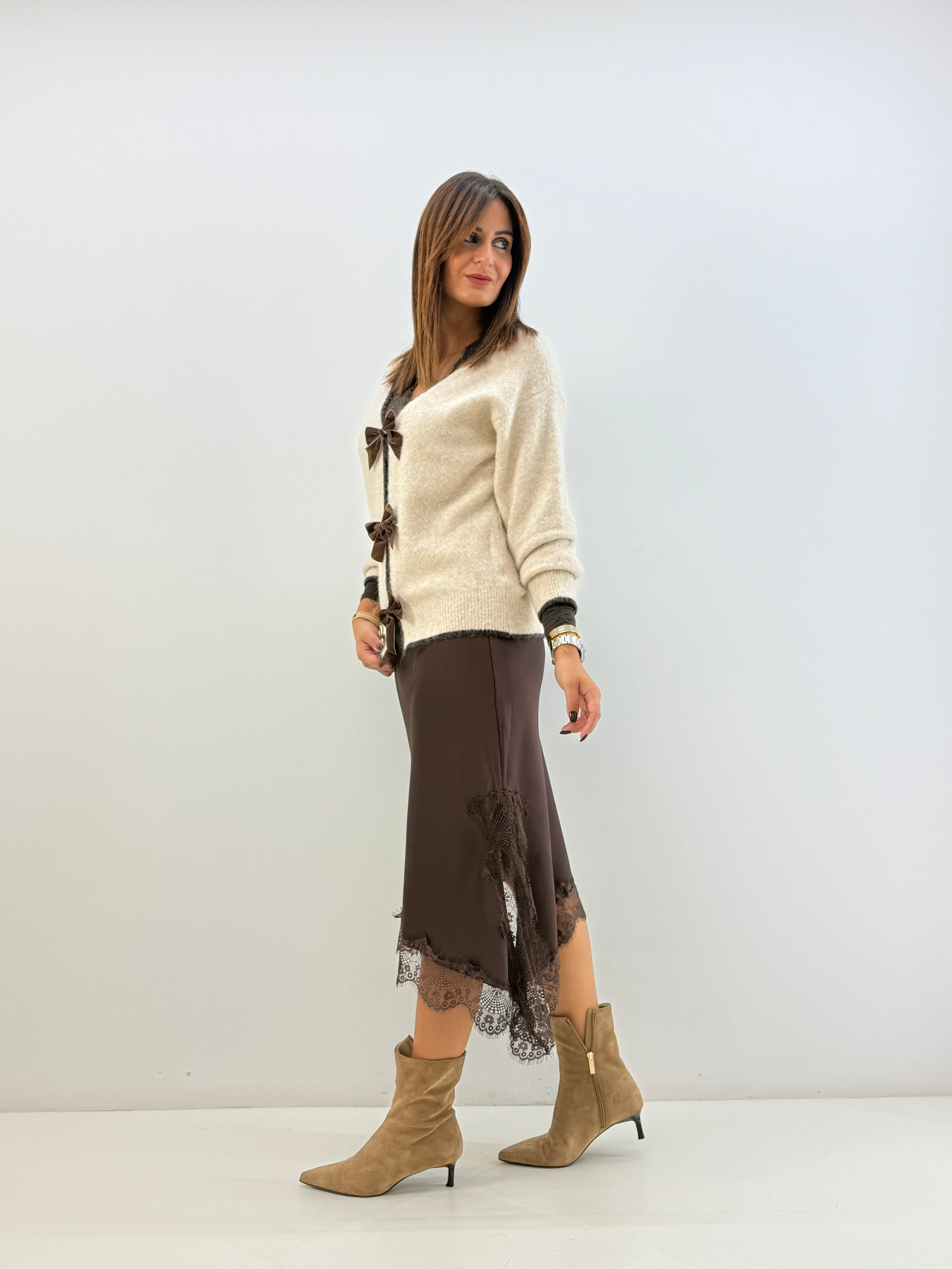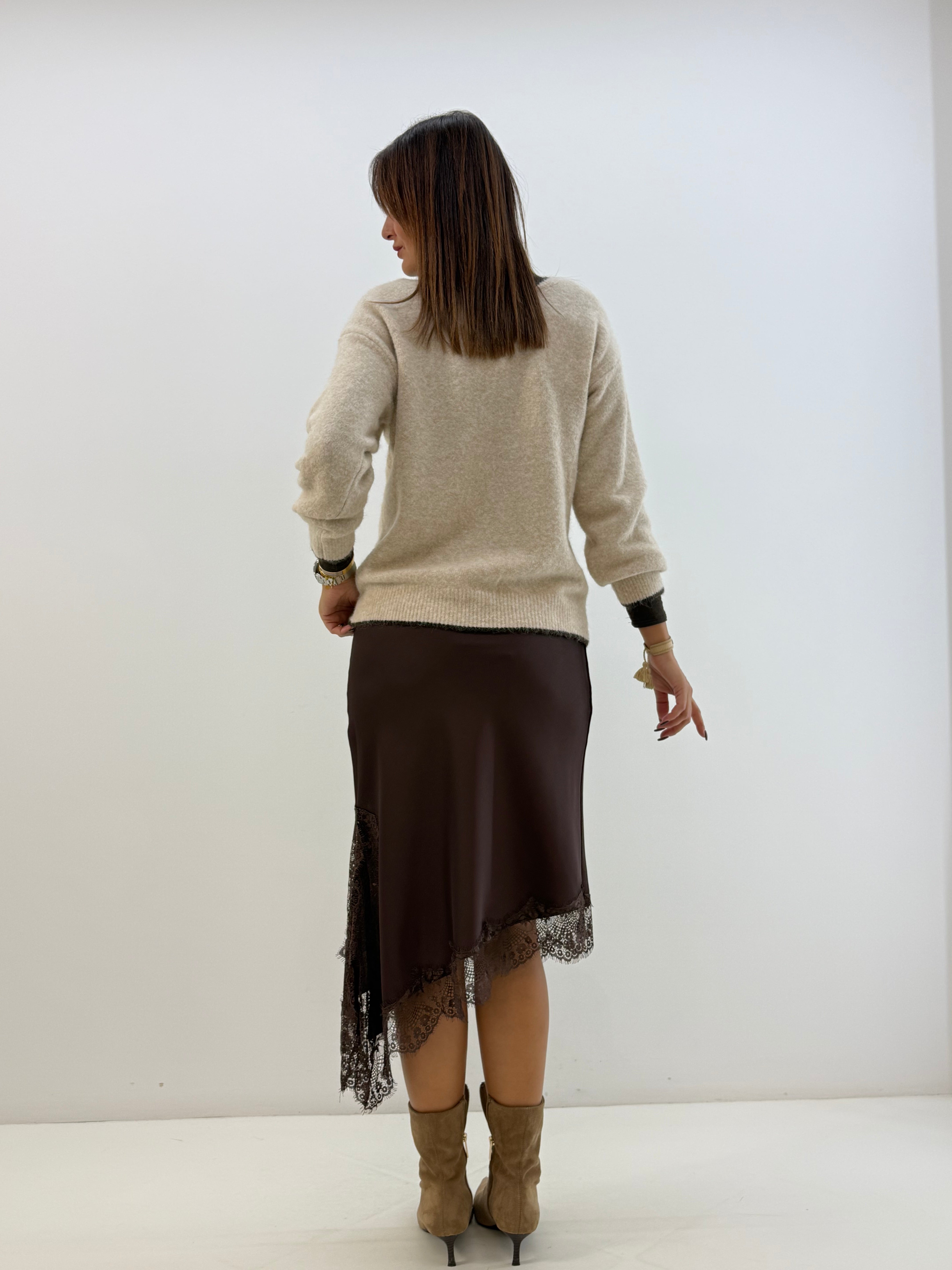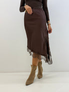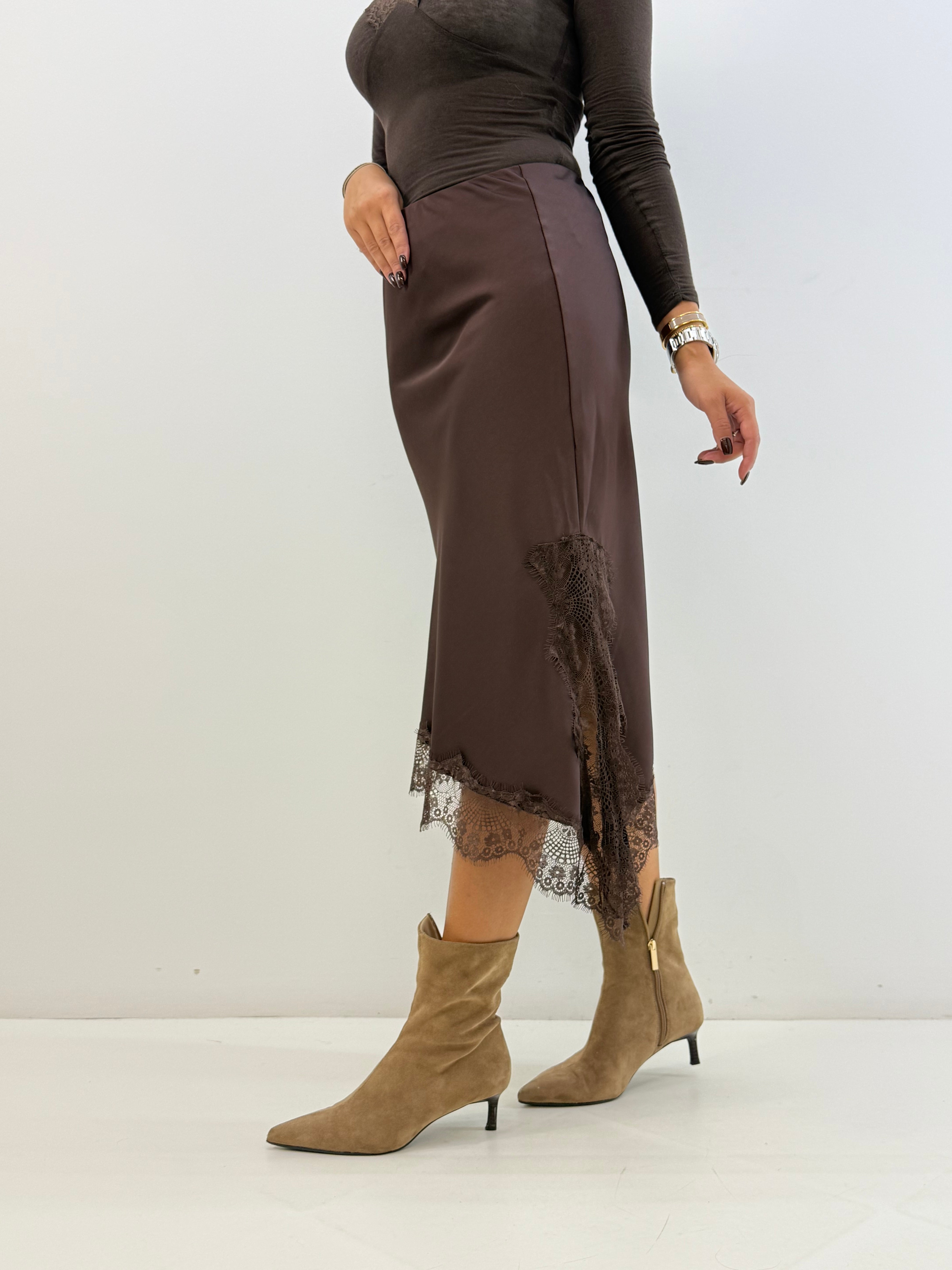 Gonna effetto satin, con elastico in vita dietro, taglio asimmetrico con inserto in pizzo. Vestibilità a taglie S/M -M/L