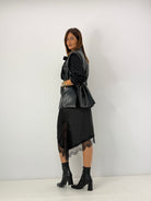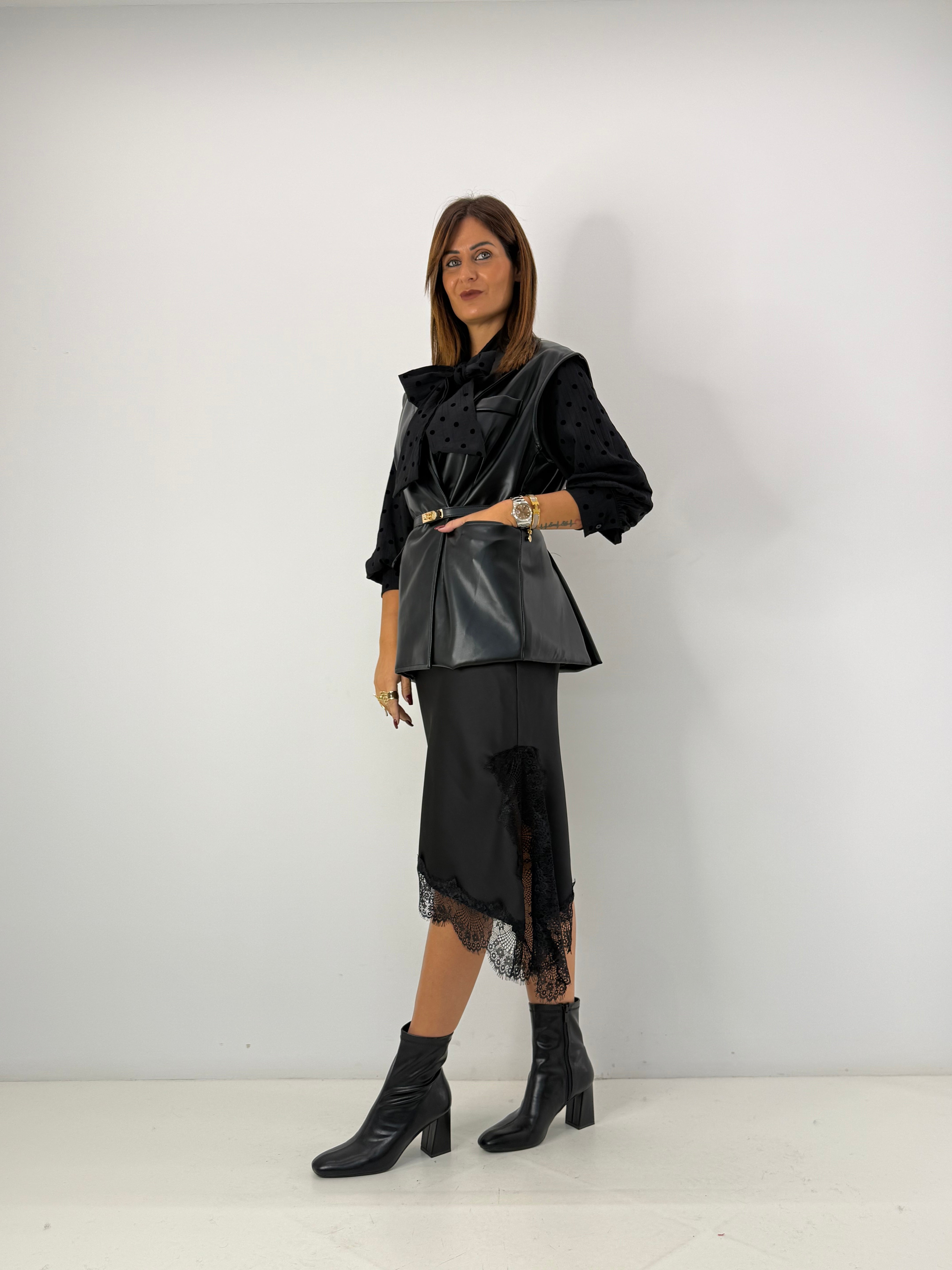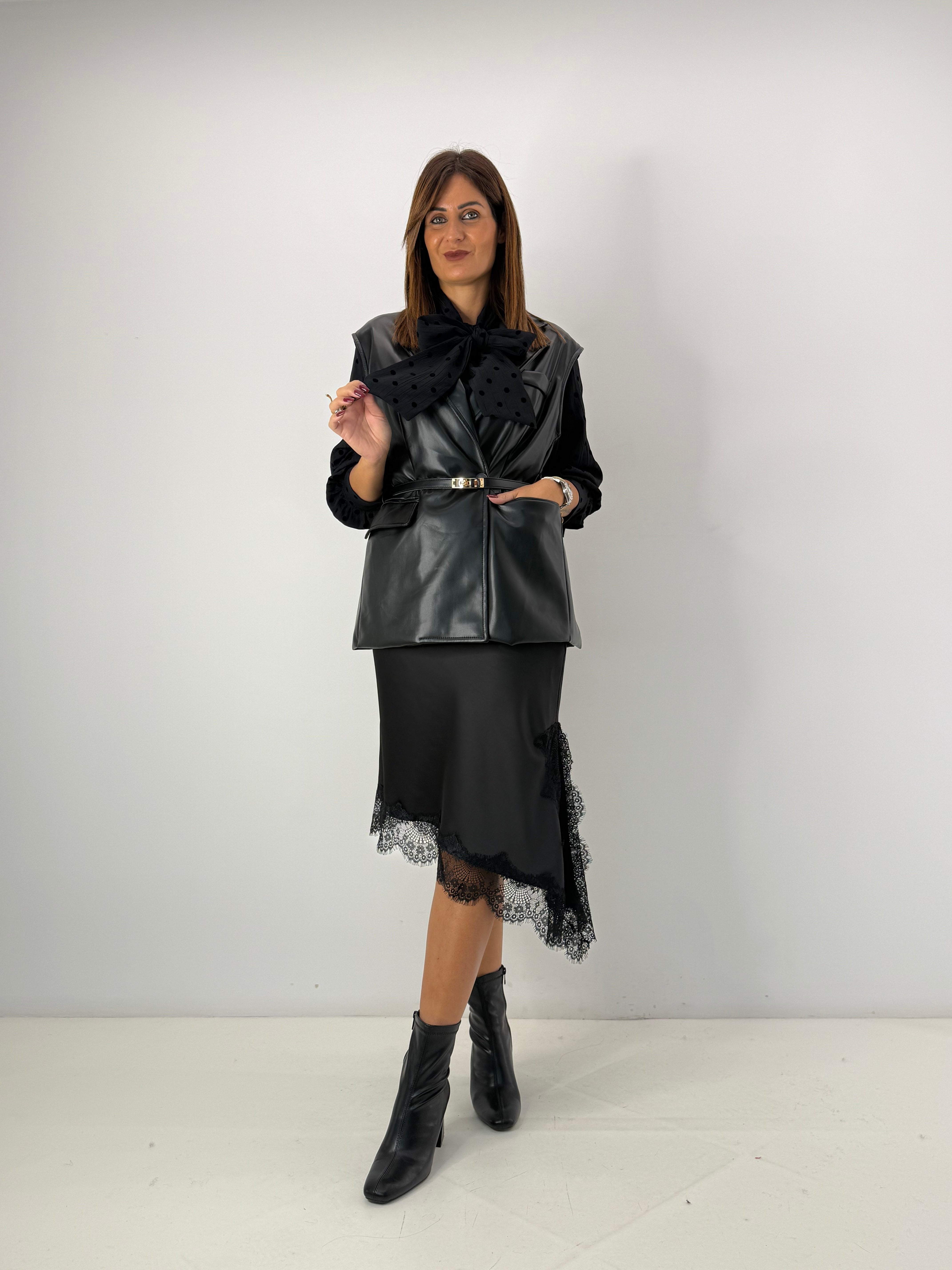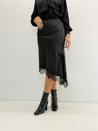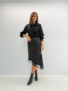 Gonna effetto satin, con elastico in vita dietro, taglio asimmetrico con inserto in pizzo. Vestibilità a taglie S/M -M/L