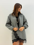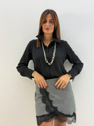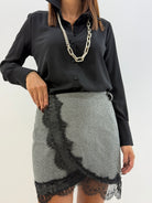 Gonna dritta in tweed , in tessuto spigato grigio, impreziosita da inserti in pizzo nero sul davanti, passanti per cintura, elastico in vita parte dietro, senza chiusure.