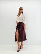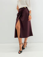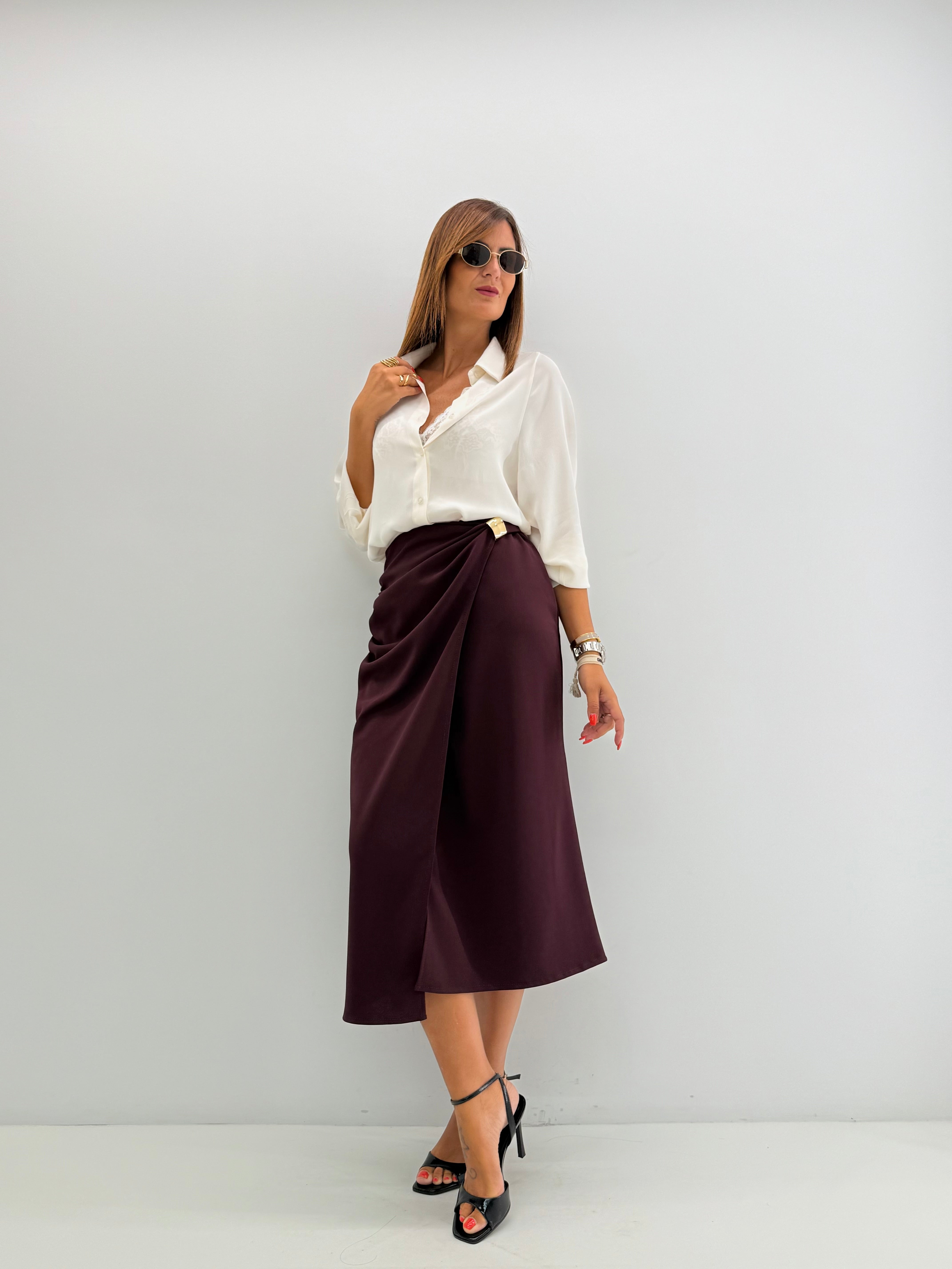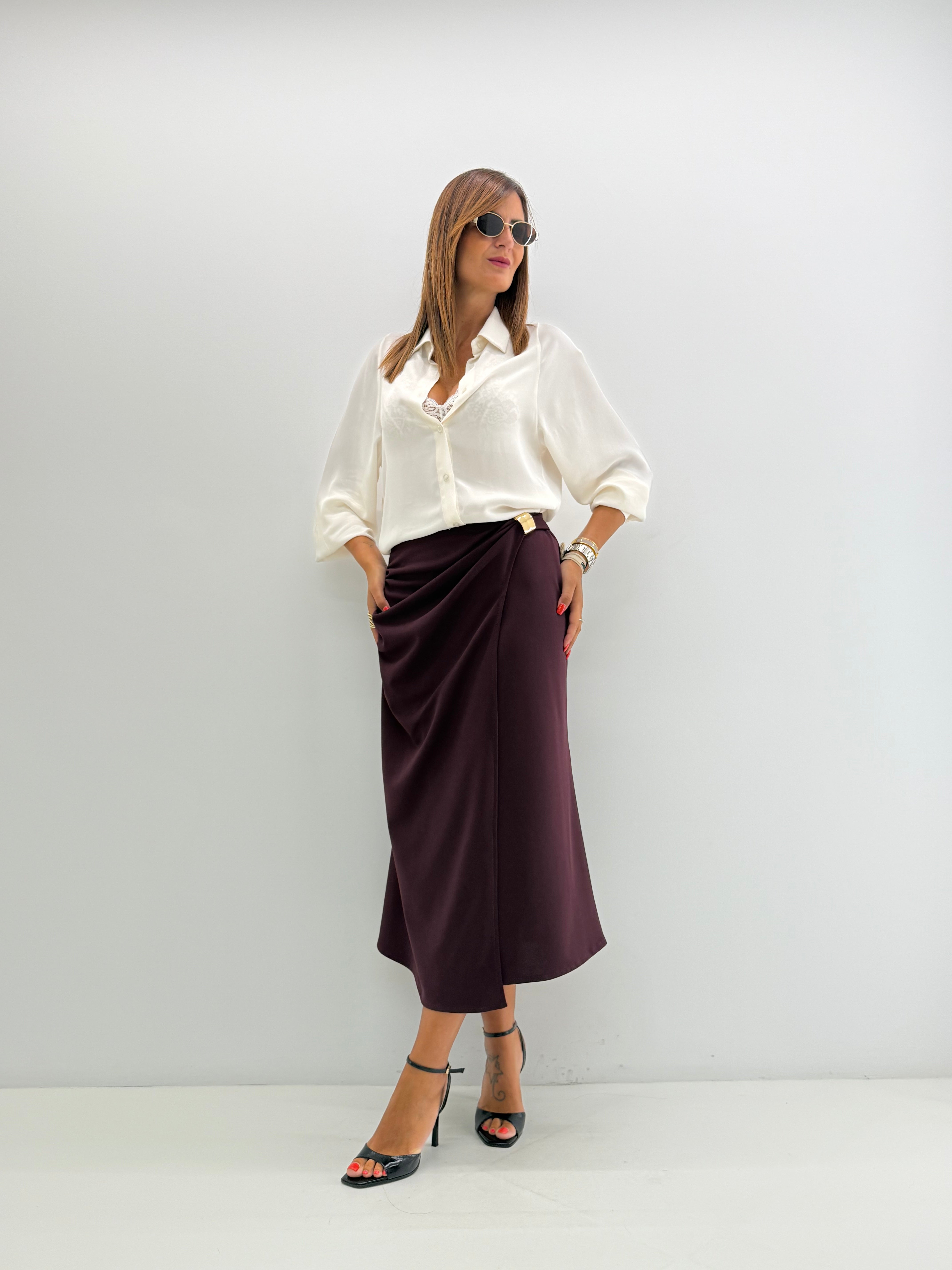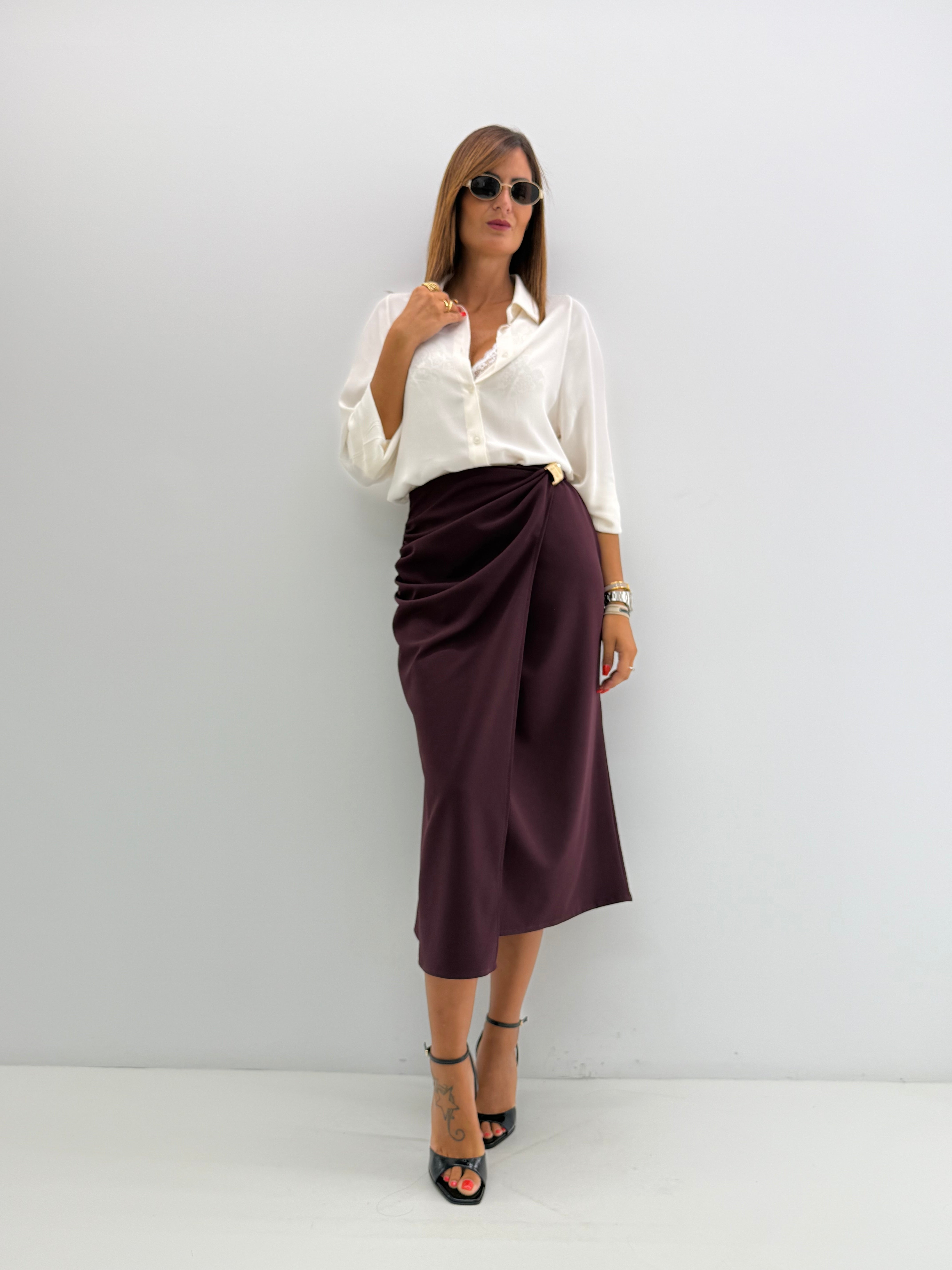 Gonna a portafoglio, spacchetto sul davanti, senza chiusure, elastico in vita, dettaglio metallico gold nella parte sinistra, drappeggio nella parte destra.