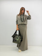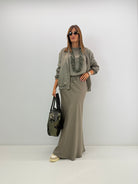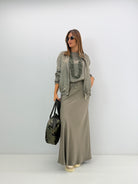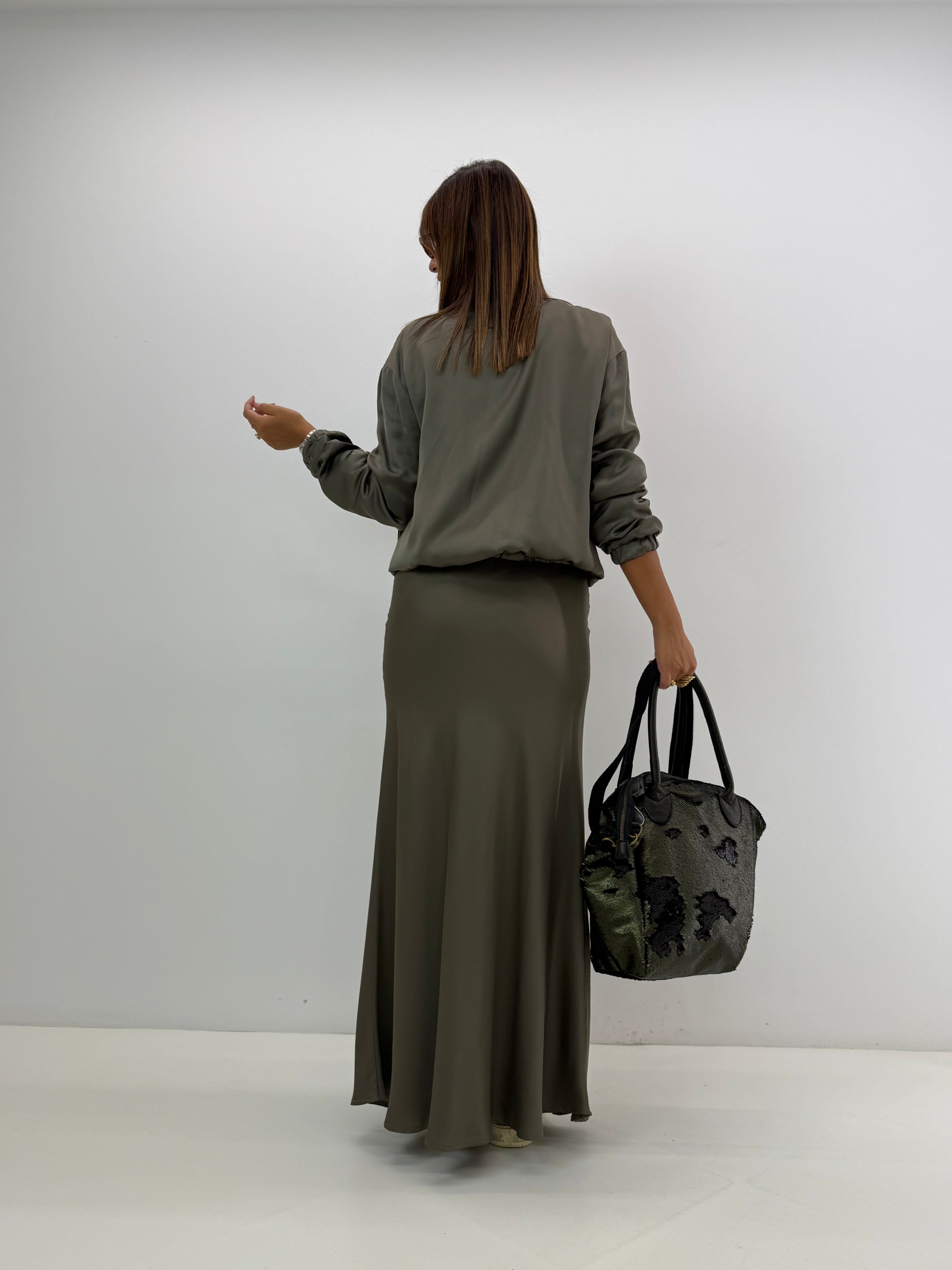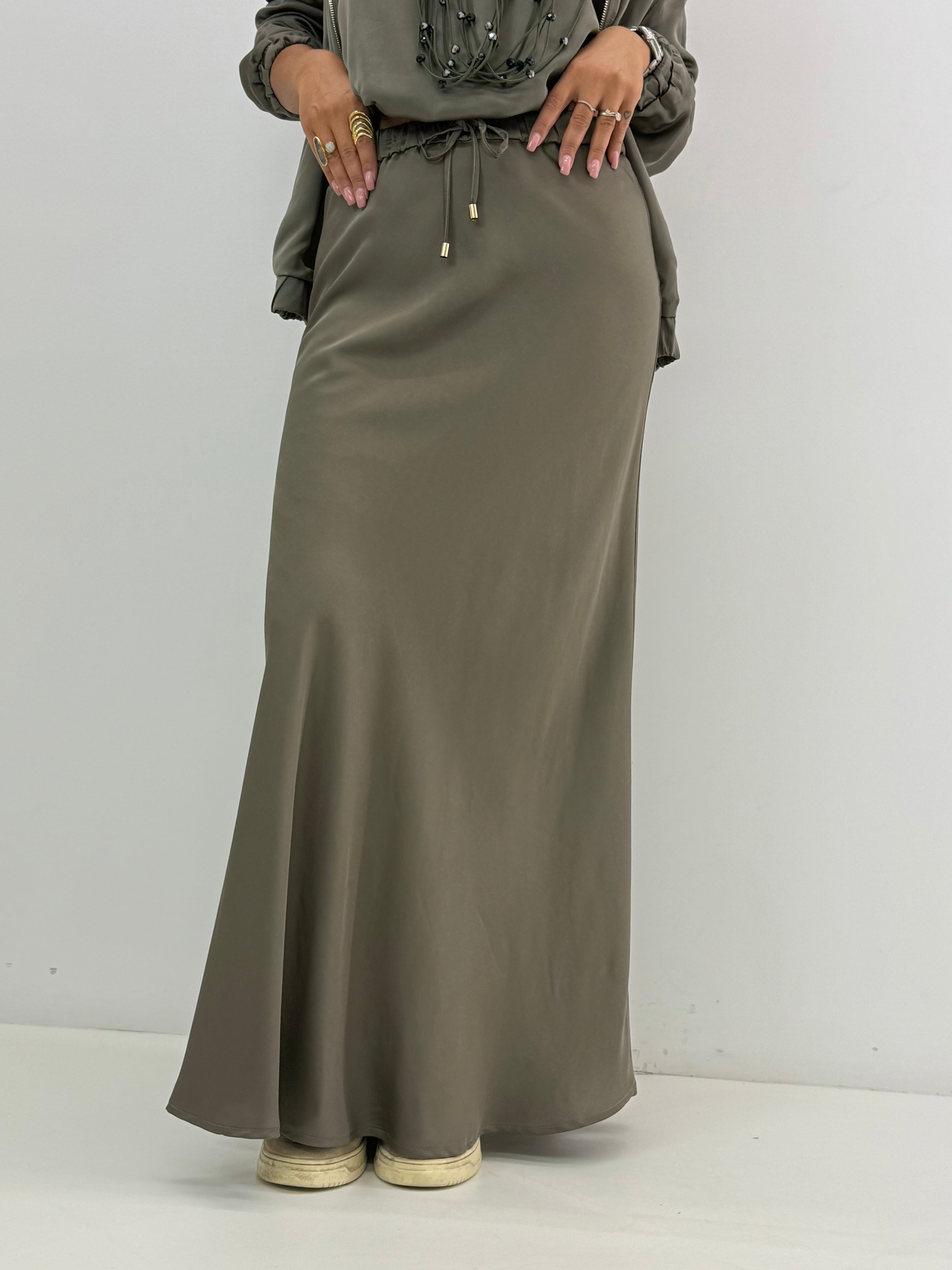 Gonna in satin di viscosa, con elastico in vita e coulisse.