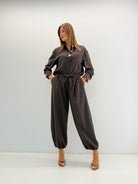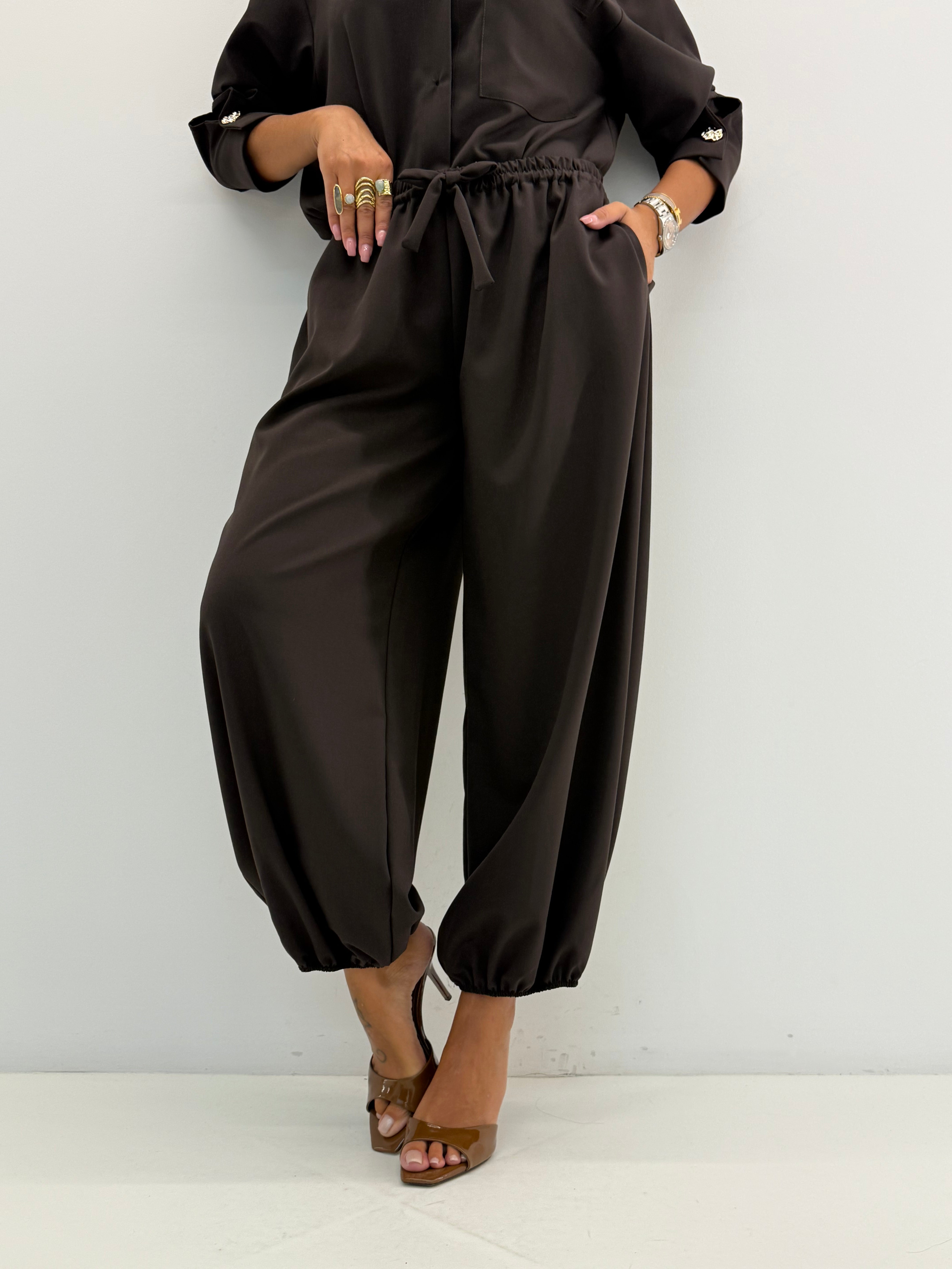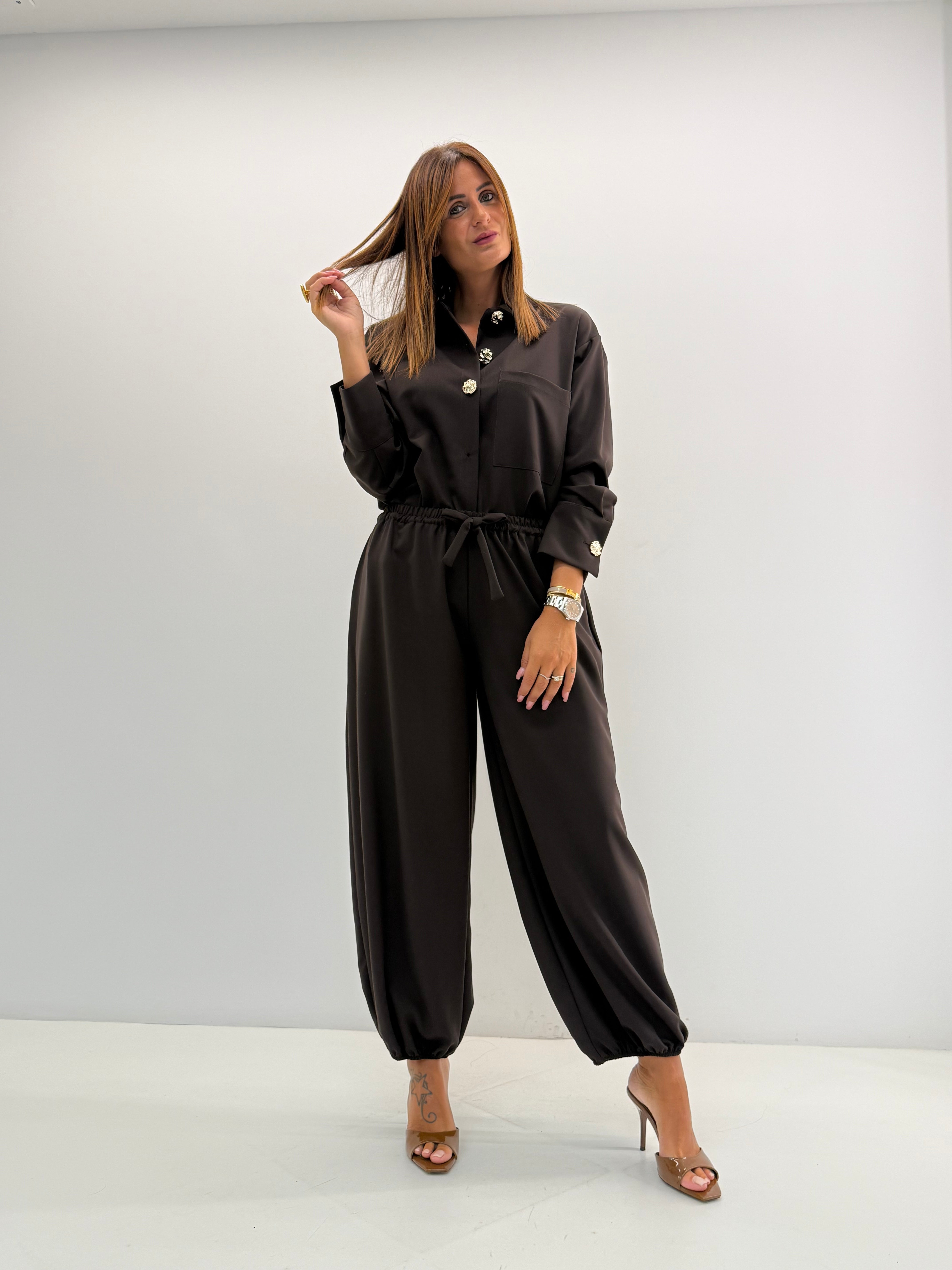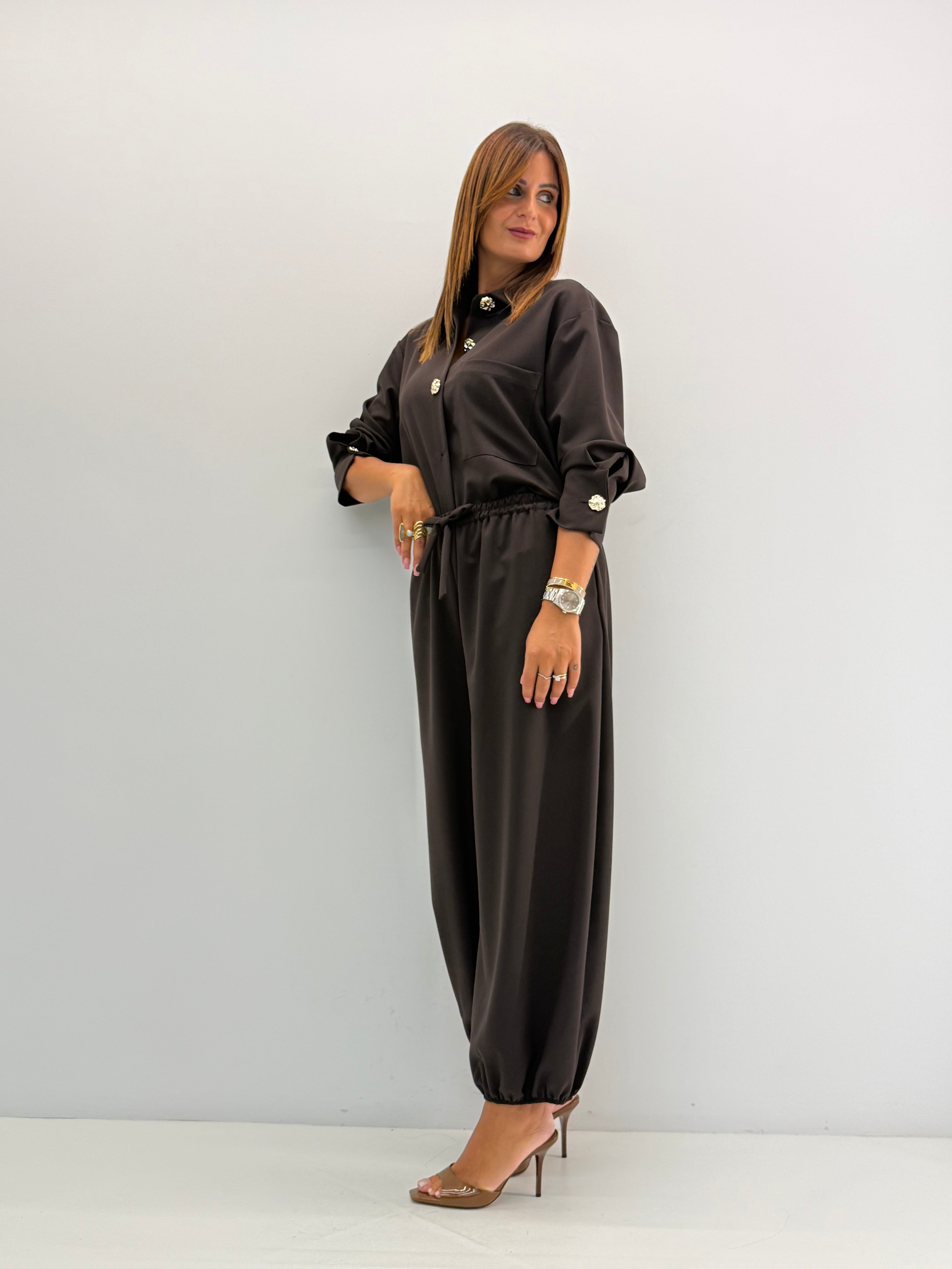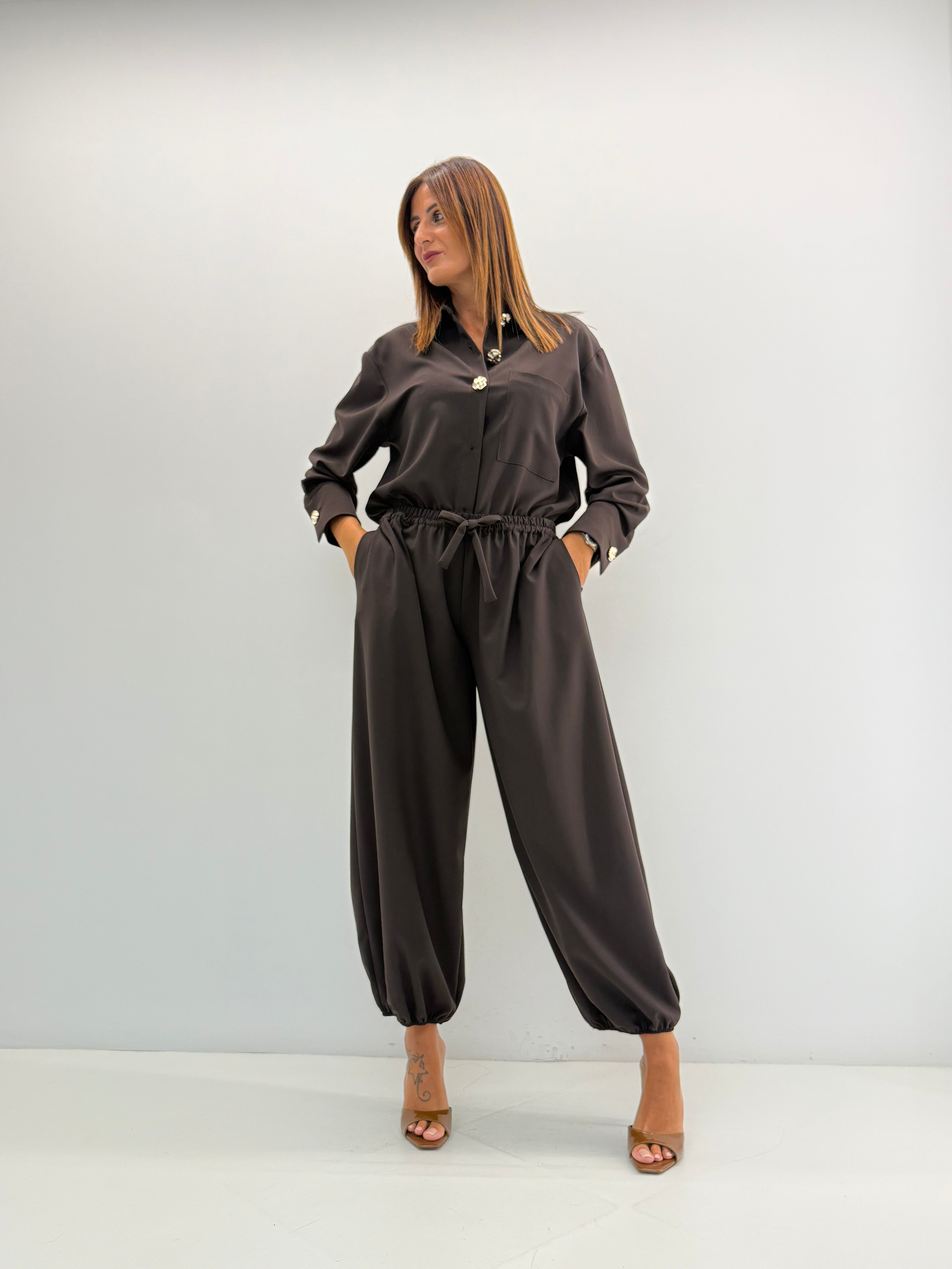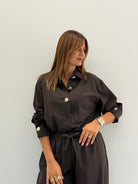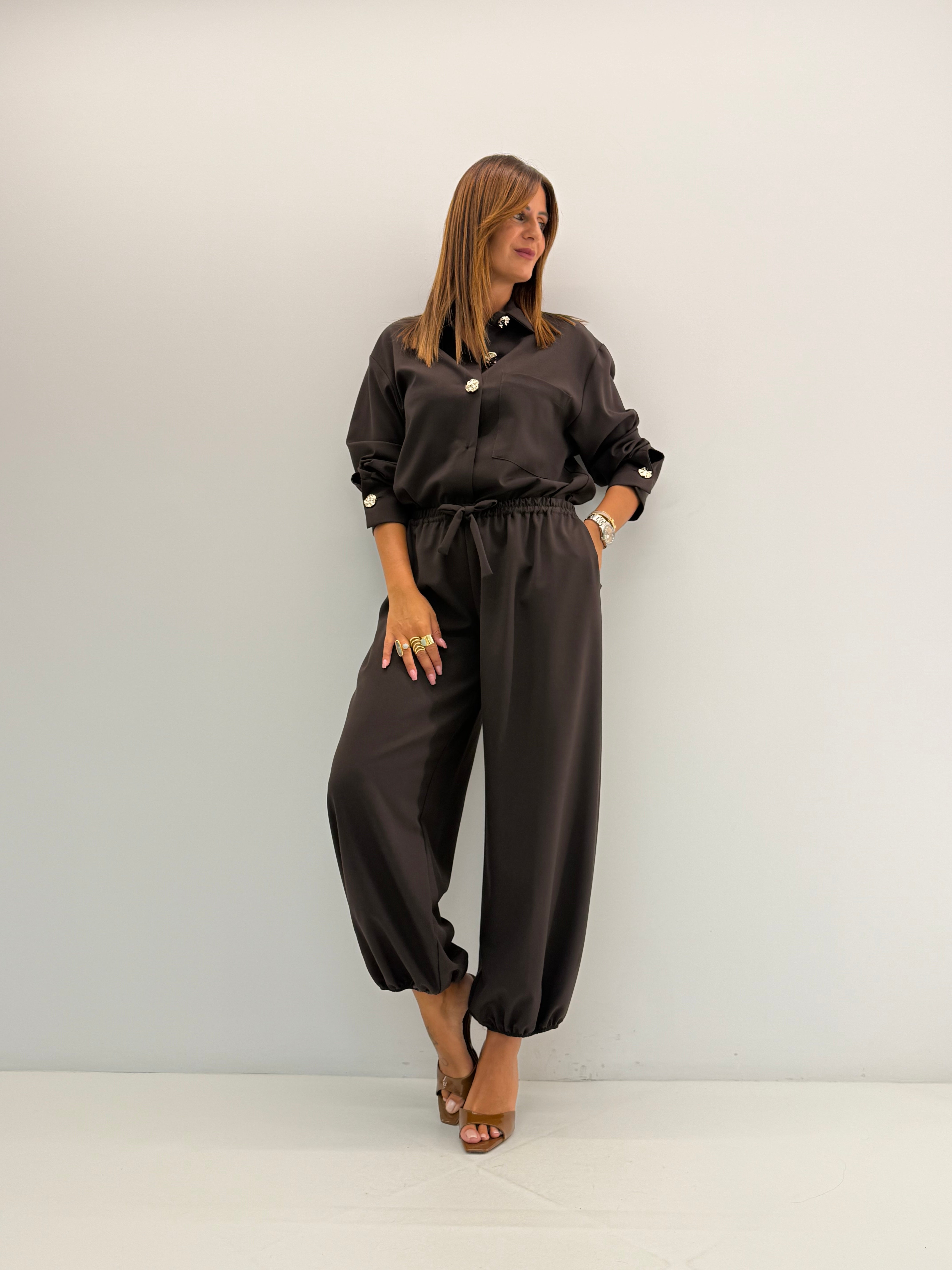 Coordinato composto da 2 pezzi: camicia over, con bottoncini gold. Pantalone con elastico in vita.